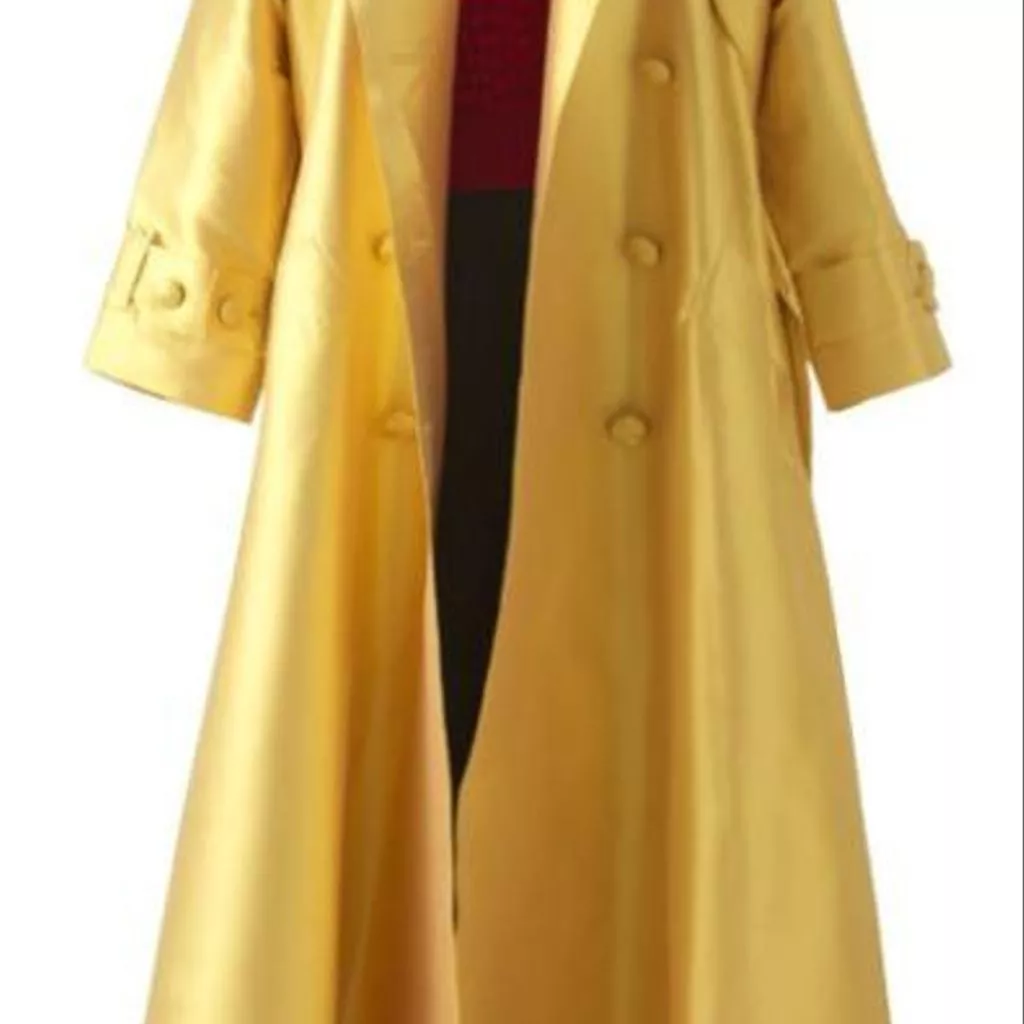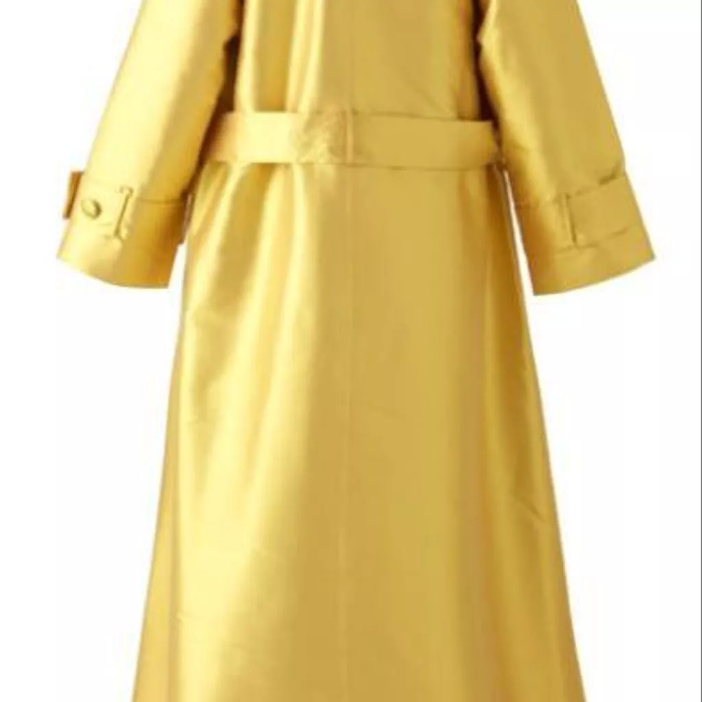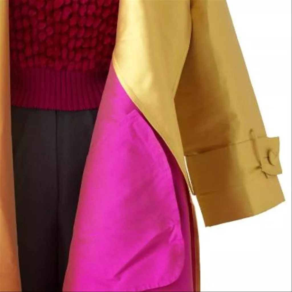 Le Trench est en ziberline double face laquée de Hurel doublée de pongé de Buche. Le pantalon est en gabardine de Guillaud, doublé de pongé de Buche. Le pull à col roulé a été tricoté main en incluant une grosse chenille (fil de soie de Ver à soie).