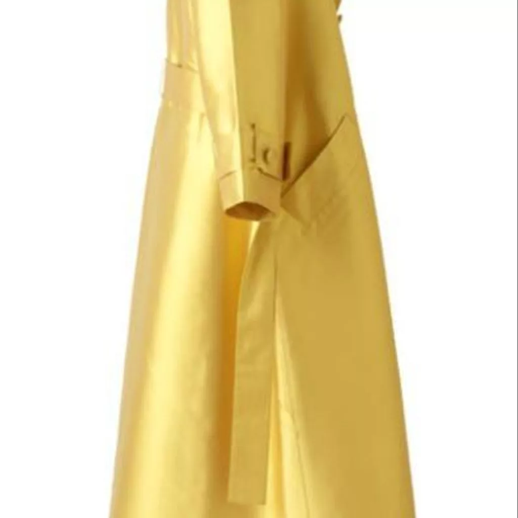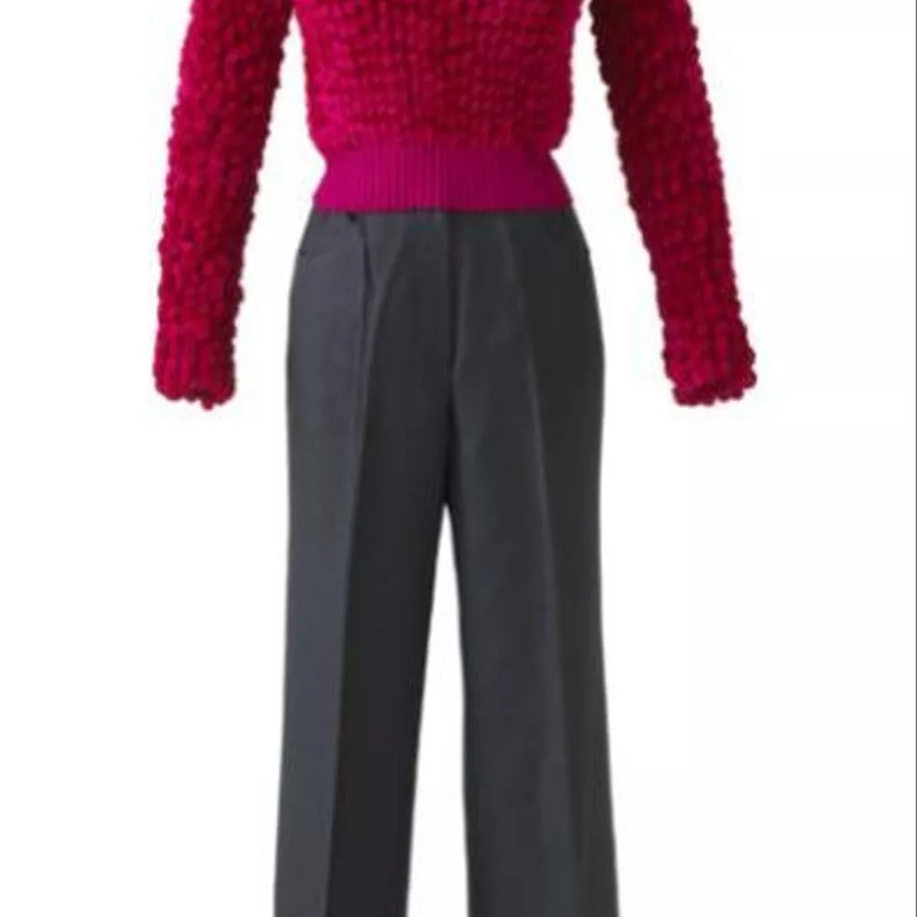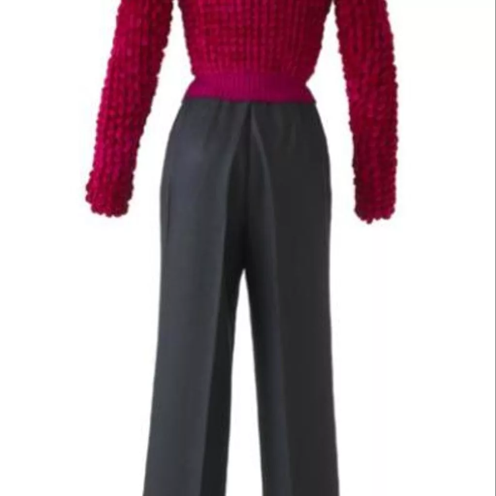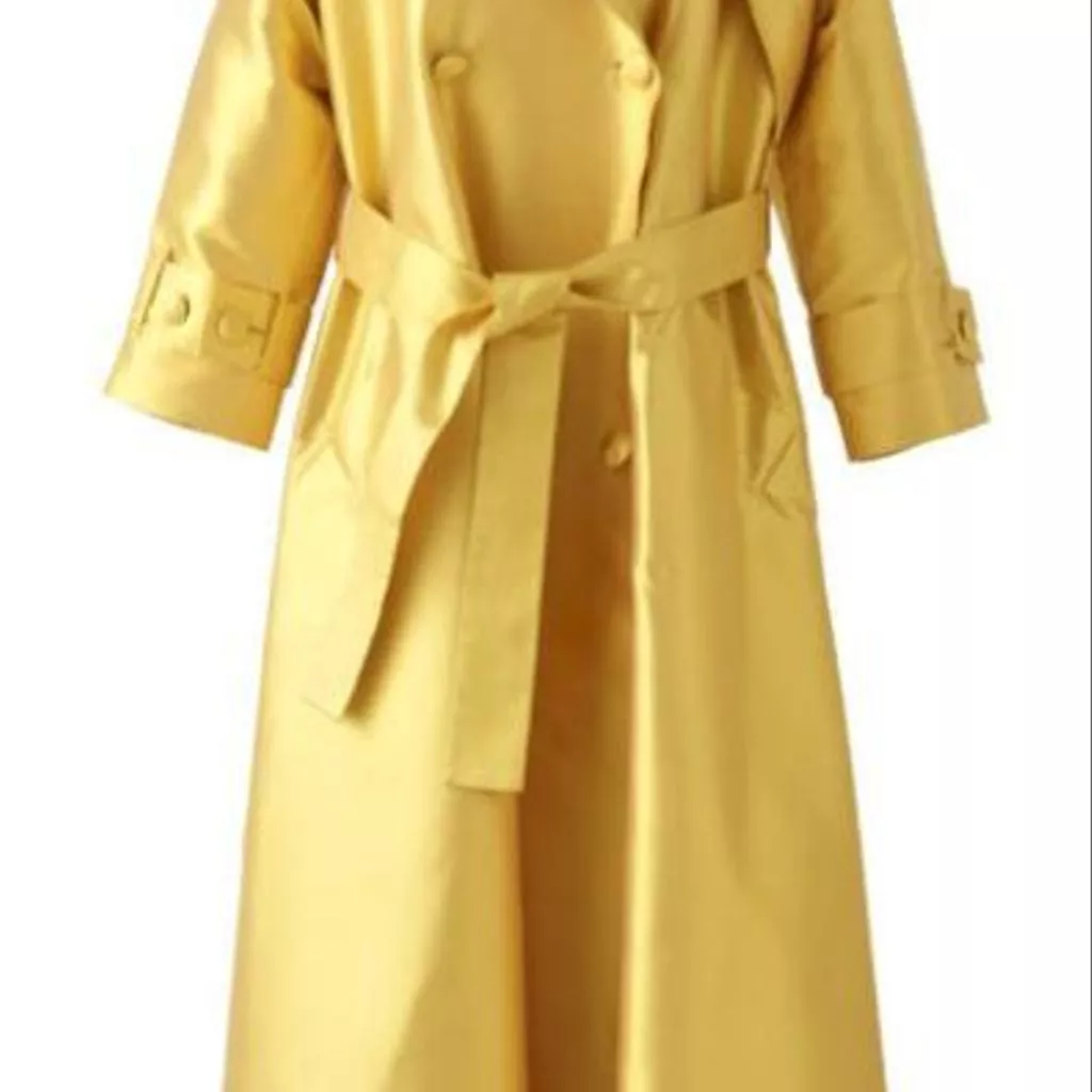 Le Trench est en ziberline double face laquée de Hurel doublée de pongé de Buche. Le pantalon est en gabardine de Guillaud, doublé de pongé de Buche. Le pull à col roulé a été tricoté main en incluant une grosse chenille (fil de soie de Ver à soie).