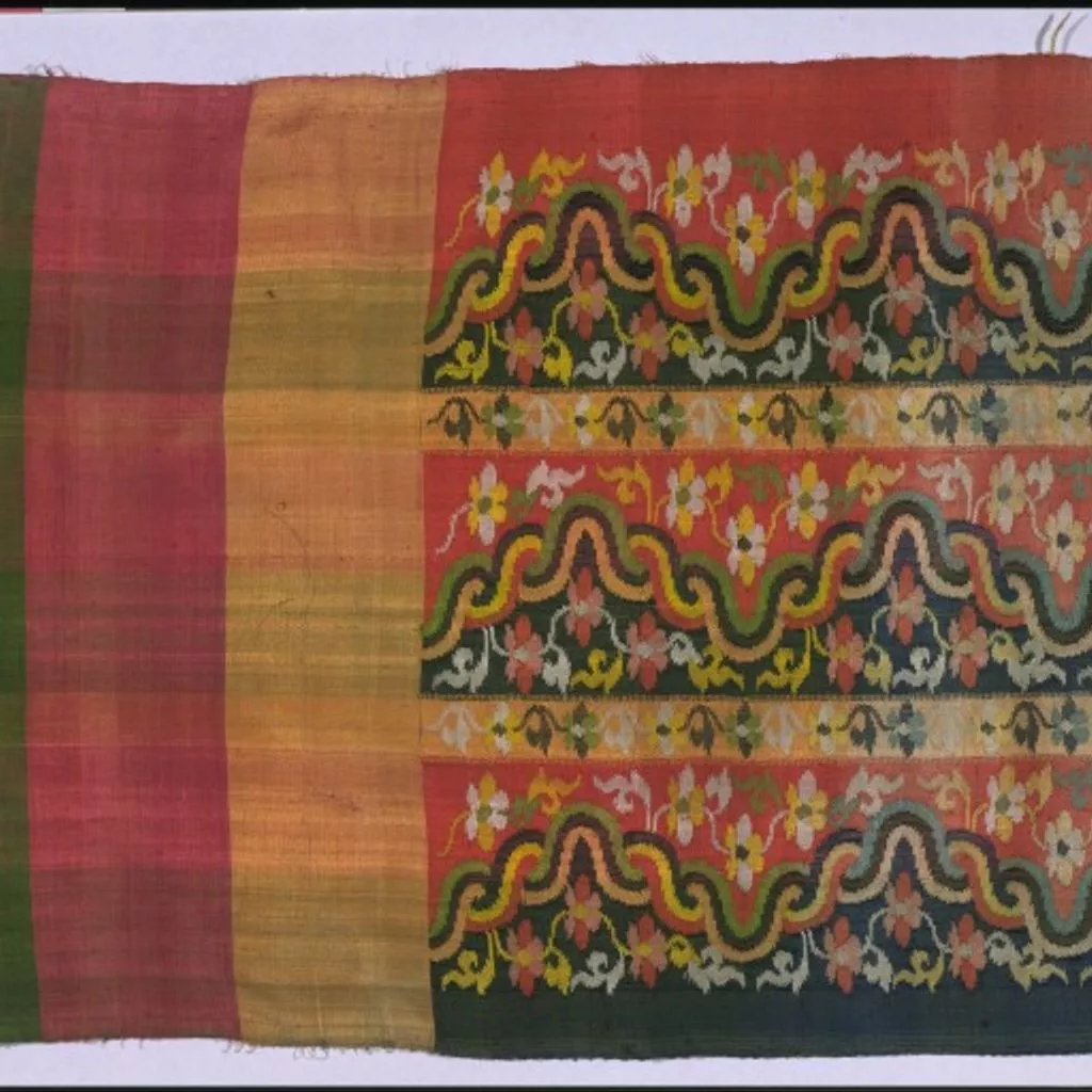 Acheik (horizontal wave patterned) textile breast cloth (Yinzi) or stole (tabet) in silk luntaya tapestry weave, Mandalay, ca. 1885