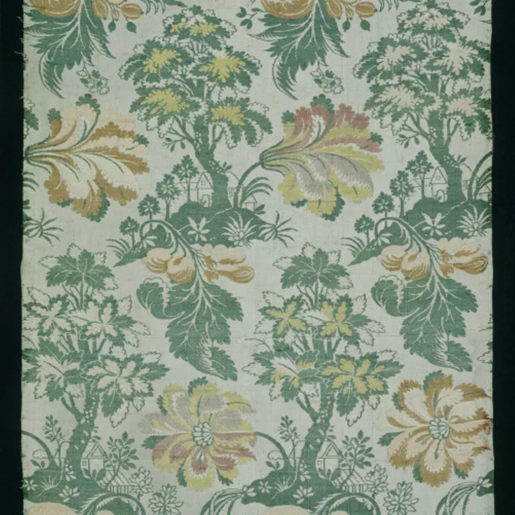 The main colour used for the pattern is green, and was once a yellow toned green that has now faded to blue-green, and the weft is woven into the entire width of the material. Brocaded silks in lime green, magenta, deep lilac, three shades of pink and tan have faded to pale yellow, dull pink, pale lilac, pinkish cream and buff. All the pattern wefts are uniformly bound in 3/1 twill, including the white ground weft which is brought to the surface to fill details in the green and white trees, plants and houses.