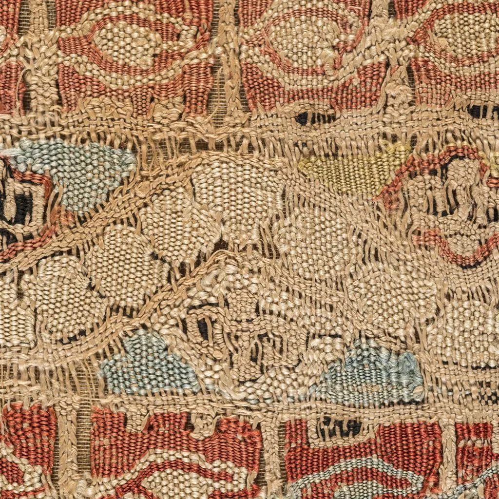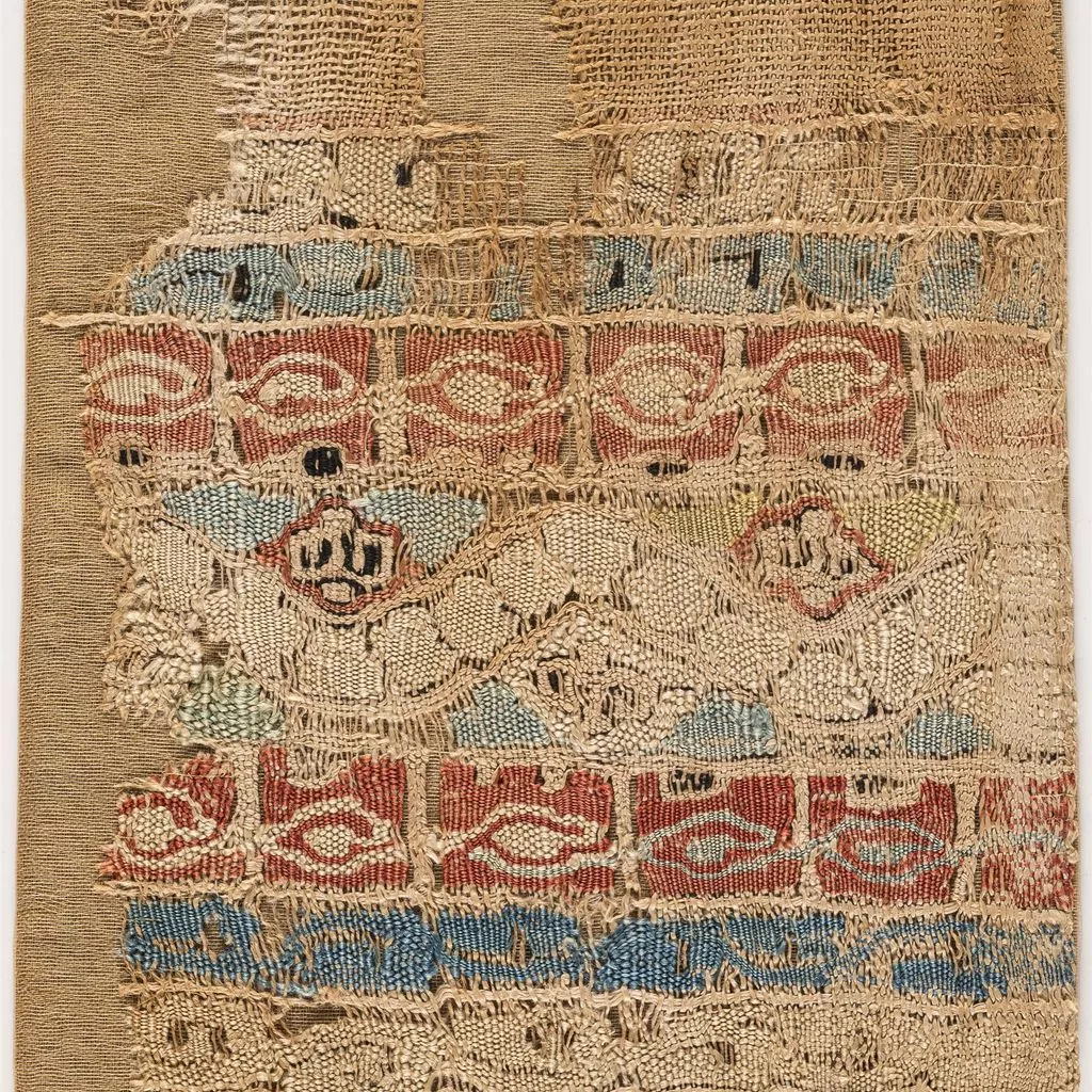 Fragment de tafetà de lli amb bandes decoratives realitzades en tècnica de tapís, amb lli i sedes policromes. ordit : lli, 1/c, irregular, 23 i 19 f/cm - trama decoració: seda, 58 p/cm - trama fons: lli, 1/c, irregular·12 p/cm.