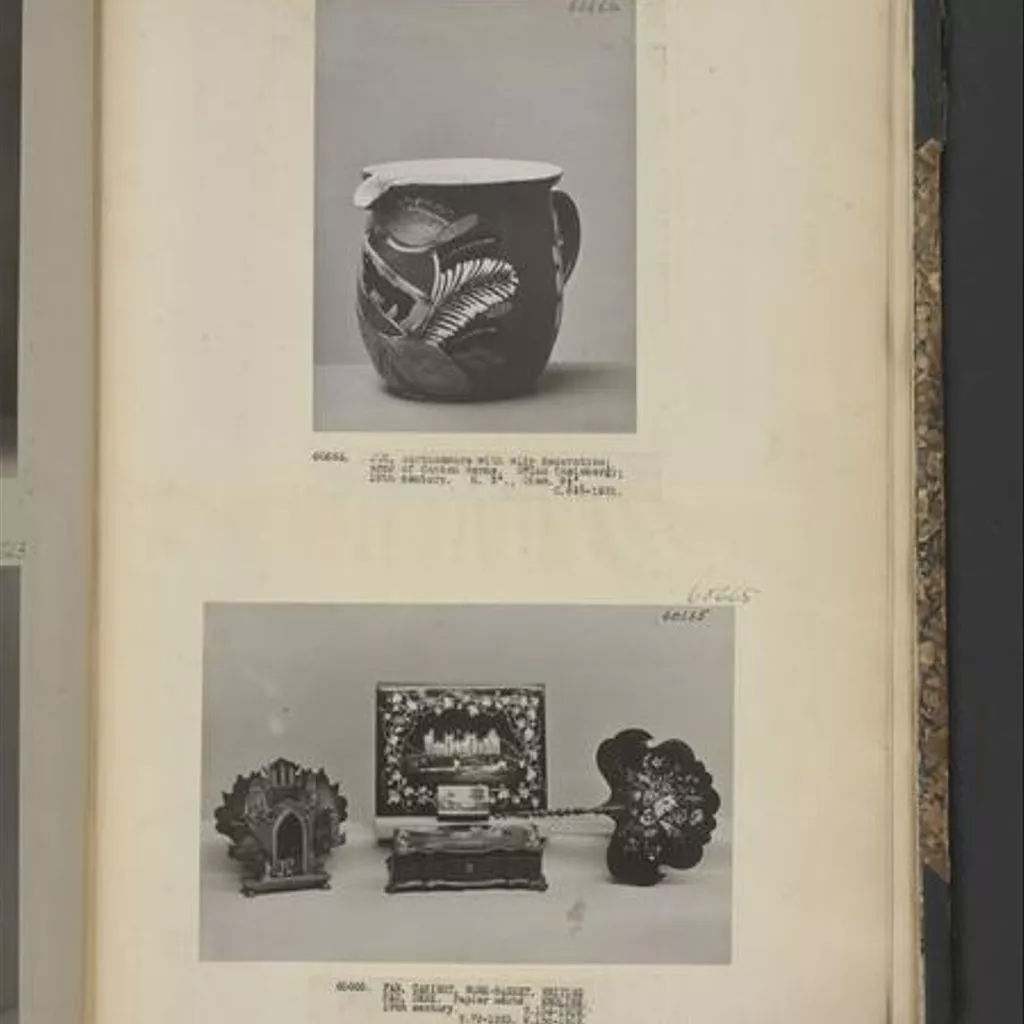 Jennens & Bettridge, whose name is stamped on this work basket, were one of the largest and most prominent firms of papier-mâché manufacturers in Birmingham. In 1815 Theodore Hyla Jennens and John Bettridge took over an existing factory at 99, Constitution Hill and subsequently opened a London showroom at 6 Halkin Street West, Belgrave Square. The firm produced a wide range of papier-mâché goods ranging in size and complexity from small trays and boxes to large pieces of furniture such as beds and pianos, some of which were displayed in their stand at the Great Exhibition of 1851.