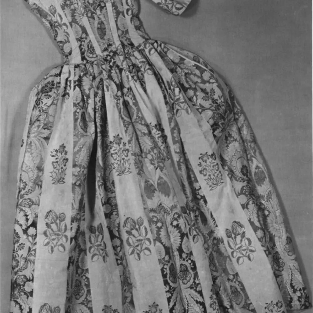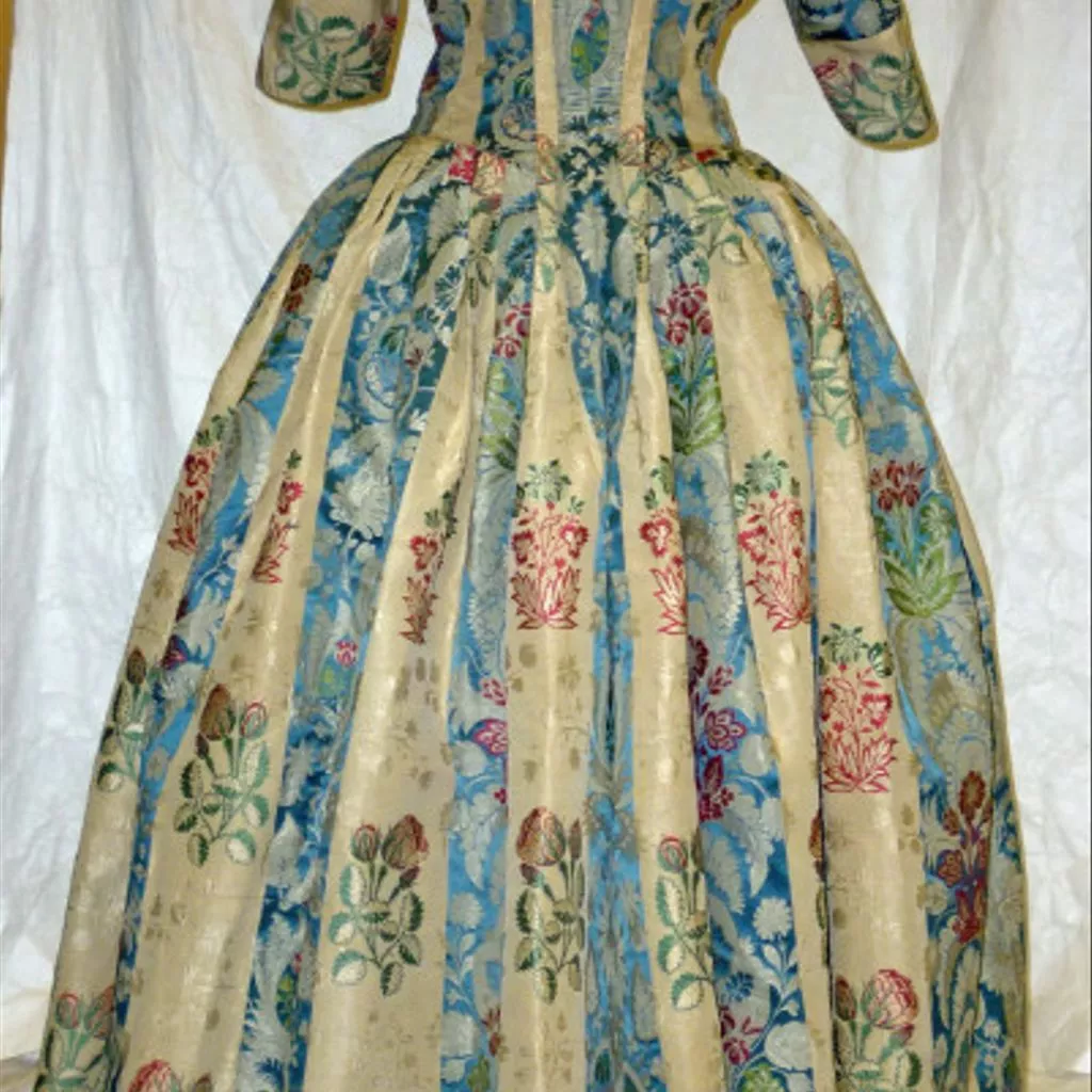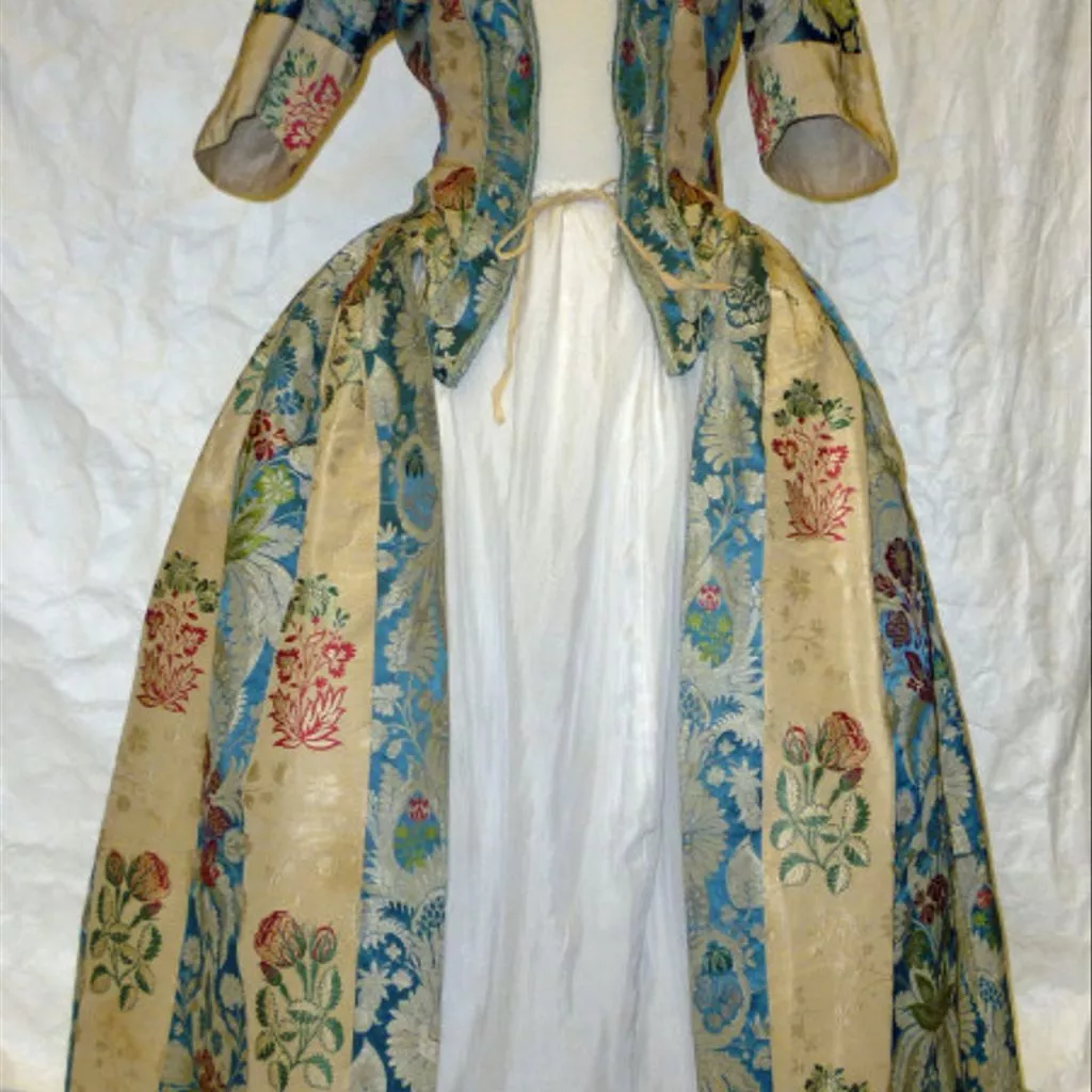 Unique A woman's gown, English, 1770s; blue and cream striped silk, brocaded with floral motifs in green and pink, Spitalfields, 1725-35; altered 1870-1910 A woman's gown of blue and cream silk in broad stripes, brocaded with floral motifs in green and pink. The gown is in the English (tight-back) style, open at the front with robings to the waist and elbow length sleeves. The bodice and sleeves are lined with different qualities of linen. The pleats at the back are stitched down. The waist seam extends from the centre back pleats to the front openings. The gown is made of 6 widths of silk; the skirts are flat pleated into the waist seam. The gown was probably first made in the 1730s and then altered in the early 1770s, possibly for fit as well as style. Piecing at the back neck suggests a taller wearer; the bodice was probably relined. It may originally have been a closed gown and the centre front panel removed, the robings shortened and the skirts reconfigured at the sides for a smaller hoop. All sleeve trimmings were removed. The light blue woven gimp lace (braid) around the edges of the robings were probably added at this time. In the late 19th century, the gown was altered for fancy dress. Darts were sewn into each bodice front, the robings boned and a casing with drawstring added to the back neck.