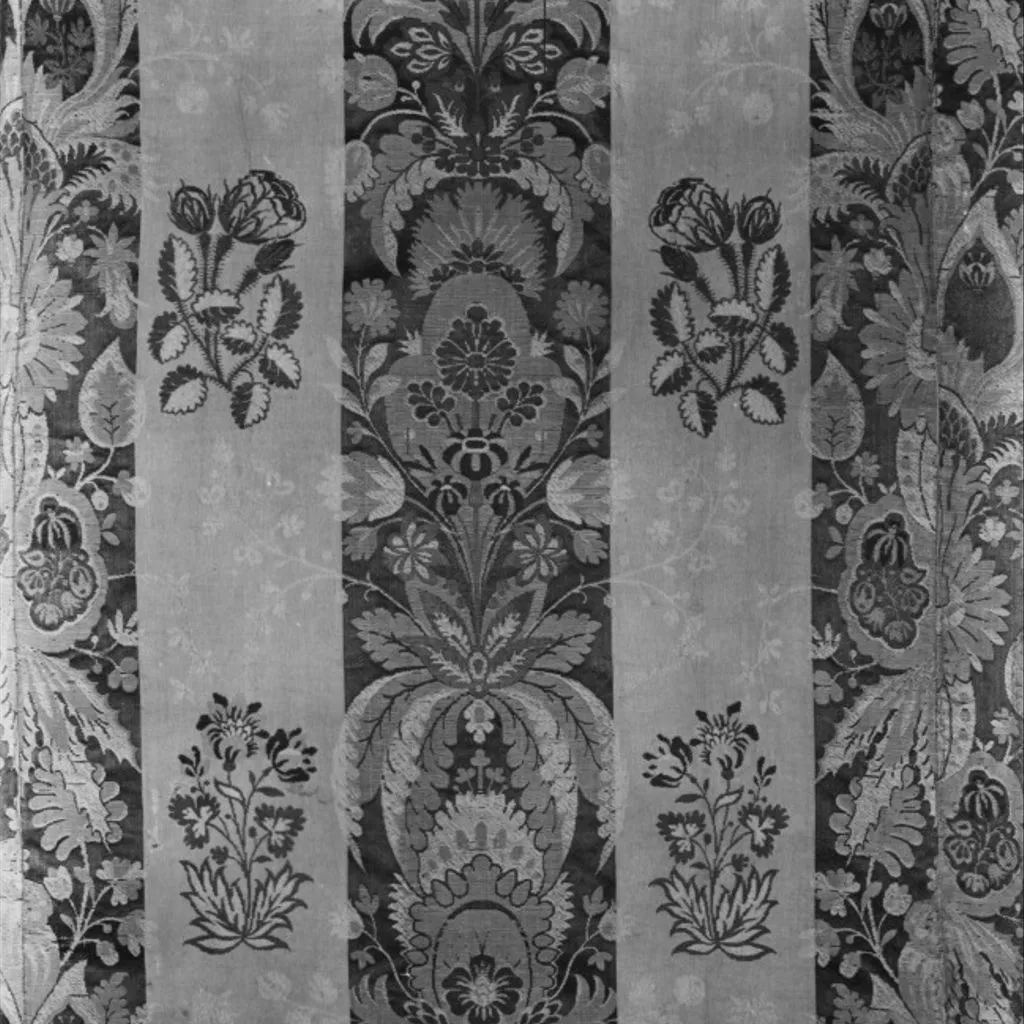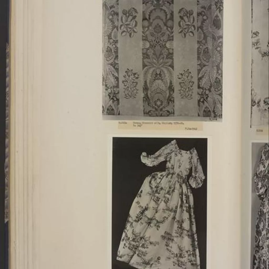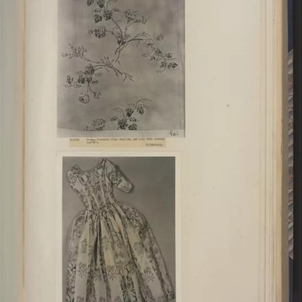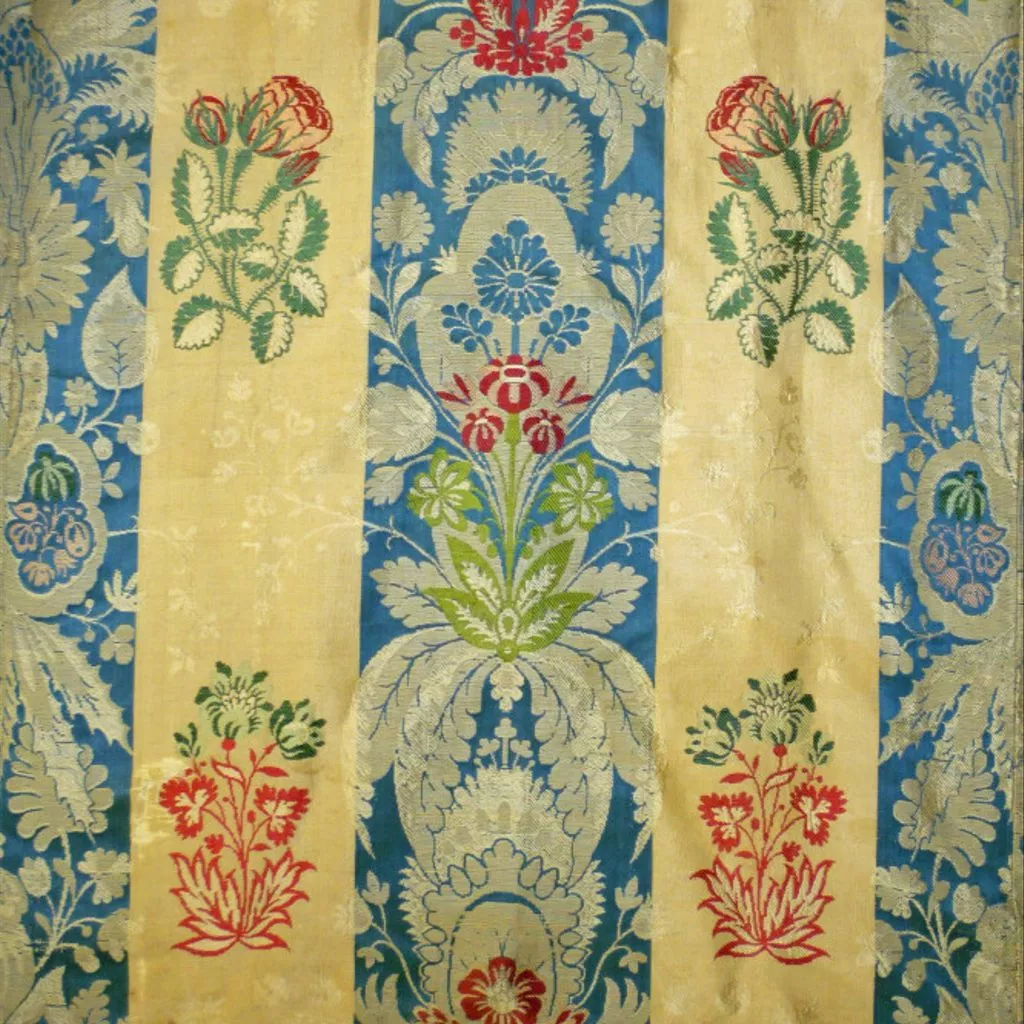 Unique A woman's gown, English, 1770s; blue and cream striped silk, brocaded with floral motifs in green and pink, Spitalfields, 1725-35; altered 1870-1910 A woman's gown of blue and cream silk in broad stripes, brocaded with floral motifs in green and pink. The gown is in the English (tight-back) style, open at the front with robings to the waist and elbow length sleeves. The bodice and sleeves are lined with different qualities of linen. The pleats at the back are stitched down. The waist seam extends from the centre back pleats to the front openings. The gown is made of 6 widths of silk; the skirts are flat pleated into the waist seam. The gown was probably first made in the 1730s and then altered in the early 1770s, possibly for fit as well as style. Piecing at the back neck suggests a taller wearer; the bodice was probably relined. It may originally have been a closed gown and the centre front panel removed, the robings shortened and the skirts reconfigured at the sides for a smaller hoop. All sleeve trimmings were removed. The light blue woven gimp lace (braid) around the edges of the robings were probably added at this time. In the late 19th century, the gown was altered for fancy dress. Darts were sewn into each bodice front, the robings boned and a casing with drawstring added to the back neck.