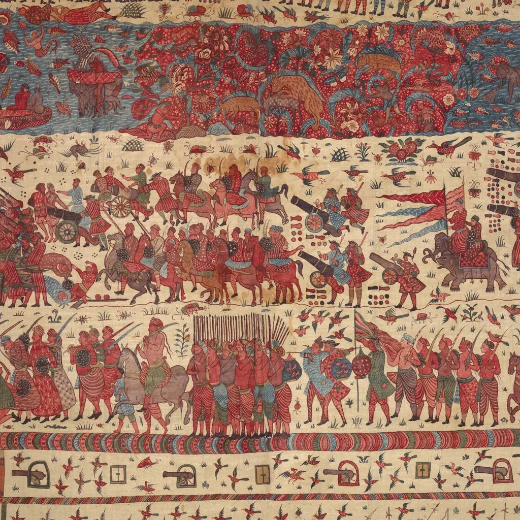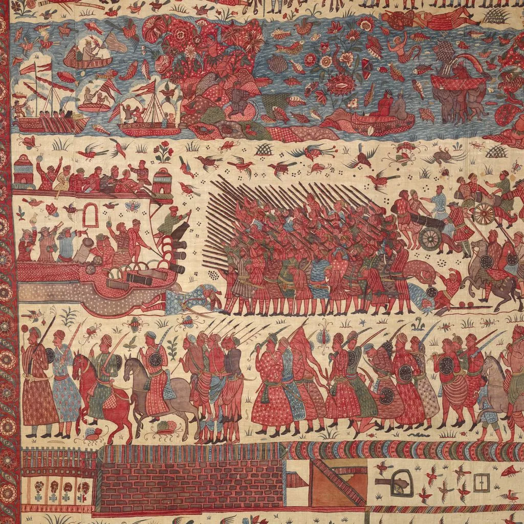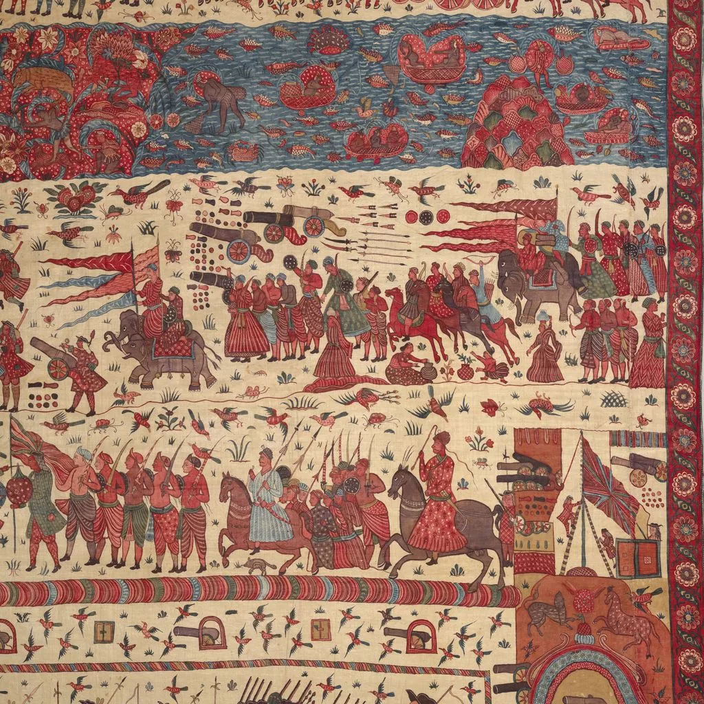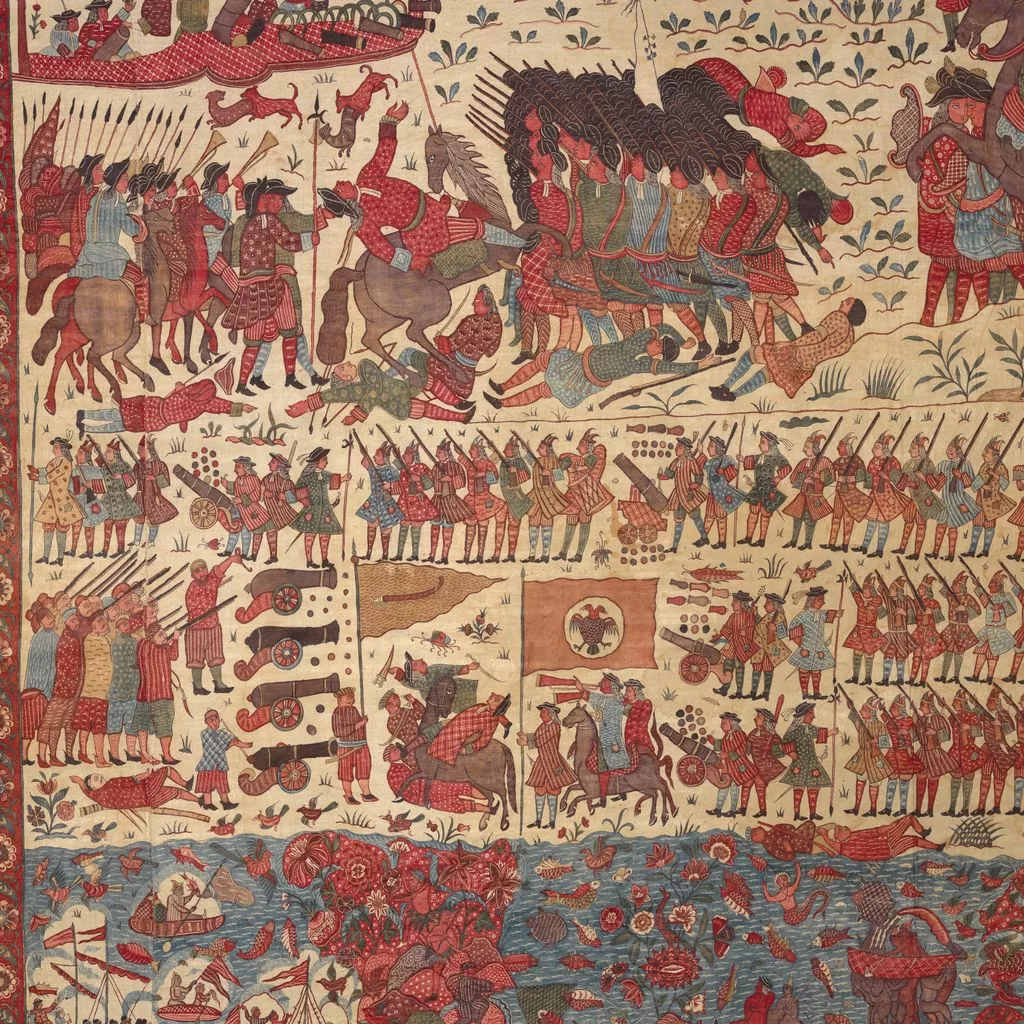 This multilayered tableau of a battle is the most spectacular, complex, and complete surviving example of a rare chintz history painting. The hanging may celebrate the successful 1760–61 English siege of Pondicherry, on the southeast coast of India, headquarters of the French East India Company. The English forces (under a stylized Union Jack) are shown fighting alongside allied local soldiers. Indian regiments appear to be distinguished by dress—Muslims with long gowns and bushy beards, the Hindus in skirt cloths—indicative of the complex web of regional alliances forged by the European trading companies. Two ships (upper register, center) flying a simplified version of the triple fleur-de-lis and crown, the insignia of the French East India Company flag from 1756, represent the defeated French.