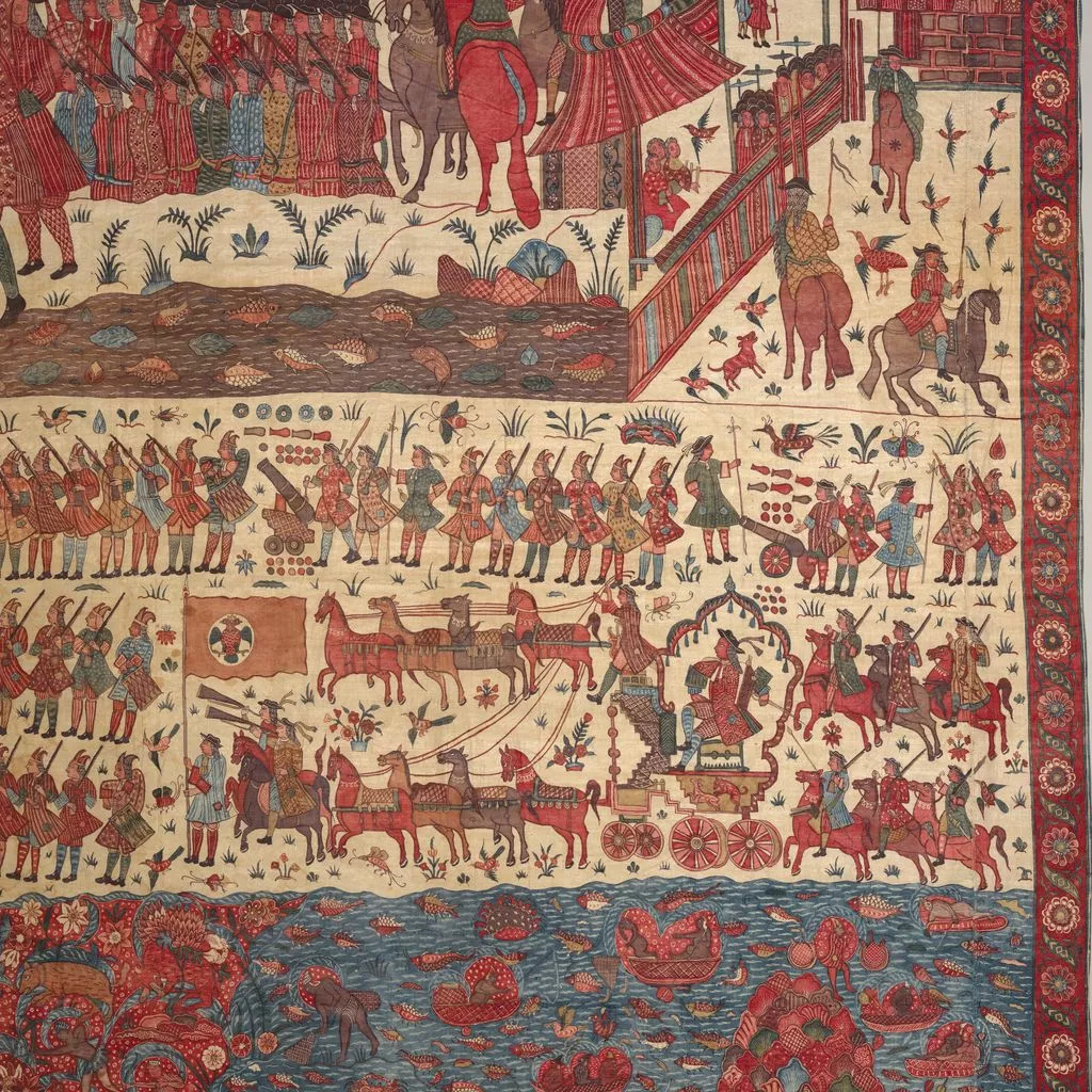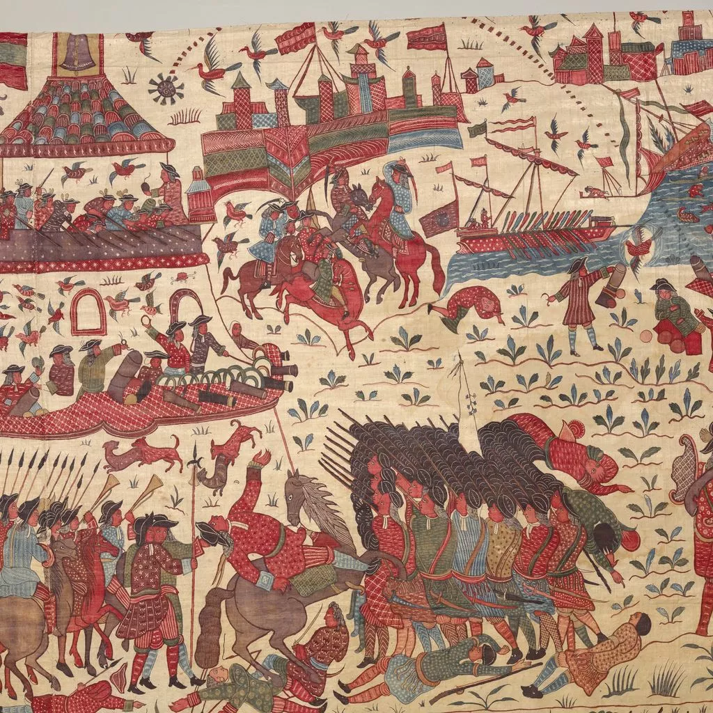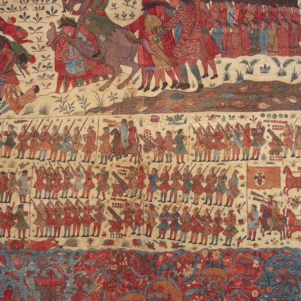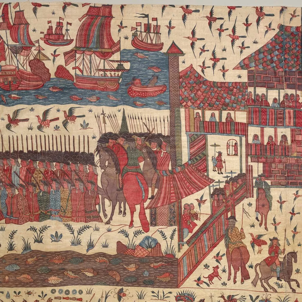 This multilayered tableau of a battle is the most spectacular, complex, and complete surviving example of a rare chintz history painting. The hanging may celebrate the successful 1760–61 English siege of Pondicherry, on the southeast coast of India, headquarters of the French East India Company. The English forces (under a stylized Union Jack) are shown fighting alongside allied local soldiers. Indian regiments appear to be distinguished by dress—Muslims with long gowns and bushy beards, the Hindus in skirt cloths—indicative of the complex web of regional alliances forged by the European trading companies. Two ships (upper register, center) flying a simplified version of the triple fleur-de-lis and crown, the insignia of the French East India Company flag from 1756, represent the defeated French.