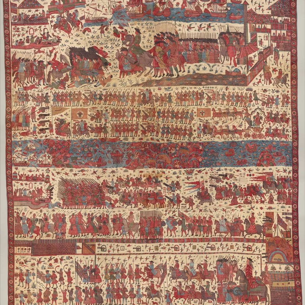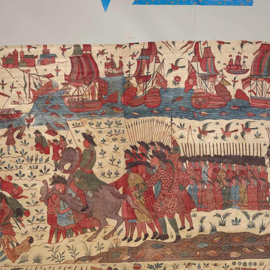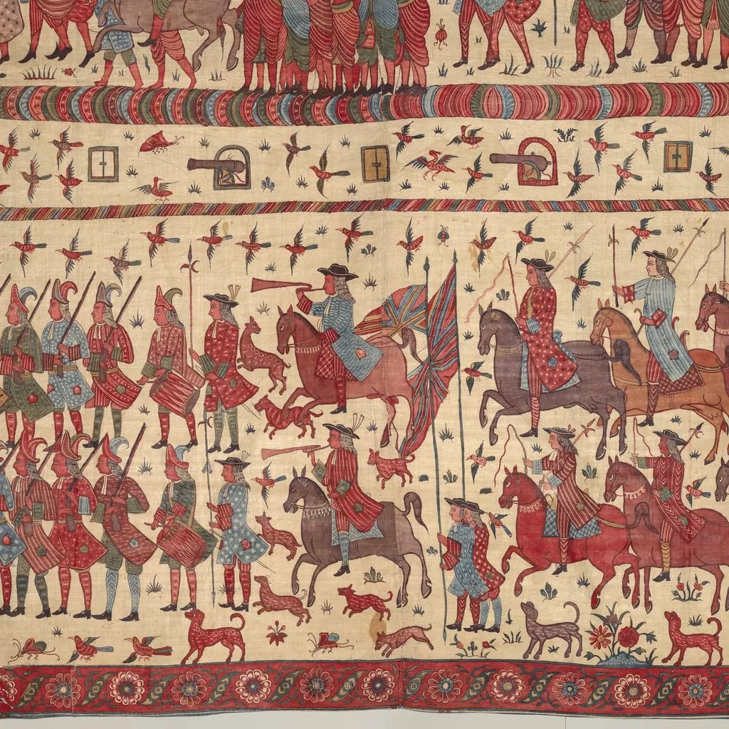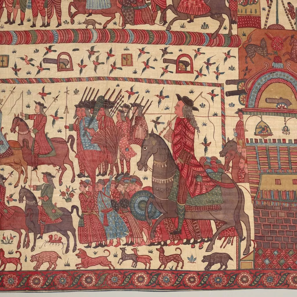 This multilayered tableau of a battle is the most spectacular, complex, and complete surviving example of a rare chintz history painting. The hanging may celebrate the successful 1760–61 English siege of Pondicherry, on the southeast coast of India, headquarters of the French East India Company. The English forces (under a stylized Union Jack) are shown fighting alongside allied local soldiers. Indian regiments appear to be distinguished by dress—Muslims with long gowns and bushy beards, the Hindus in skirt cloths—indicative of the complex web of regional alliances forged by the European trading companies. Two ships (upper register, center) flying a simplified version of the triple fleur-de-lis and crown, the insignia of the French East India Company flag from 1756, represent the defeated French.
