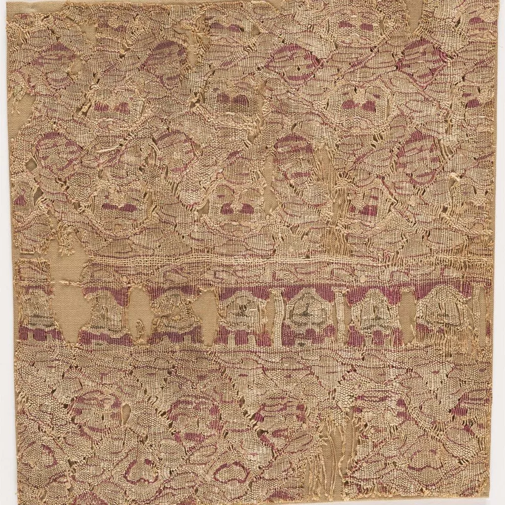 Fragment de decoració, realitzat en tècnica de tapís, amb lli i sedes policromes. - ordit : lli, 1/c, irregular - trama : seda, 46 p/cm trama : lli, 1/c