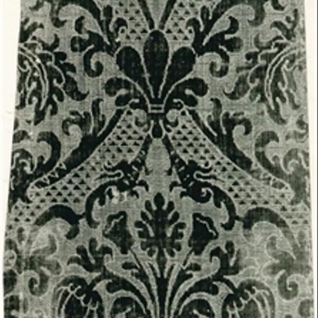 Velluto operato ad un corpo, tagliato e riccio, in seta verde su fondo in taffetas prodotto da un ordito di fondo in verde scuro e una trama di fondo in seta gialla