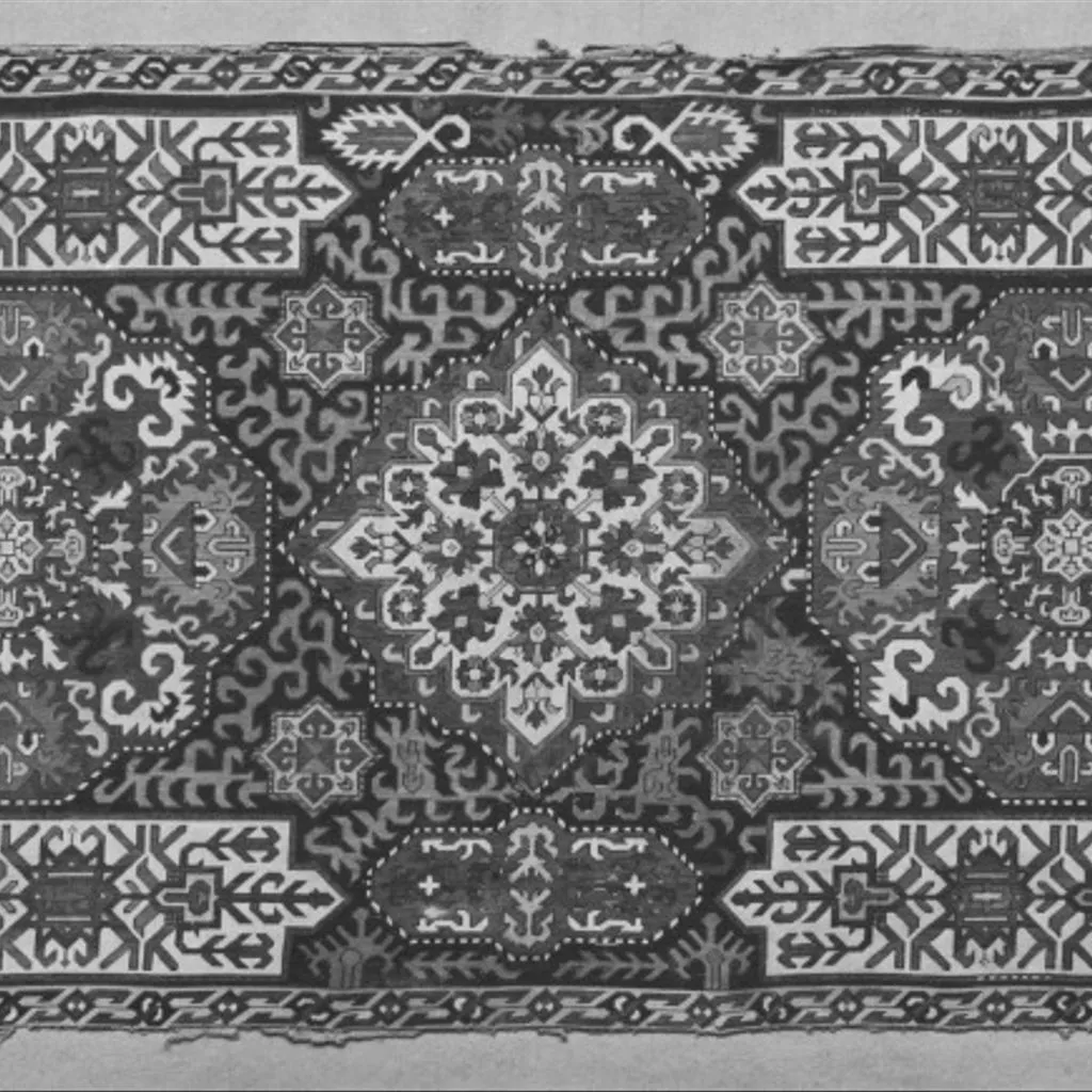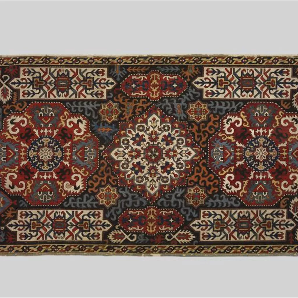 Middle East, Textile; Panel, silk-embroidered cotton, design of star-medallions and border cartouches on black ground, Azerbaijan or NW Iran, 1700-1800 This cover is an example of embroidery from Azerbaijan. It dates from the late 17th century. At that time Azerbaijan was larger than the modern republic. It reached further to the south and the west, with Tabriz as its main town. Technically embroideries from Azerbaijan fall into three groups. This piece, worked in cross stitch, is an example of the earliest. Until recently textile historians thought that these embroidered designs were copied from hand-knotted carpets. However, we now think that the carpet-weaving industry took its inspiration from these embroideries and not the other way round. Possibly the front panel for a large cushion; cotton embroidered with coloured silks in cross stitch. The centre is occupied with three star-shaped compartments filled with conventional serrated floral designs; round these are long irregularly shaped compartments with similar designs. The whole is surrounded by a narrow border. The ground is black, filled with serrated hook-shaped devices in colours; in three of the corners are conventional trees.