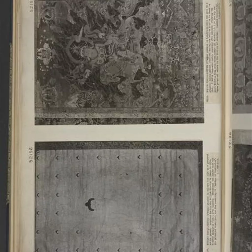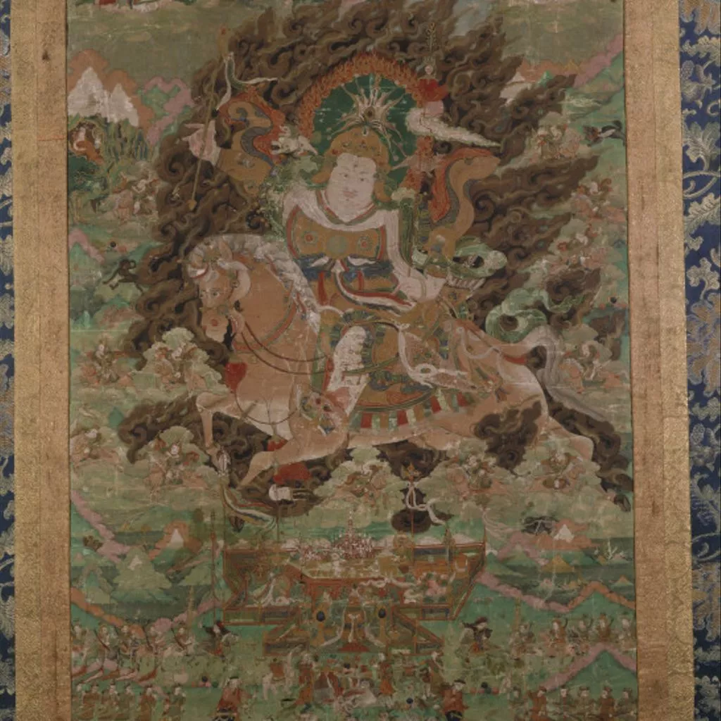 Hanging temple painting showing the central figure probably represents the great king of Tibet Sron,btsan.sgampo (fl.629-650 AD)), in later times considered an incarnation of Avolokita, the Patron of Tibet; he bears the sword-trident, a combination of the symbols of Simhanada-Avolokitesvara. Below him is an altar with various offerings, among which appear certain of "the seven world-ravishing gems", "the eight glorious emblems," and the whole of the "seven gems" (Sanskrit, Saptaratani, Tibetan, Rinc'en.sna.bdun). Smaller figures of harsemen, animals a she-devil, and a Buddhist monk in a mountain cave fill the outlying space. At the top are the seated figures , from left to right, of Guru Patmasambhava (Padma.'byun,gnas); Tson.k'apa (b.1355: b.1417); and a Lama in Indian costume (? Atisa b.980-; arr. in Tibet 1038: d. 1052 AD.).