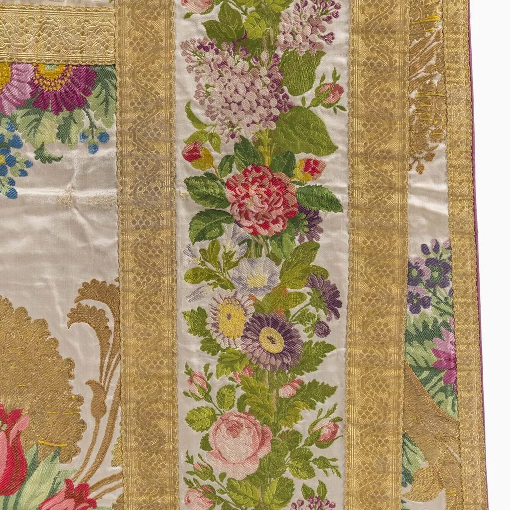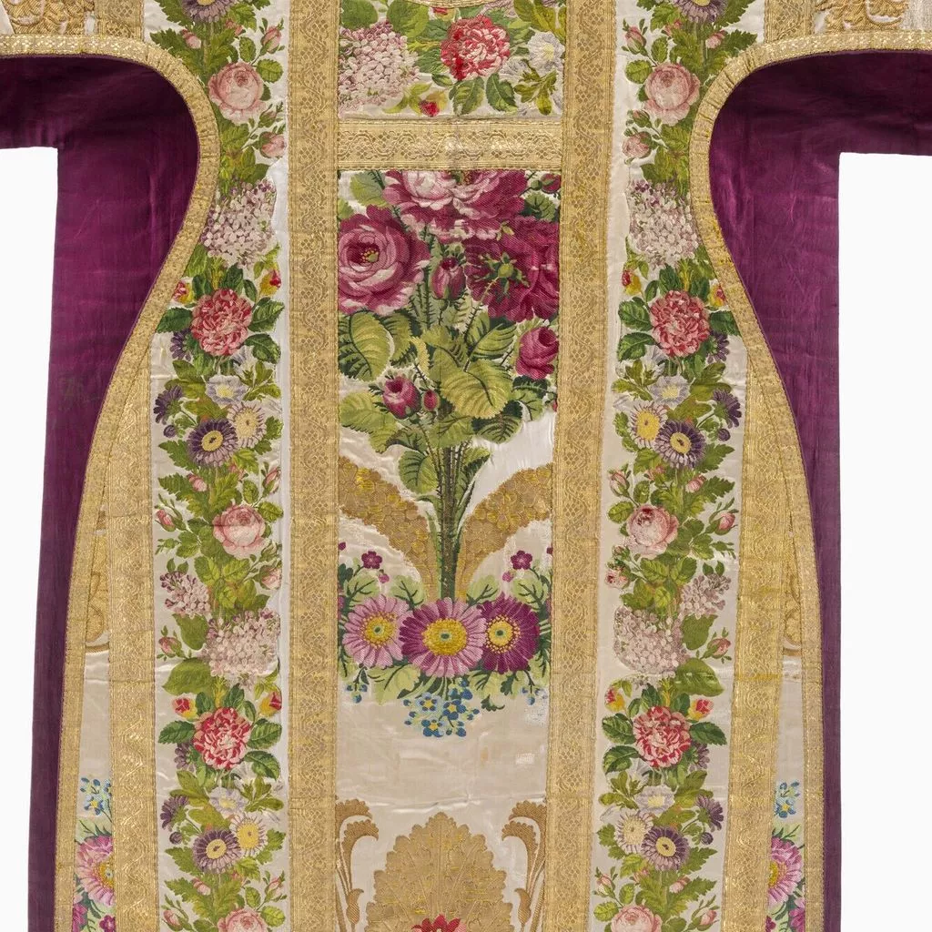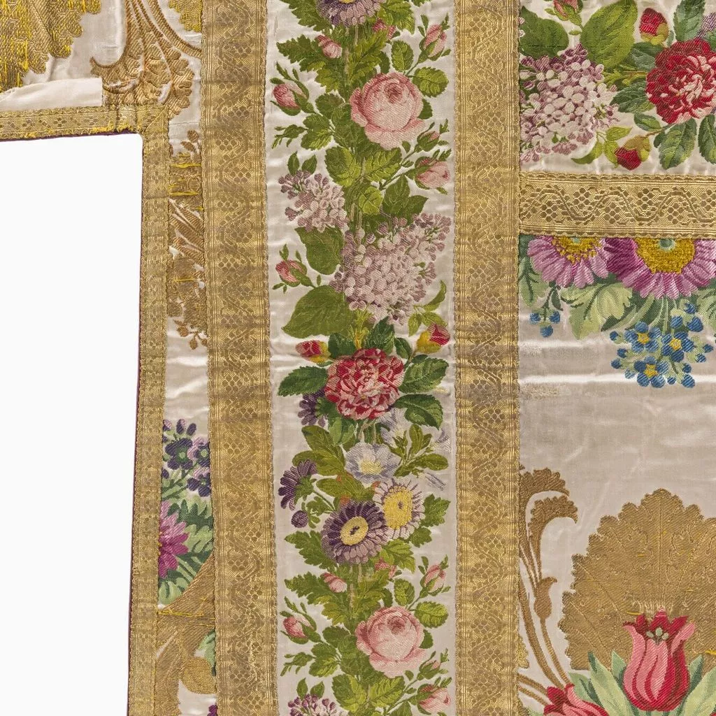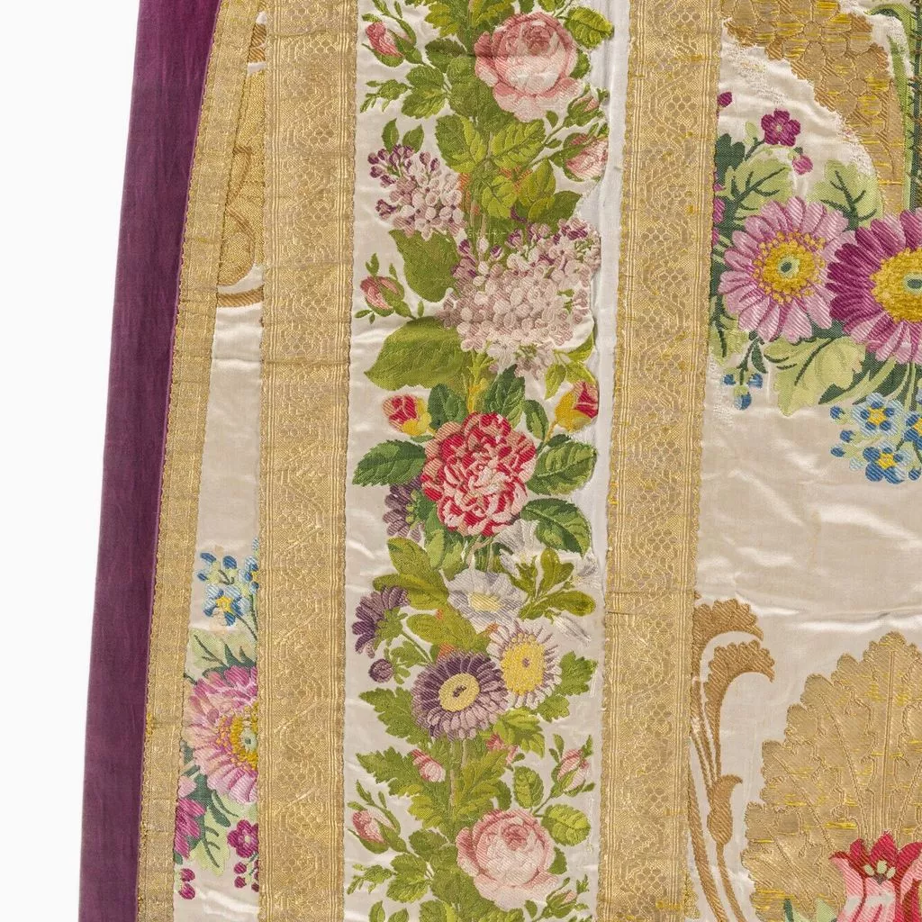 Taillé dans le brocard commandé à Lyon à la maison Bissardon et Bony en 1810 par Napoléon pour la chambre de l'Impératrice à Versailles ; employé pour tendre la chambre de la Duchesse d'Angoulême à Saint-Cloud ; réalisé par le chasublier Biais (Paris) et offert par Louis-Philippe en 1837 à la cathédrale Saint-Louis de Versailles, à l'occasion du Te Deum chanté pour la Prise de Constantine (13 octobre 1837). Dépôt de la cathédrale Saint-Louis de Versailles, 18 novembre 1976.