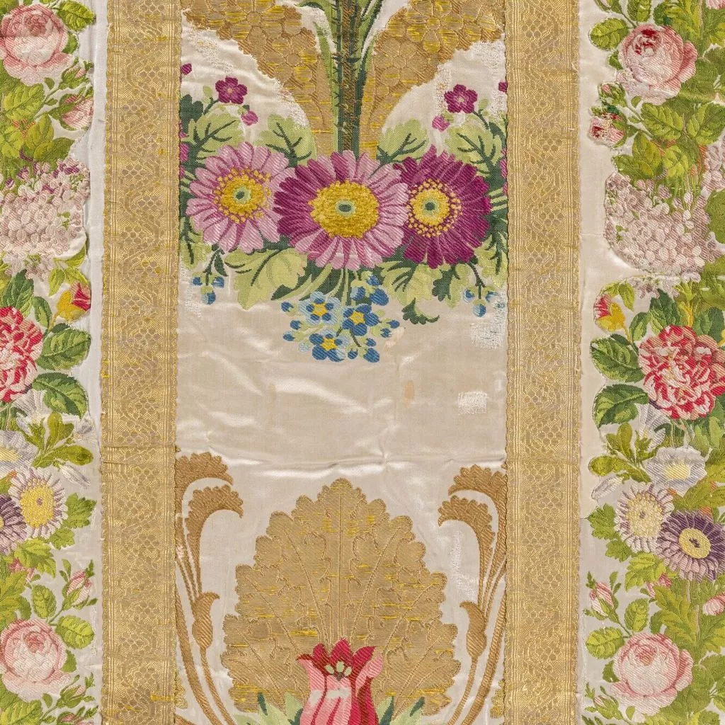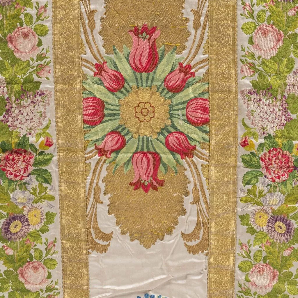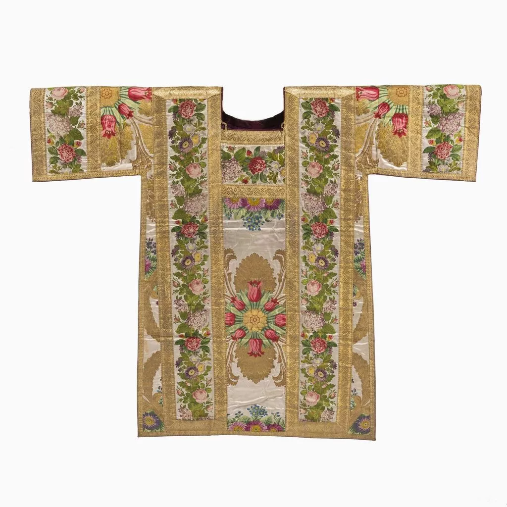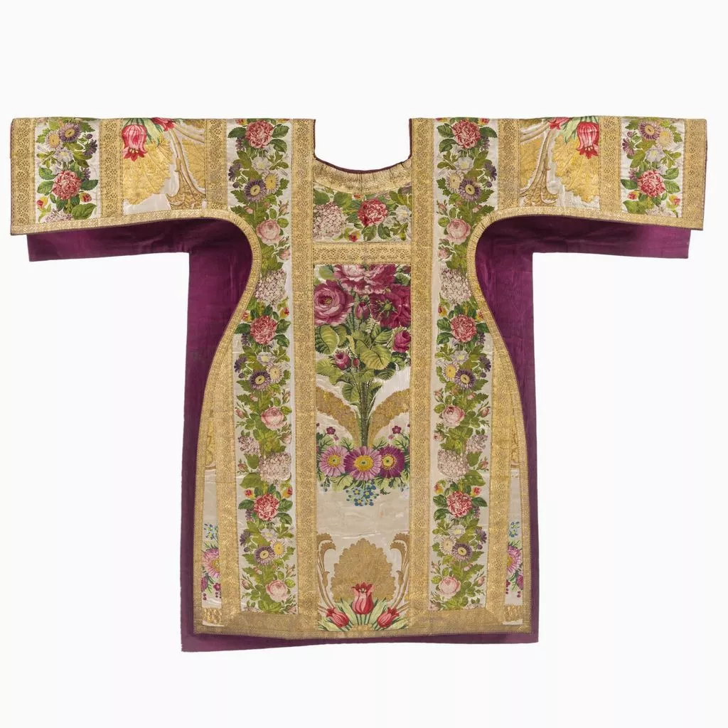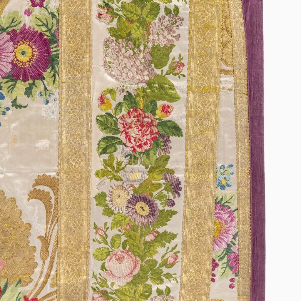 Taillé dans le brocard commandé à Lyon à la maison Bissardon et Bony en 1810 par Napoléon pour la chambre de l'Impératrice à Versailles ; employé pour tendre la chambre de la Duchesse d'Angoulême à Saint-Cloud ; réalisé par le chasublier Biais (Paris) et offert par Louis-Philippe en 1837 à la cathédrale Saint-Louis de Versailles, à l'occasion du Te Deum chanté pour la Prise de Constantine (13 octobre 1837). Dépôt de la cathédrale Saint-Louis de Versailles, 18 novembre 1976.