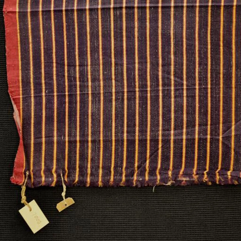 The complete object would have been intended for use as a garment, clothing. One end of a piece of mashru, with purple, yellow and red stripes. Textile, mashru fragment, Thanjavur, ca. 1855-1879.