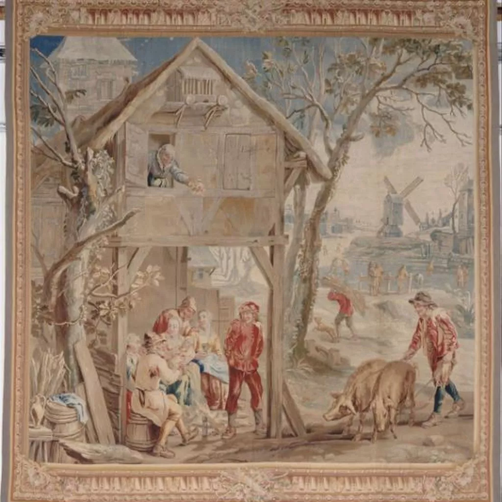 Entre deux groupes d'arbres noueux et dépourvus de feuilles, une maison couverte de chaume à auvent abrite un groupe de sept personnes sur la gauche et laisse découvrir un paysage hivernal sur la droite, une vieille femme tenant une rose apparaît à l'une des deux fenêtres du mur pignon de la maison à colombages du premier-plan, au-dessous de l'auvent font cercle autour d'un feu un couple de vieillards, une femme tenant un bébé emmailloté, un jeune homme en pourpoint sombre et béret et, légèrement en retrait, un autre couple dont la femme assise tient un verre sur les genoux, sur la droite une ville lointaine ainsi qu'un moulin à vent et une bâtisse aux fenêtres à meneaux plu proches dominent un espace gelé où évoluent et devisent des personnages, un homme précédé d'un chien porte un lourd fagot tandis qu'au premier plan un autre avec un bâton et une longe pousse deux porcs devant lui. Bordure : imitant un cadre, en plate-bande à godrons intégrant des acanthes selon un rythme 3-2, encadrée d'un filet de perles à pics d'une part, d'autre part d'un filet en faisceau enrubanné, palmettes d'acanthes accompagnées de roses et de lambrequins dans les angles, trophées de carquois et d'arcs au centre des bordures haute et basse