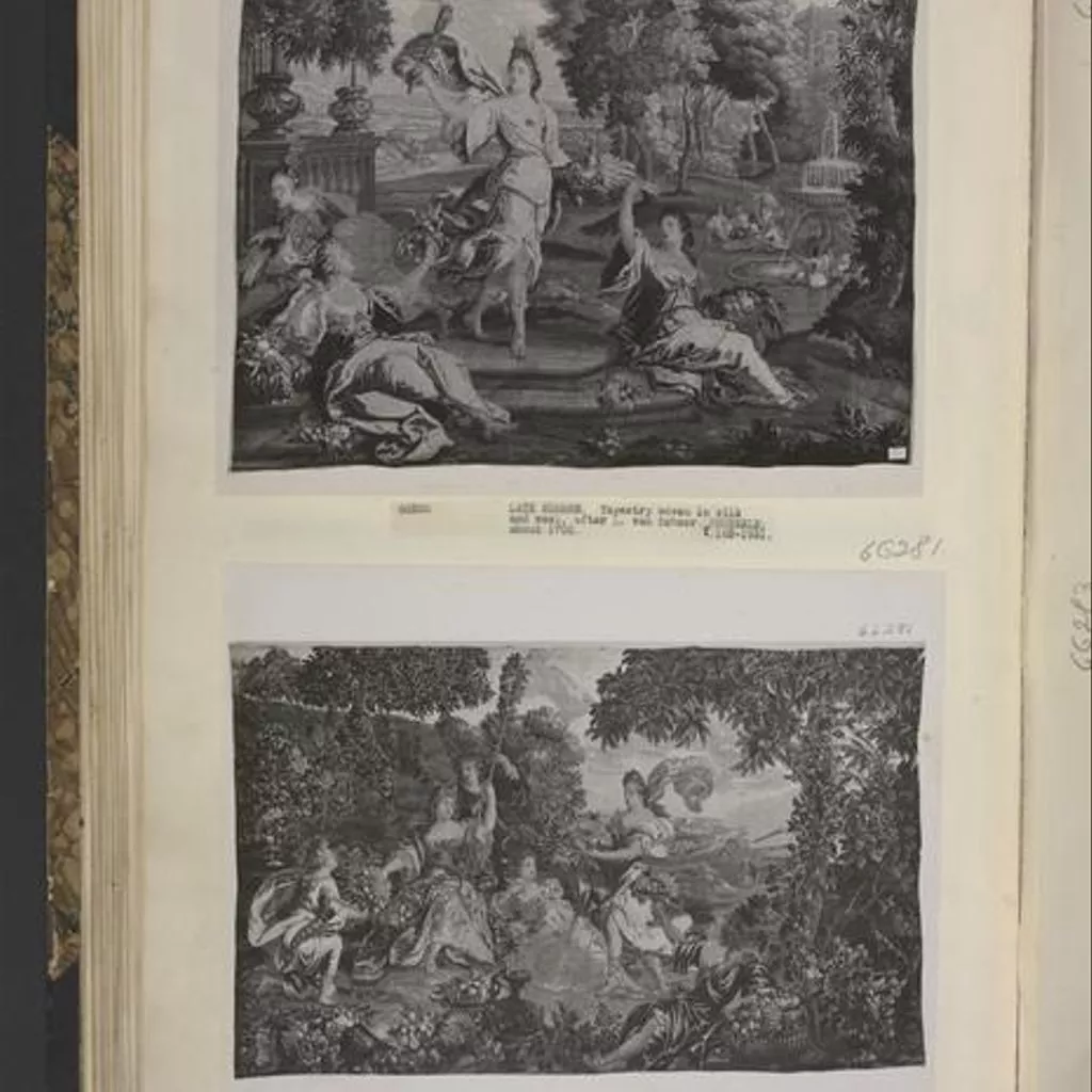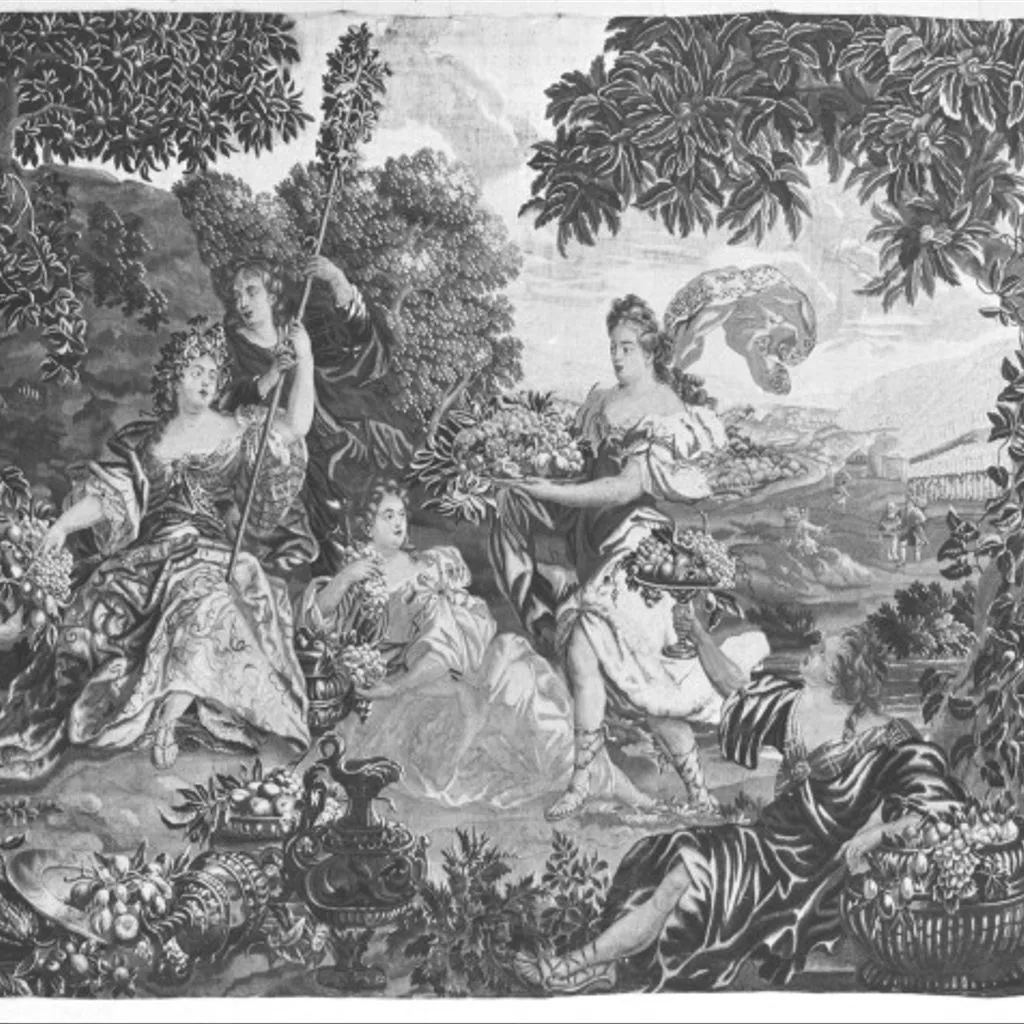 Tapestry woven in wool and silk. On the left is seated a women personifying Autumn. In her left hand she holds a large staff wreathed with vine leaves, which a girl is supporting. Before her kneels a woman who offers her a cornucopia filled with grapes and fruit. Before her are fruits, metal wine jugs and metal dishes with fruit. On the ground on her left is seated a woman holding bunches of grapes and another woman advances towards her bearing a large dish on which are grapes and fruits. In the foreground, a woman is seated and holds up a tall dish with fruits and she rests her left arm on a large basket full of fruit. There are trees to the right and left and in the distance is a hillside with vineyards showing grapes being gathered. Tapestry woven in wool and silk, Brussels, ca. 1690-1720