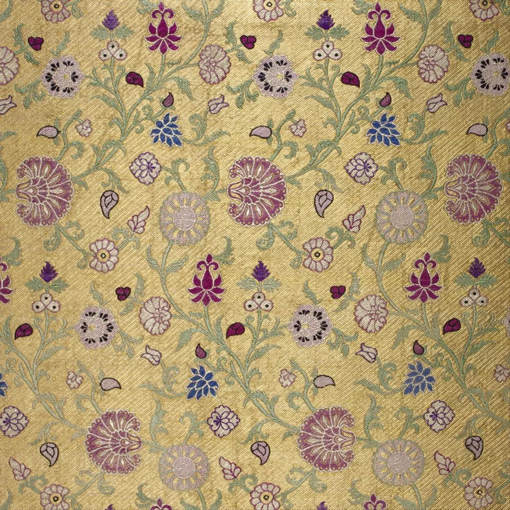 Silk brocade textile, Varanasi, 19th Century Brocade is a rich silk fabric with patterns in gold and silver thread. This piece has a running floral design in silver and various coloured silks on gold ground.