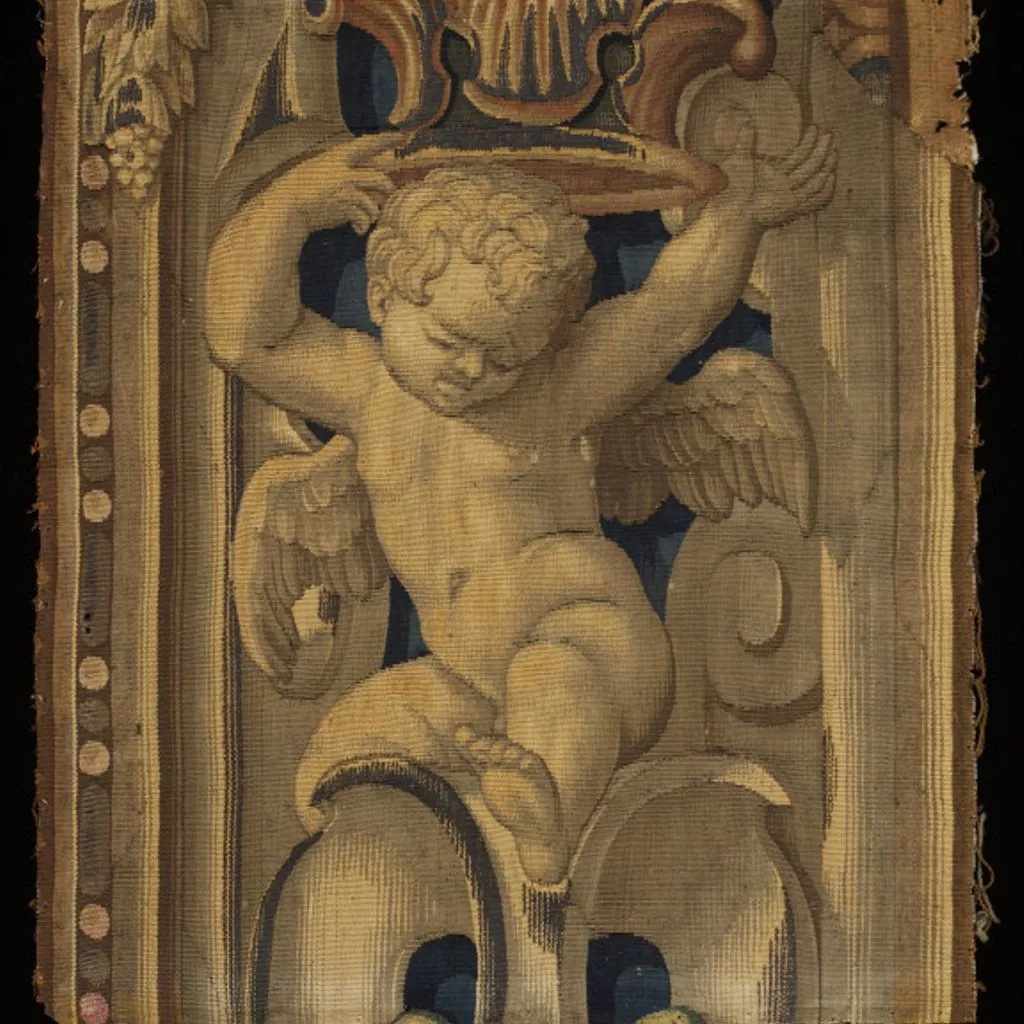 fragment of tapestry border depicting putto, woven in wool, silk and metal thread; patch from another tapestry in upper right corner.