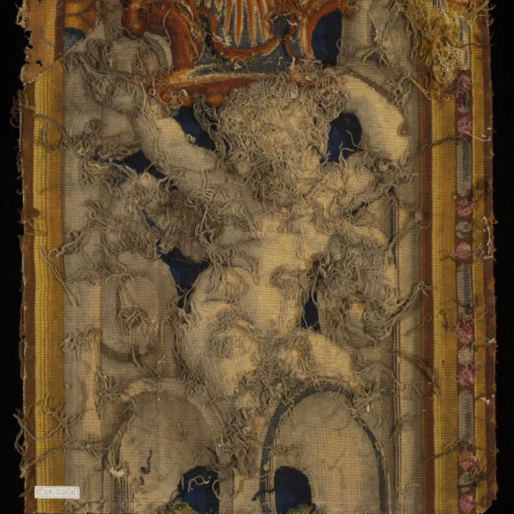 This tapestry fragment, woven with wool, silk and silver-gilt thread, is from a tapestry border designed by Francis Cleyn in the1630s, and woven at Mortlake. The tapestry workshop at Mortlake was established by Francis Crane under the patronage of King James I, and fifty Flemish weavers were brought there in 1620. Through their skill and the advantages of royal involvement, the workshop produced some of the finest tapestries in Europe during its first twenty years; the quality of these fragmentary pieces is testament to that.