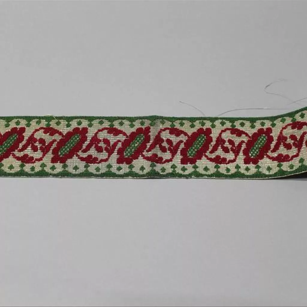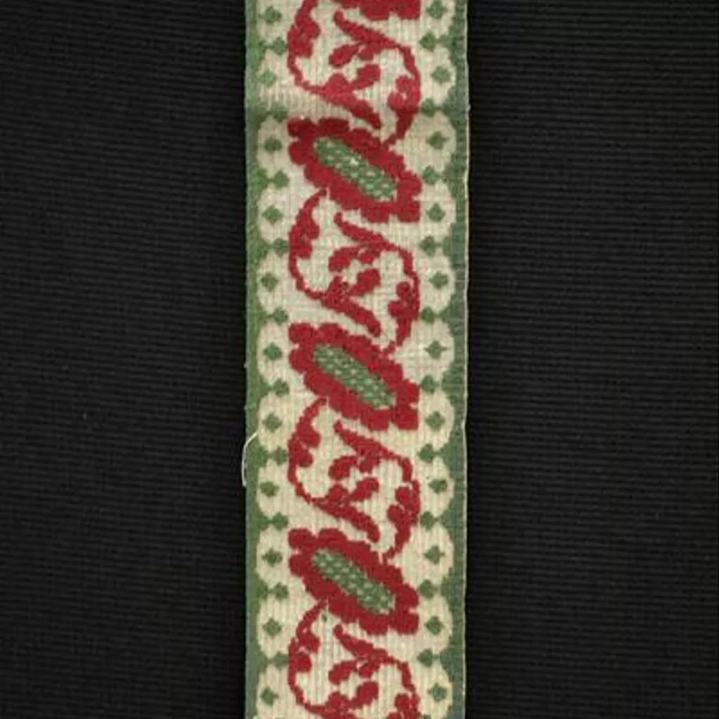 Textiles, silk border fragment, Madras, ca. 1855. Fragment of a border or belt, a floral design in red and green silk, woven on a background of silver-wrapped thread. The complete object would possibly have been intended for use as a garment, clothing, or for decoration.