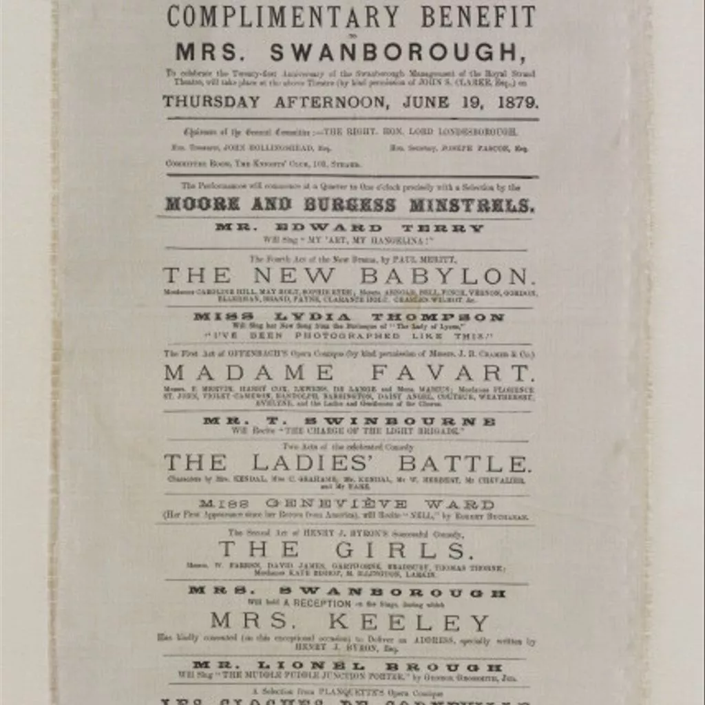 Silk playbill advertising a Benefit performance for Mrs. Swanborough at the Theatre Royal Haymarket, 19 June 1879, featuring a selection of performers, songs, scenes from plays and a recitation.