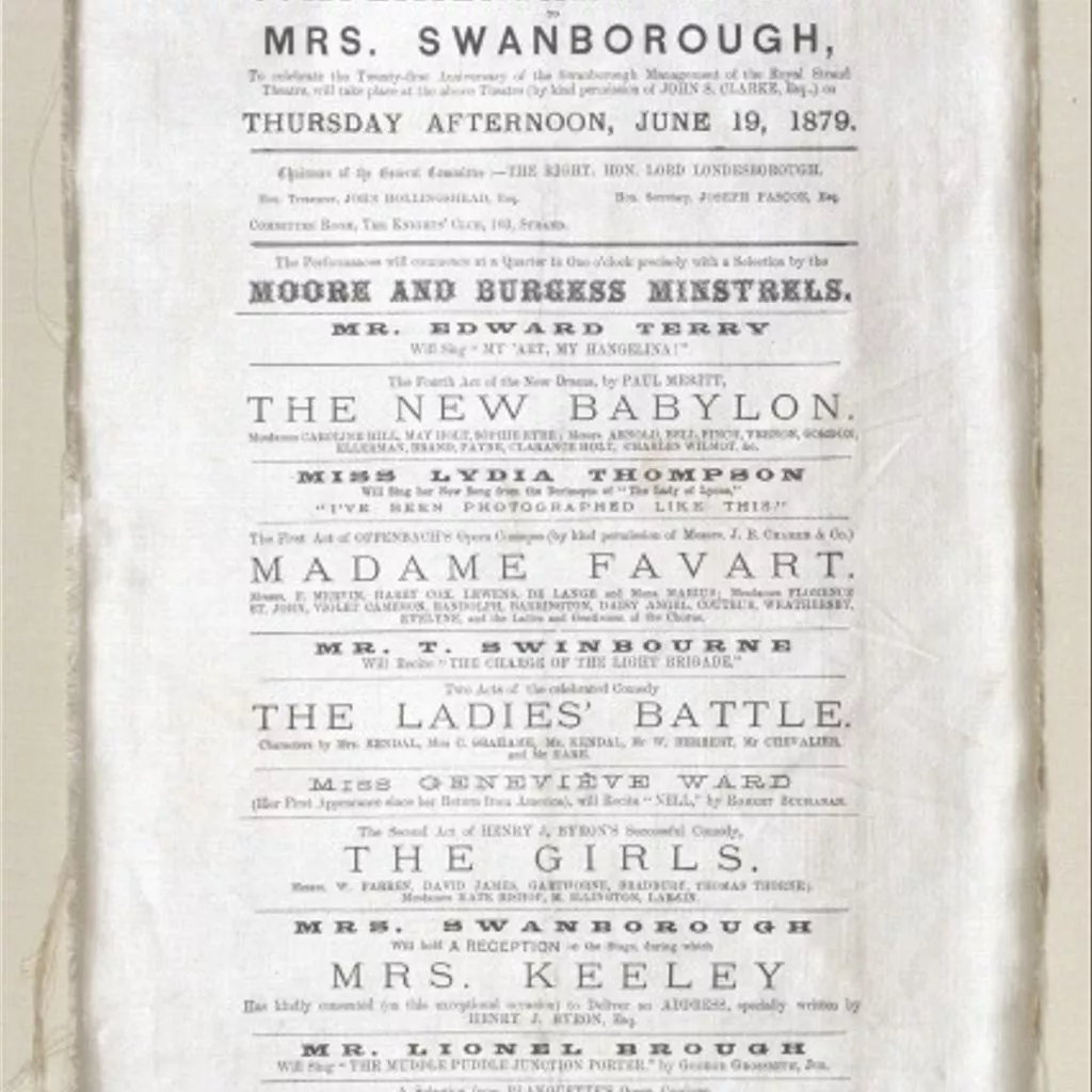 The performance took place in the afternoon, starting at 12.45pm and featured a selection of songs, scenes from plays and a recitation, meaning that the afternoon's proceedings would have lasted a very long time. The playbill shows that Mrs. Swanborough even hosted a reception on stage during which an address was delivered by Mrs. Keeley, written by H.J. Byron.