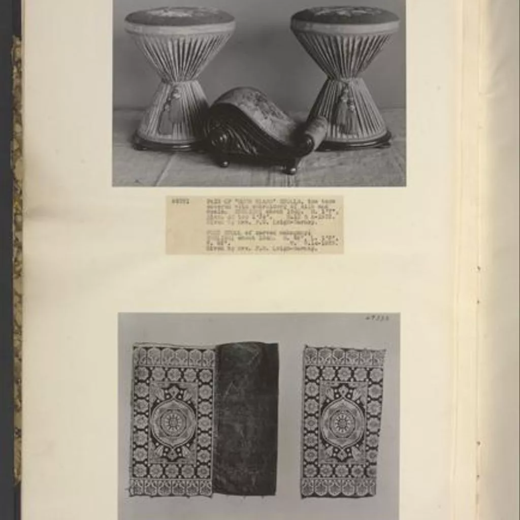 Designs for hour-glass stools were illustrated in furniture pattern books of the 1830s, indicating that the form became fashionable from that period. J.C. Loudon recommended hour-glass stools in his Encyclopaedia of Cottage, Farm, and Villa Architecture, 1833, fig. 2328, suggesting that they could be made of straw for rustic summer houses, as well as used in drawing rooms. A design, very similar to this pair of stools, and also with bun feet, was illustrated by Thomas King in The Cabinet Maker's Sketch Book, of Plain and Useful Designs. Vol I Consisting of Chair and Sofa Work, 1835, page 20, 'An hour-glass seat'. King also illustrated two other versions of different design in Specimens of furniture in the Elizabethan and Louis Quatorze styles. Adapted for modern imitation, c. 1835.
