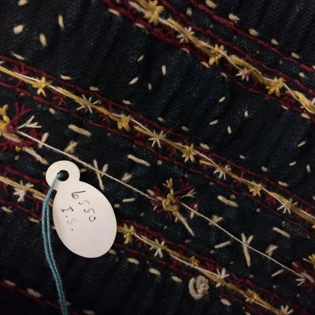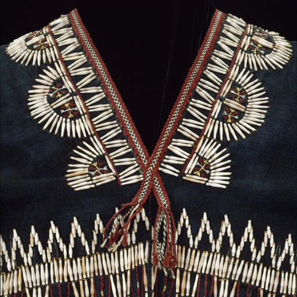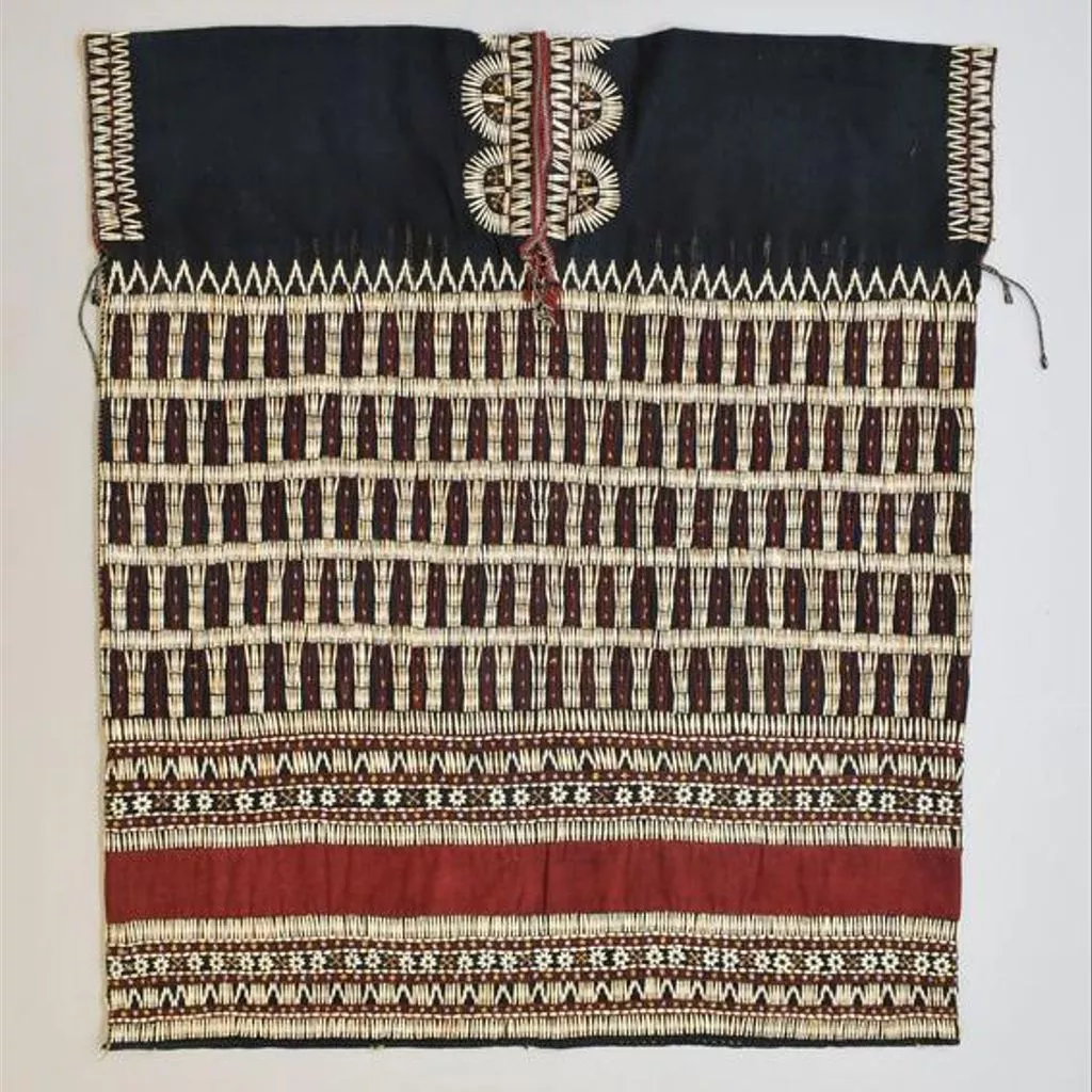 A long blouse of a woman of the Sgaw, a sub-tribe of the Karen. Indigo blue, plain weave, heavily decorated with bands of Job's Tears and red cloth. c. mid 19th century Made by sewing together 2 lengths of indigo coloured home-spun cloth, to form a central seam and then folding the fabric in half (the fold forming the shoulders). Holes are left in the upper corners for the arms and another opening is left in the centre seam for the neck. The lower half of the garment is covered with bands of Job's Tears and yellow and red silk embroidery. Neckline and armholes are highlighted with red cloth and Job's Tears. ("coix lacryma" - seeds of a type of grass). The simple cut of this blouse, in which two rectangles of cloth are sewn together vertically, leaving spaces for the head and the arms, is profusely decorated with silk thread embroidery and with seeds of a type of grass called in English "Job's Tears" (coix lacryma). It was handmade by a woman of the Sgaw, a sub-tribe of the Karen, who live mainly in the south-east of Burma, and worn with a warp patterned tubular skirt.