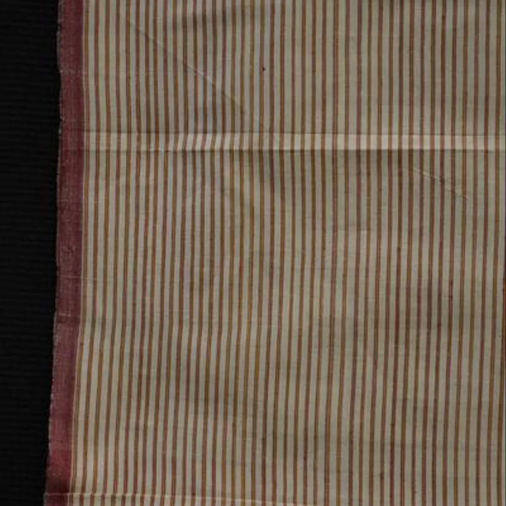 The complete piece would have been intended for use as a garment, clothing. Cut piece of mashru, with a fine red and yellow stripe and narrow red borders. Textile, fragment of striped mashru, Surat, ca. 1855.