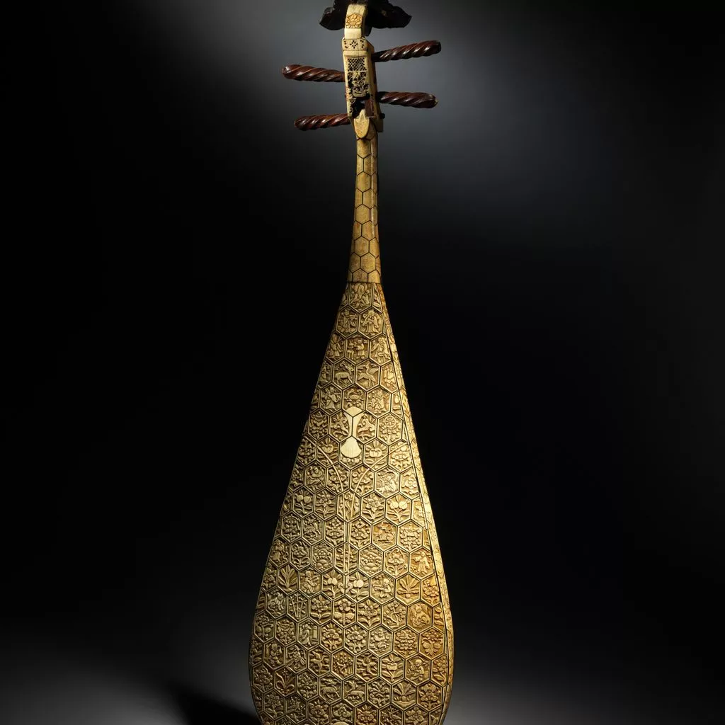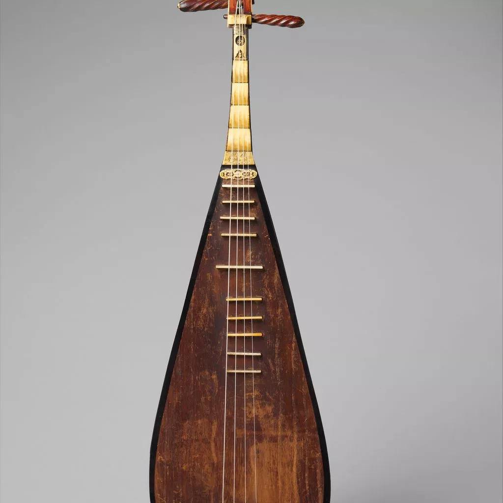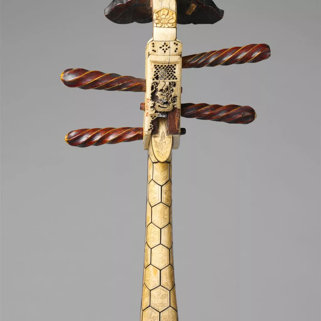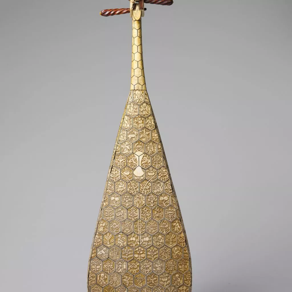 The pear-shaped lute slowly migrated from Central Asia into China during the Han and Sui dynasties (1st-7th century). It eventually became the pipa; the term describes the original playing motion of the plectrum held in the performer's right hand: p'i, "to play forward" (toward the left), and p'a, "to play backward" (toward the right). Until the mid-tenth century, the pipa was held horizontally (guitar style), and its twisted silk strings were plucked with a large triangular plectrum. Toward the end of the Tang dynasty, musicians began using their fingernails to execute the exuberant and programmatic repertory that was gaining popularity and that became the national style. To facilitate the use of the fingers, the instrument began to be held in a more upright position. In addition to its use in the opera and in storytelling ensembles, the pipa has a solo repertory of highly programmatic, virtuosic music. The spectacular back and sides of this unique Ming-dynasty instrument feature more than 110 hexagonal ivory plaques, with thinner bone plaques on the neck. Each plaque is carved with Taoist, Confucian, or Buddhist figures and symbols signifying prosperity, happiness, and good luck. These include images of various gods and immortals, such as Shou Lao, the Daoist god of longevity, who is shown with a prominent forehead on the single plaque at the very top. When the instrument is played, this expert workmanship remains unseen by the listener, as the back faces the player. The front is relatively plain but shows signs of use. The ivory string holder bears a scene featuring four figures and a bridge; an archaic cursive inscription; and, at the lip, a bat motif with leafy tendrils. Above the lower frets, two small insets depict a spider and a bird, and just before the rounded upper frets, a trapezoidal plaque portrays two men, one with a fish. The finial repeats the bat (good luck) motif.