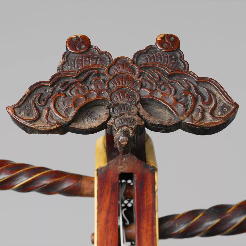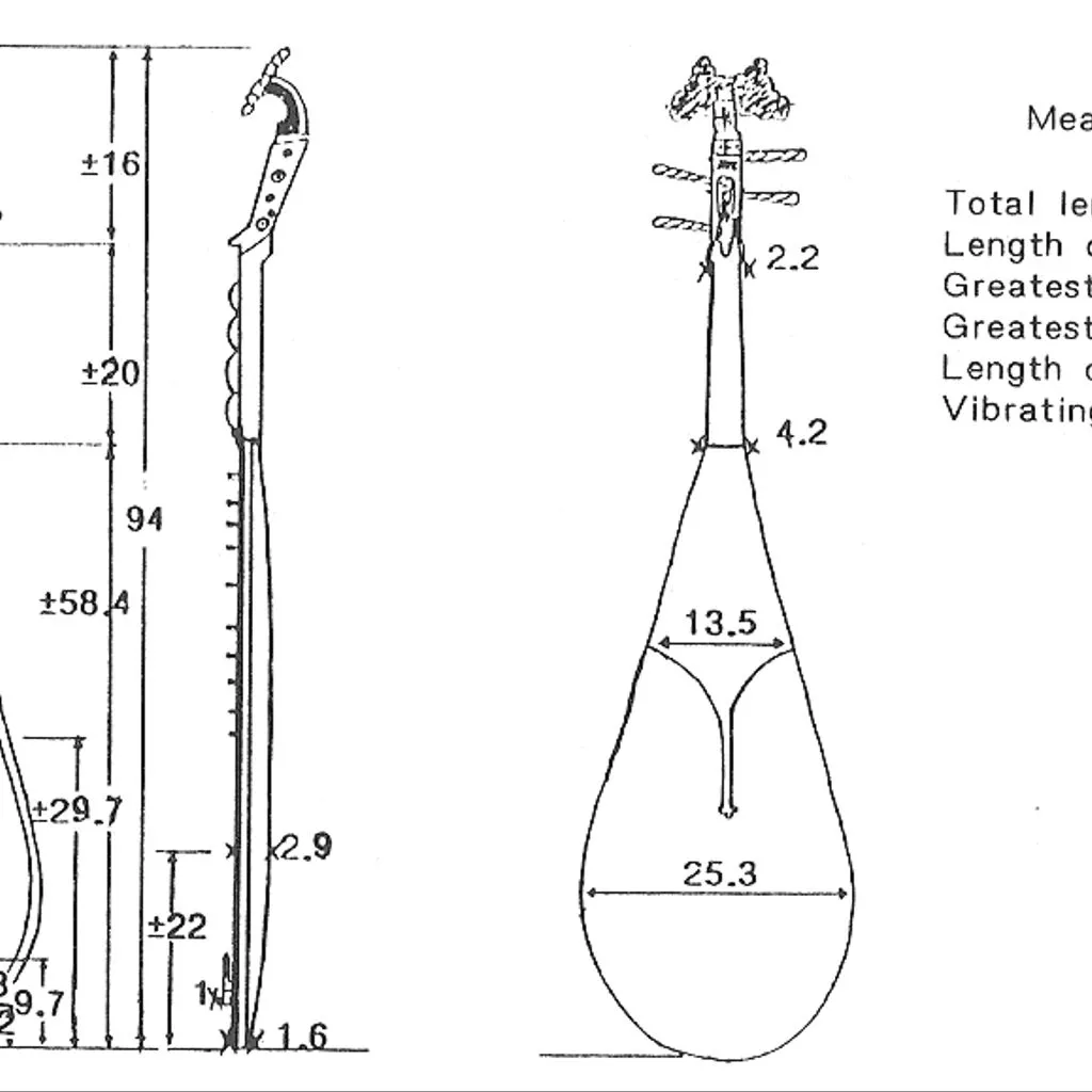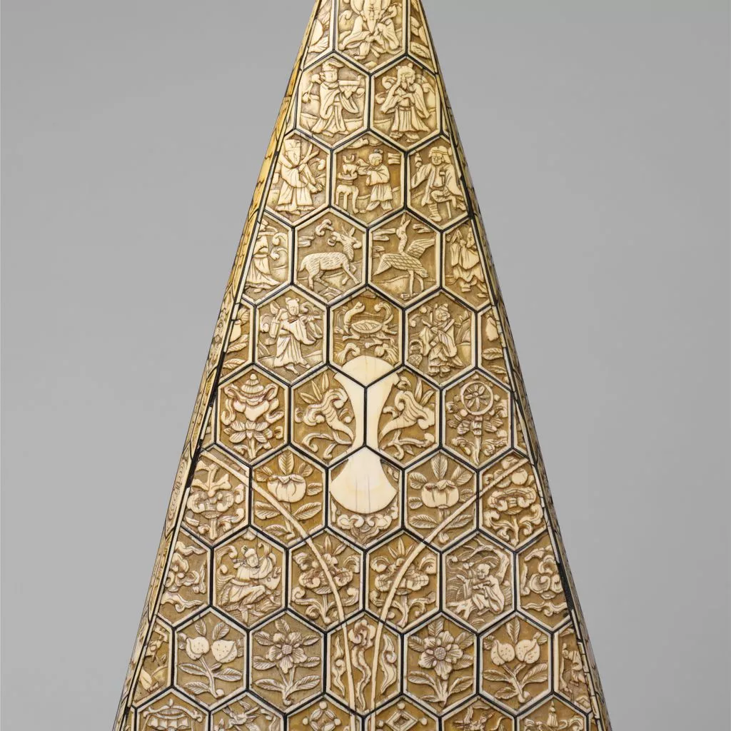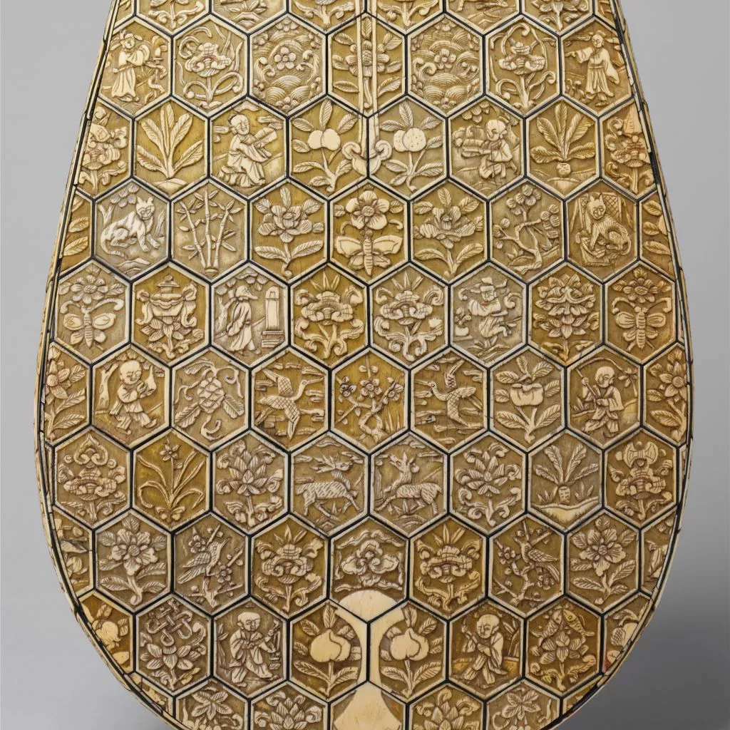 The pear-shaped lute slowly migrated from Central Asia into China during the Han and Sui dynasties (1st-7th century). It eventually became the pipa; the term describes the original playing motion of the plectrum held in the performer's right hand: p'i, "to play forward" (toward the left), and p'a, "to play backward" (toward the right). Until the mid-tenth century, the pipa was held horizontally (guitar style), and its twisted silk strings were plucked with a large triangular plectrum. Toward the end of the Tang dynasty, musicians began using their fingernails to execute the exuberant and programmatic repertory that was gaining popularity and that became the national style. To facilitate the use of the fingers, the instrument began to be held in a more upright position. In addition to its use in the opera and in storytelling ensembles, the pipa has a solo repertory of highly programmatic, virtuosic music. The spectacular back and sides of this unique Ming-dynasty instrument feature more than 110 hexagonal ivory plaques, with thinner bone plaques on the neck. Each plaque is carved with Taoist, Confucian, or Buddhist figures and symbols signifying prosperity, happiness, and good luck. These include images of various gods and immortals, such as Shou Lao, the Daoist god of longevity, who is shown with a prominent forehead on the single plaque at the very top. When the instrument is played, this expert workmanship remains unseen by the listener, as the back faces the player. The front is relatively plain but shows signs of use. The ivory string holder bears a scene featuring four figures and a bridge; an archaic cursive inscription; and, at the lip, a bat motif with leafy tendrils. Above the lower frets, two small insets depict a spider and a bird, and just before the rounded upper frets, a trapezoidal plaque portrays two men, one with a fish. The finial repeats the bat (good luck) motif.