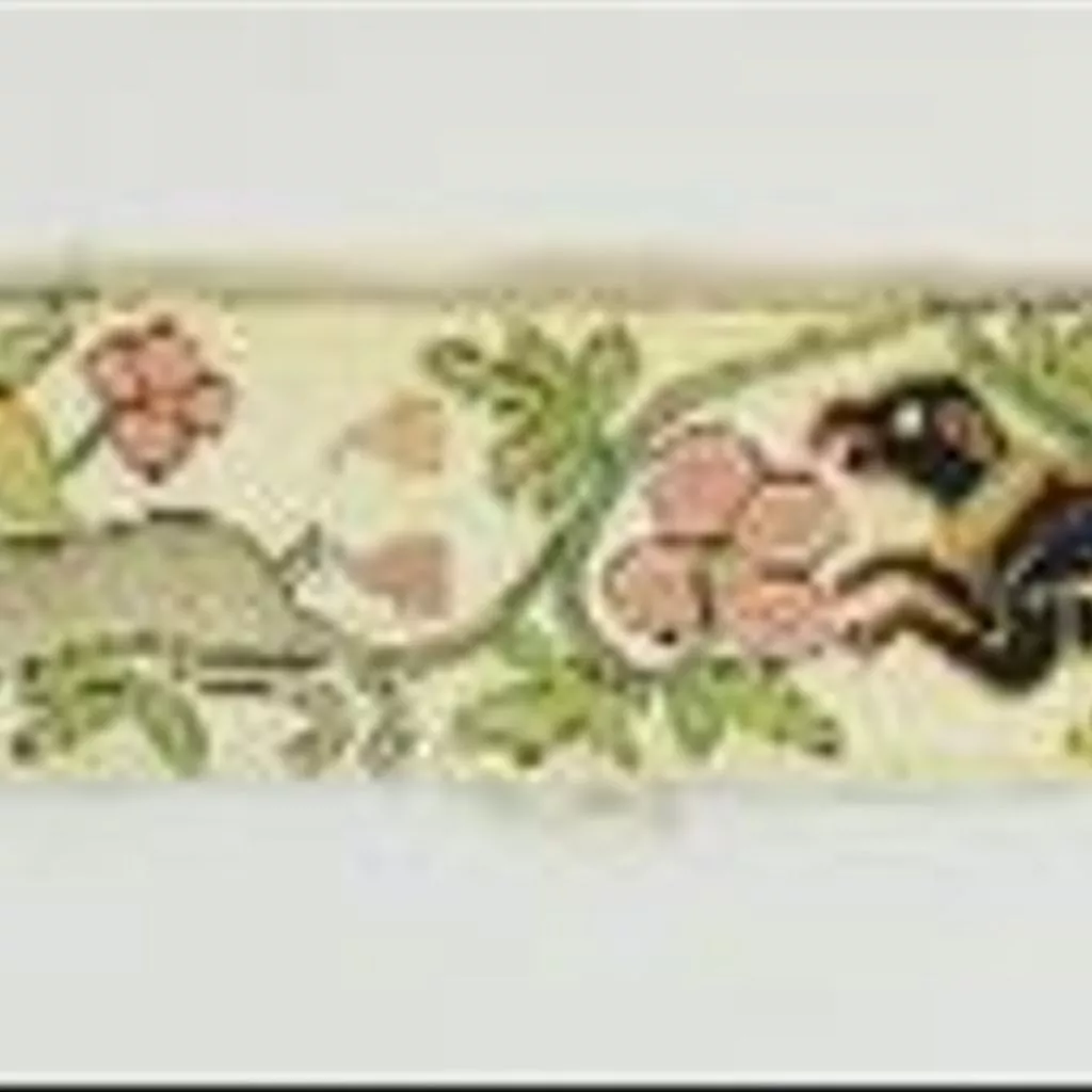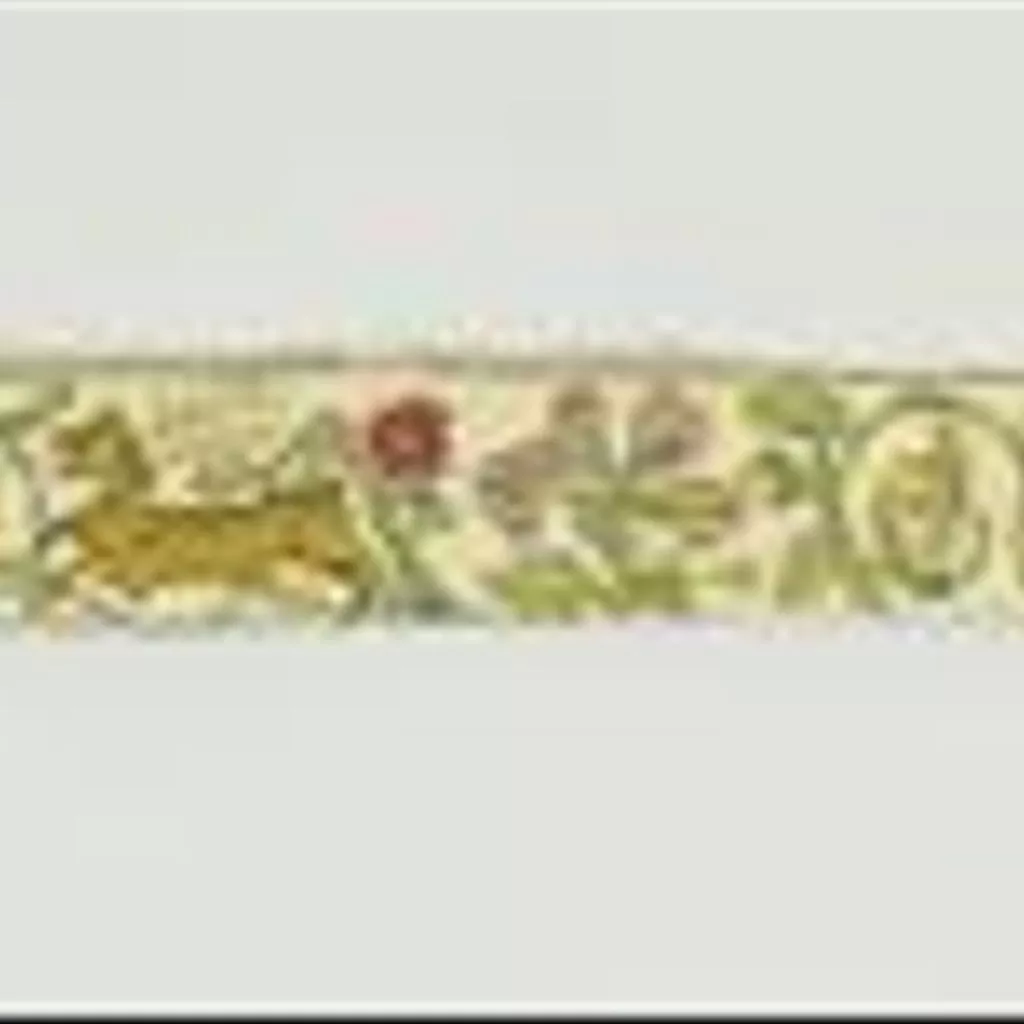 Tapestry-woven band on a white woollen ground. From right to left across the band, a hound in shades of brown and yellow outlined in black chases a stag of similar colour. A hound in black silk, only one in wool, is outlined in brown chases a unicorn in shades of grey outlined in black. The sequence of animals is repeated 4.75 times in the length of the band, interspersed with upright or scrolling stems of small flowers and acorns in shades of pink, red, blue and yellow, and with green stems and leaves. The centres of these flowers, the collars of the dogs and the horns of quarry, together with shading in some petals and in the acorn cups, are woven in gold thread of metal strip wound on a tan silk core.