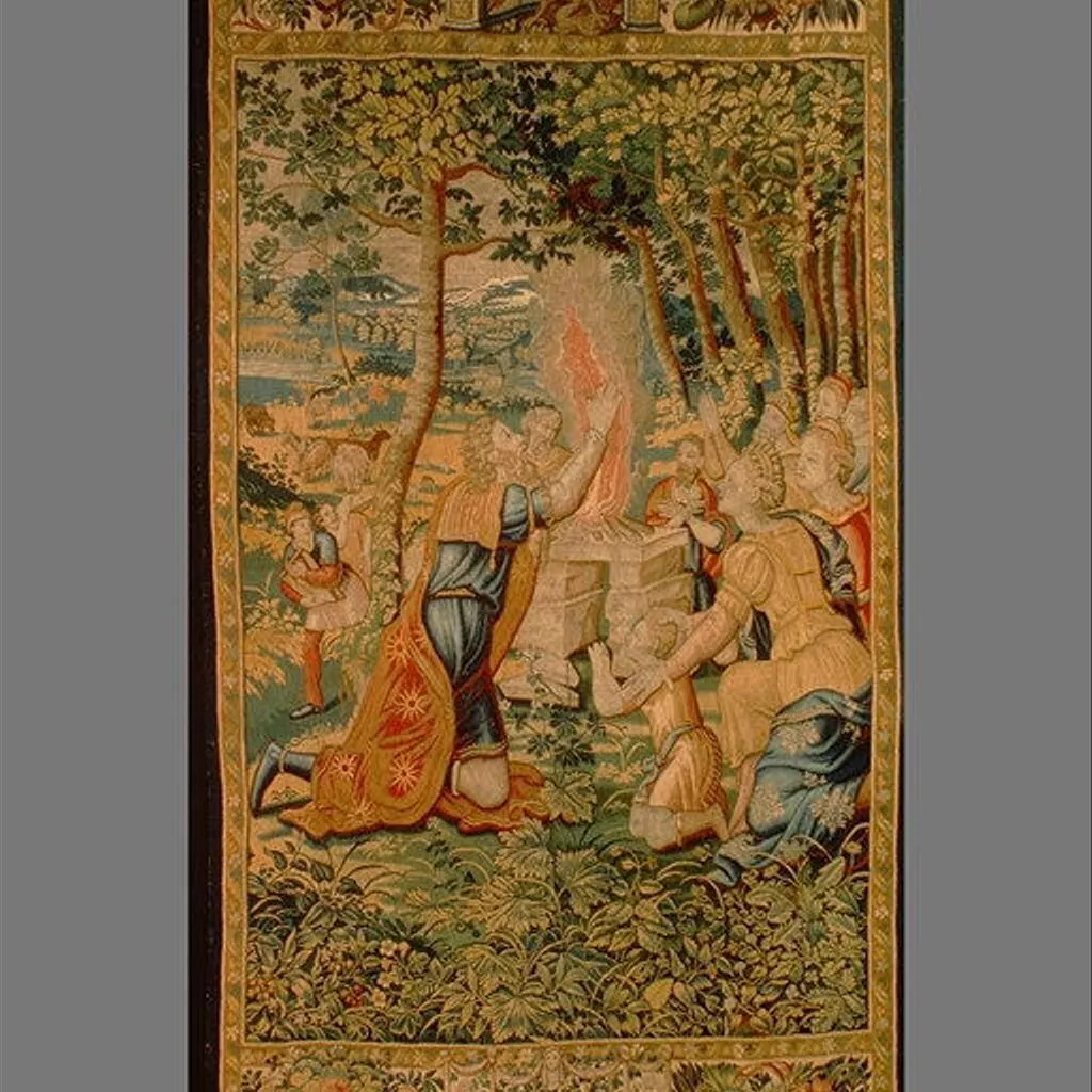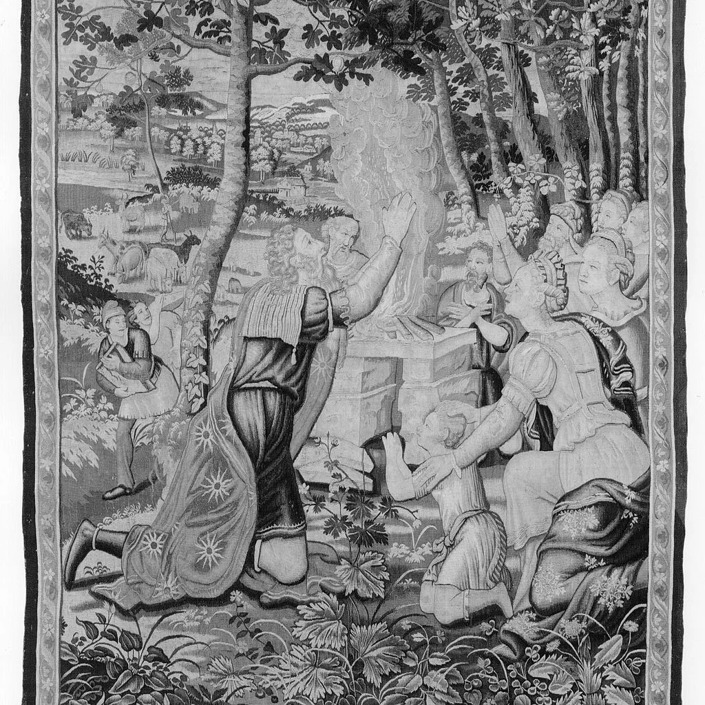 The story of Jacob as depicted in this set of six tapestries (1983.73.1–.6) begins with the scene of Esau selling his birthright to Jacob (Gen. 25:29–34). Esau, the hunter, sits with his bow and quiver at his feet. He clasps hands with Jacob, his brother, who is clad in the starred robe that will identify him throughout the story. By this handshake Esau and Jacob seal their agreement, and the former accepts a bowl of food in exchange for his birthright as firstborn. The secondary scenes represent different moments in time and serve to advance the story. In the center distance Esau is shown hunting with two dogs. To the right, Rebecca, mother of Esau and Jacob, is seen cooking outside the tent, probably preparing food for Jacob to present o his father, Isaac (Gen. 27). The narrative continues to unfold in the other tapestries, which depict Rachel giving her servant Bilhah to Jacob (Gen. 30:1–4), Rachel and Bilhah with her son Dan, and Jacob making a covenant with his father-in-law