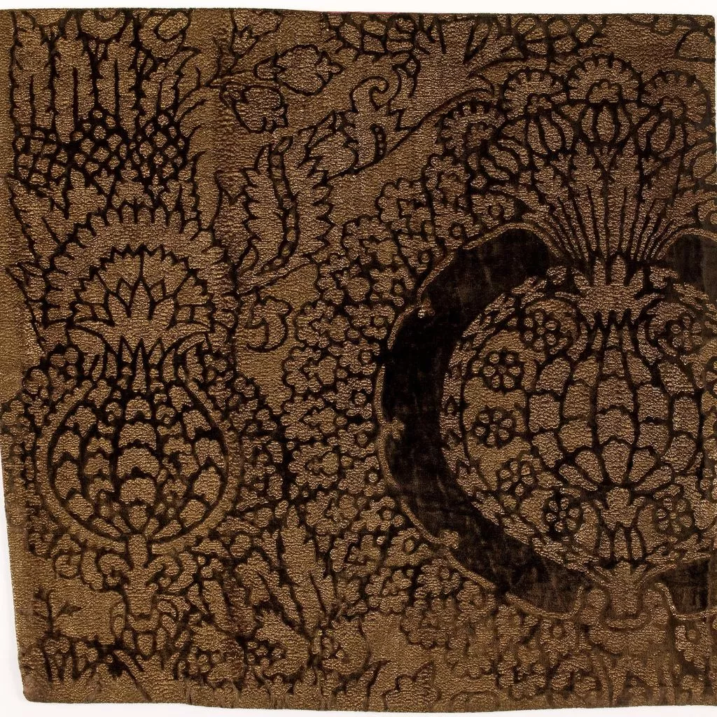 Teixit dissenyat per Marià Fortuny. Sobre un teixit de base de color marró s’ha estampat en daurat el motiu de la magrana o carxofa gòtica amb elements vegetals com a fons. El conjunt imita les representacions dels velluts dels segles XV-XVI en tots els seus detalls. La peça porta folre de seda de color vermell amb segell rodó identificatiu de “Marìa Fortuny – Venise”, en lletres marrons sobre fons daurat.