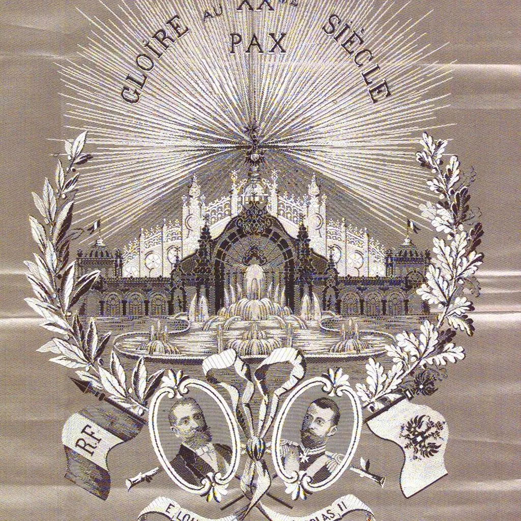Teixit jacquard rectangular commemoratiu de l'Exposició Universal celebrada a Paris l'any 1900. S'ha representat l'edifici de "Le Chateau d'Eau" emmarcat per una garlanda de llorer. A la part interior, retrats en marc oval independents, de E. Loubet, i Nicolàs II, identificats per inscripcions i acompanyats de les respectives banderes francesa i russa. Contè les següents inscripcions: A la part superior: " GLORIE AU XXme SIÈCLE / PAX". A la part inferior: "1900", "SOUVENIR de L'EXPOSITION", "SOCIÈTÈ des MÉCANIQUES", "J. VERDOL", "LYON". Ample de peça : 41 cm.