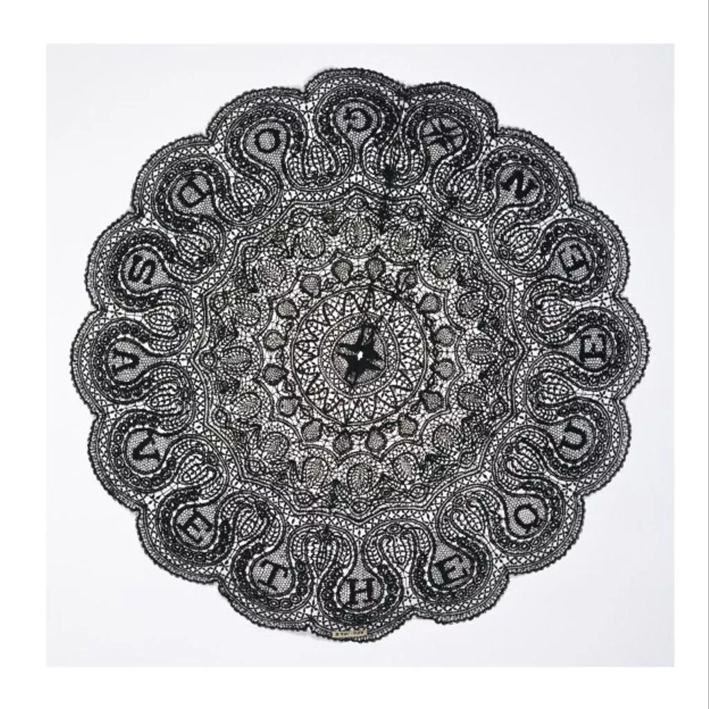 black silk bobbin lace parasol cover, Maltese, ca. 1868 A Maltese lacemaker made this piece of silk bobbin lace in about 1868. Malta was part of the British Empire at this time, and the silk incorporates the patriotic inscription 'God Save the Queen' (referring to Queen Victoria). Lacemaking began on the island of Malta in 1833 in order to provide employment for women. The style was based on the heavy peasant laces of north Italy. However, the Maltese lacemakers worked in silk. They mostly used geometric patterns and included lots of small oval motifs known as wheat-ears. Maltese lace became a fashion lace. It was mostly black - a very fashionable colour in the mid 19th century – and had a rich texture. It combined novelty with historical style. Many European manufacturers copied the Maltese technique, so lacemakers in Malta began to incorporate Maltese crosses into genuine Maltese work, as you can see here. This lace would have been mounted on a silk ground in contrasting colour to make the parasol. Parasol cover in black silk bobbin lace worked with the inscription God Save the Queen