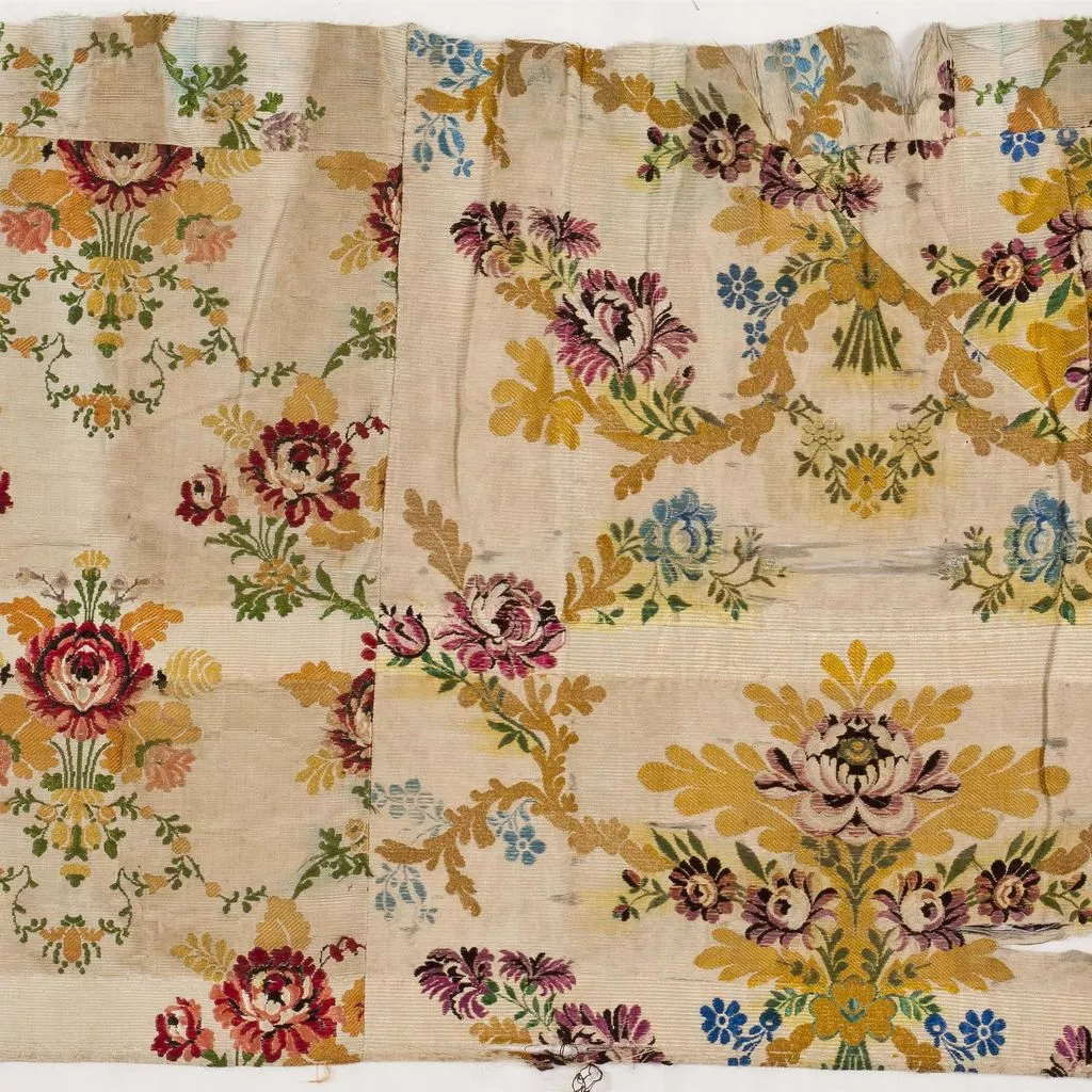 Peça formada per diferents fragments de teixit. Un d’ells és el model "CARPIO" de l'empresa valenciana "Garín e Hijos", inspirat en un disseny del segle XVIII. Els altres fragments són segurament també de Garín però no hem pogut establir a quin model corresponen. conserva 2 voravius. - es tracta de 6 fragments de teixit, amb 2 motius florals diferents, units per costura.