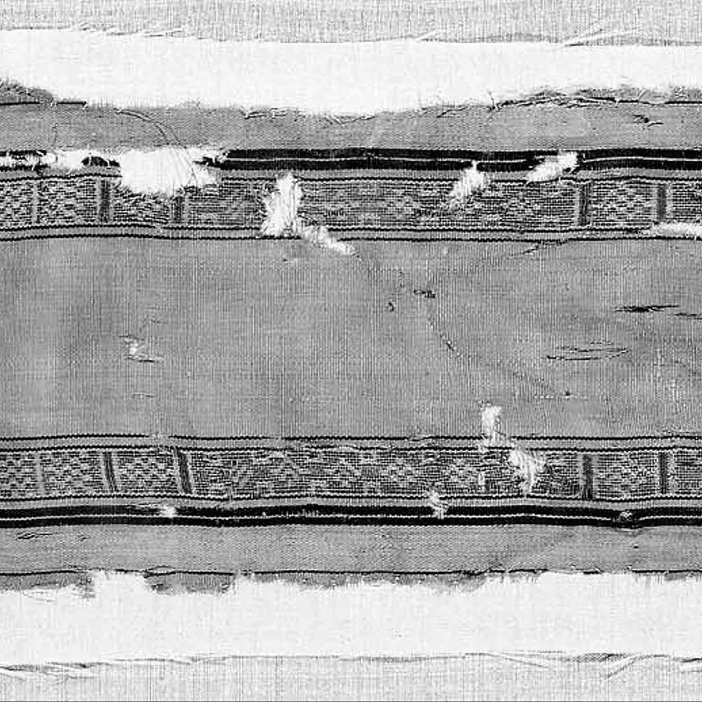 Light tan colored silk ground with a design of two parallel grey bands framed by a dark brown border; each band is divided into squares and rectangles enclosing geometric motifs of the same color of the ground; probably part of a sleeve band (?). Much worn.
