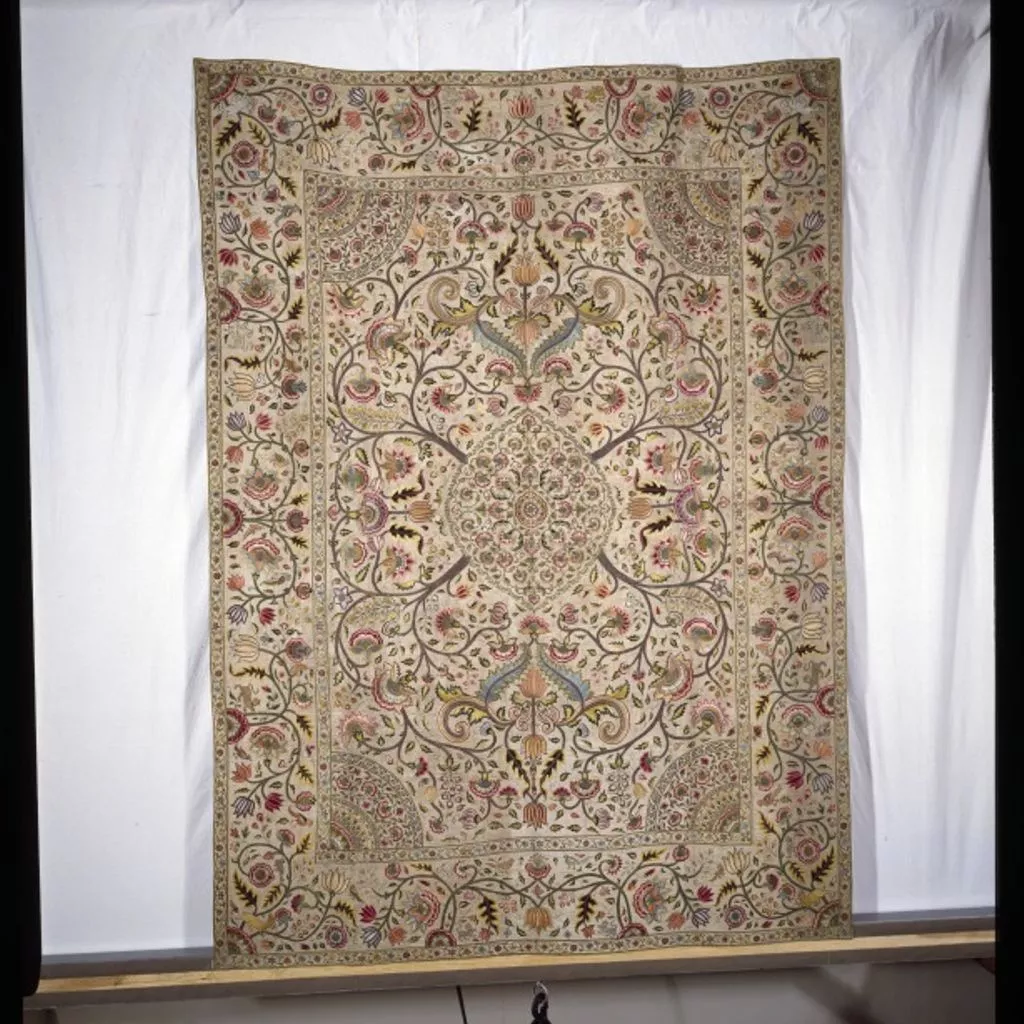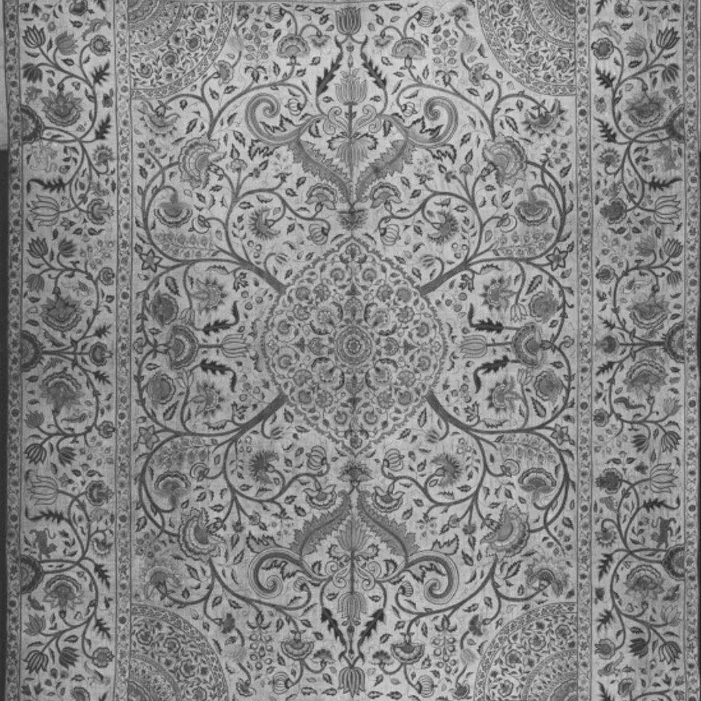 Rectangular floorspread or cover. Cotton, embroidered with floss silk and metal-wrapped thread. Central oval medallion with radiating flowering stems; quarter medallions in the corners; border with large floral meander. Coverlet, cotton embroidered with silk. Deccan, 18th century Embroideries of this type, with elaborate floral designs worked in floss silk in satin stitch, and often with areas of couched metal-wrapped thread, have been attributed to various centres, including Goa. It seems likely that they were actually produced in the Deccan during the 18th century. This one is said to have belonged to Tipu Sultan of Mysore, who died at the battle of Seringapatam in 1799. FLOORSPREAD OR COVERLET Cotton, embroidered with floss silk metal thread and sequins South India Probably 1700-50 783-1864 This was said to have been owned by Tipu Sultan and to have been taken at Seringapatam. The museum bought it in 1864. [27/9/2013]