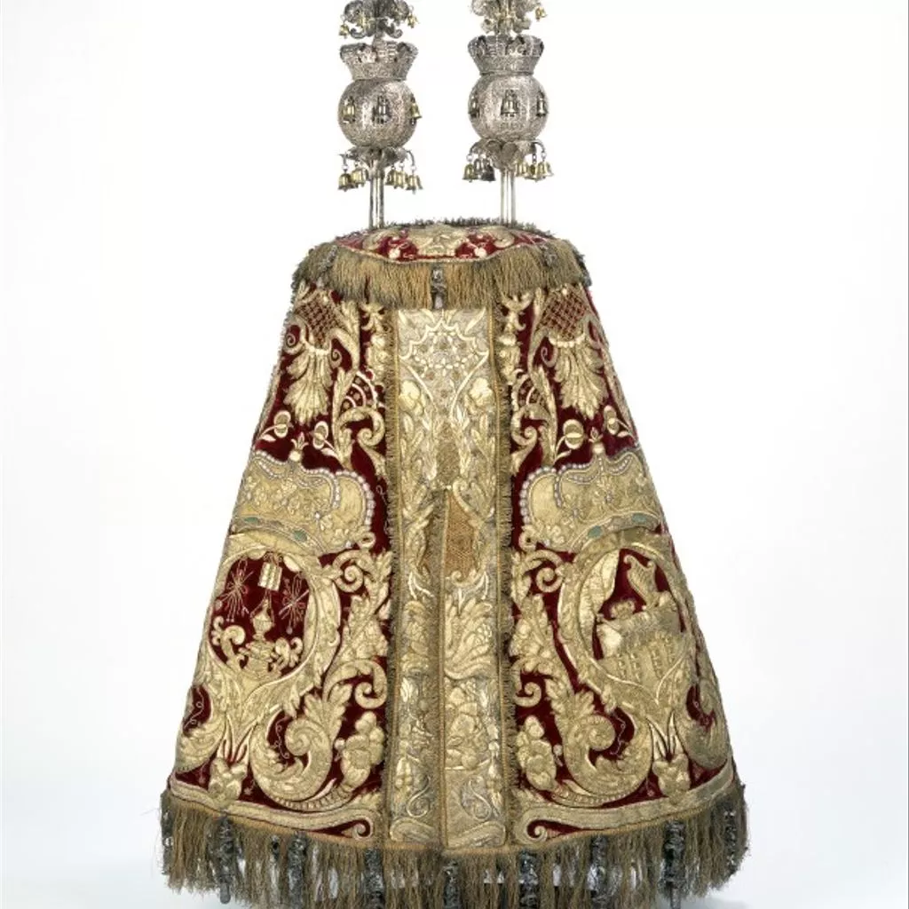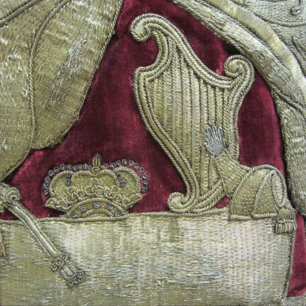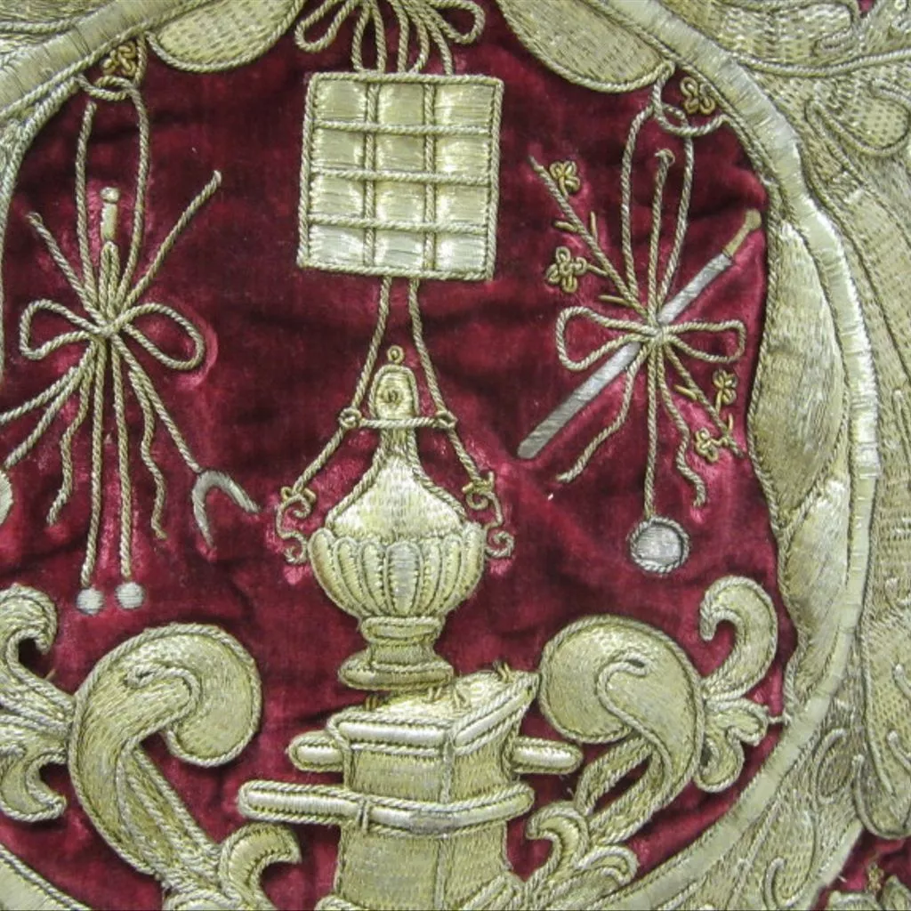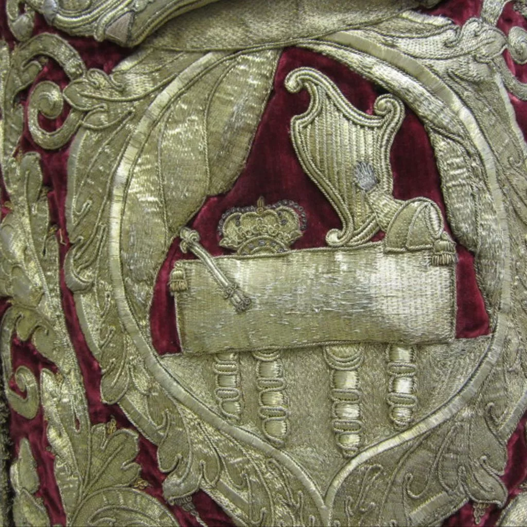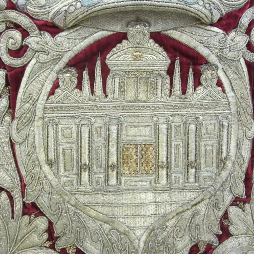 Mantle for a Torah Scroll. Silk velvet and silk brocaded with silver, embroidered with silver-gilt thread, twist, coil and purl with some silver inlaid and couched work; elaborately padded. Trimmed with a silver-gilt fringe and silver tassels. The whole mantle is magnificently decorated: on the front, within a large medallion, is a representation of the Aron ha-Kodesh [Ark of the Law] of the Sephardic synagogue in Amsterdam. At the back are two other medallions, one showing the harp, sceptre and crown to symbolise King David. The second depicts the breastplate, laver of brass, altar, Aaron's rod, shovels, flesh-hooks and firepans used in the sacrifices at the Temple in Jerusalem [see Exodus 27, 3]. All three medallions are surmounted by the Crown of the Law.