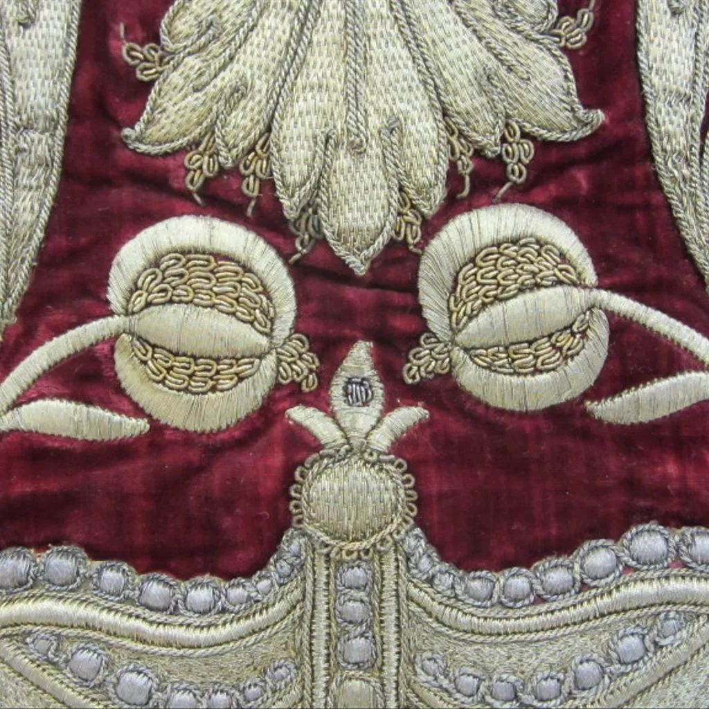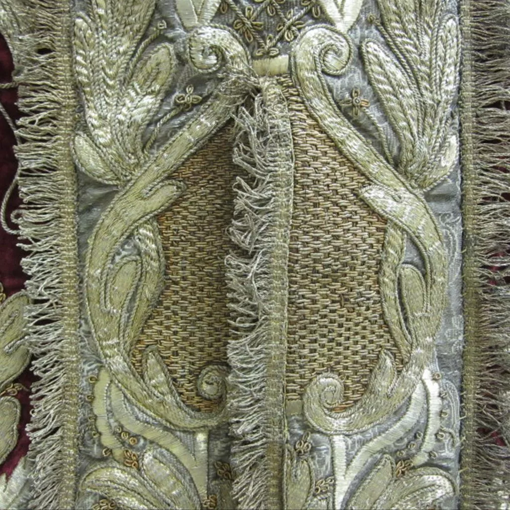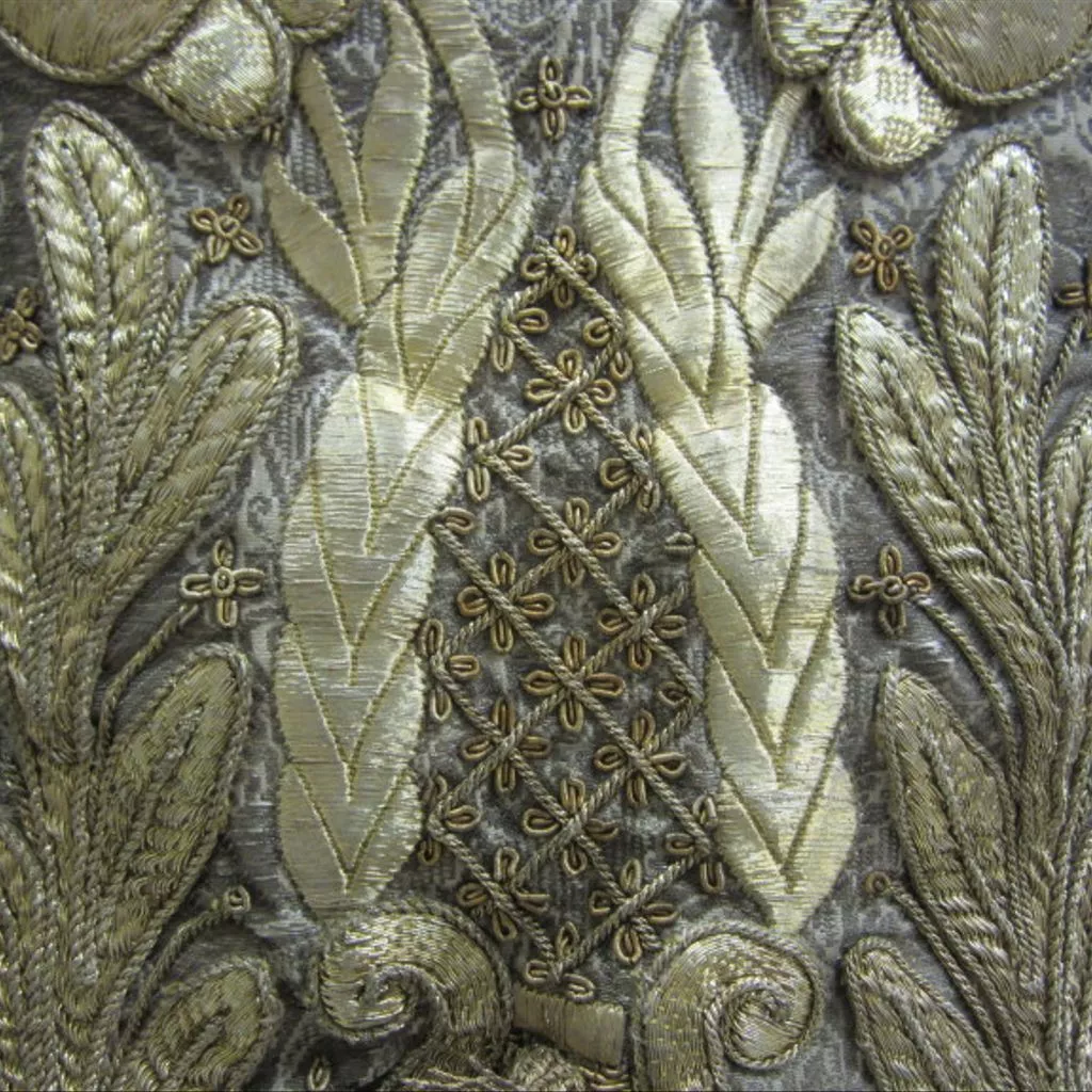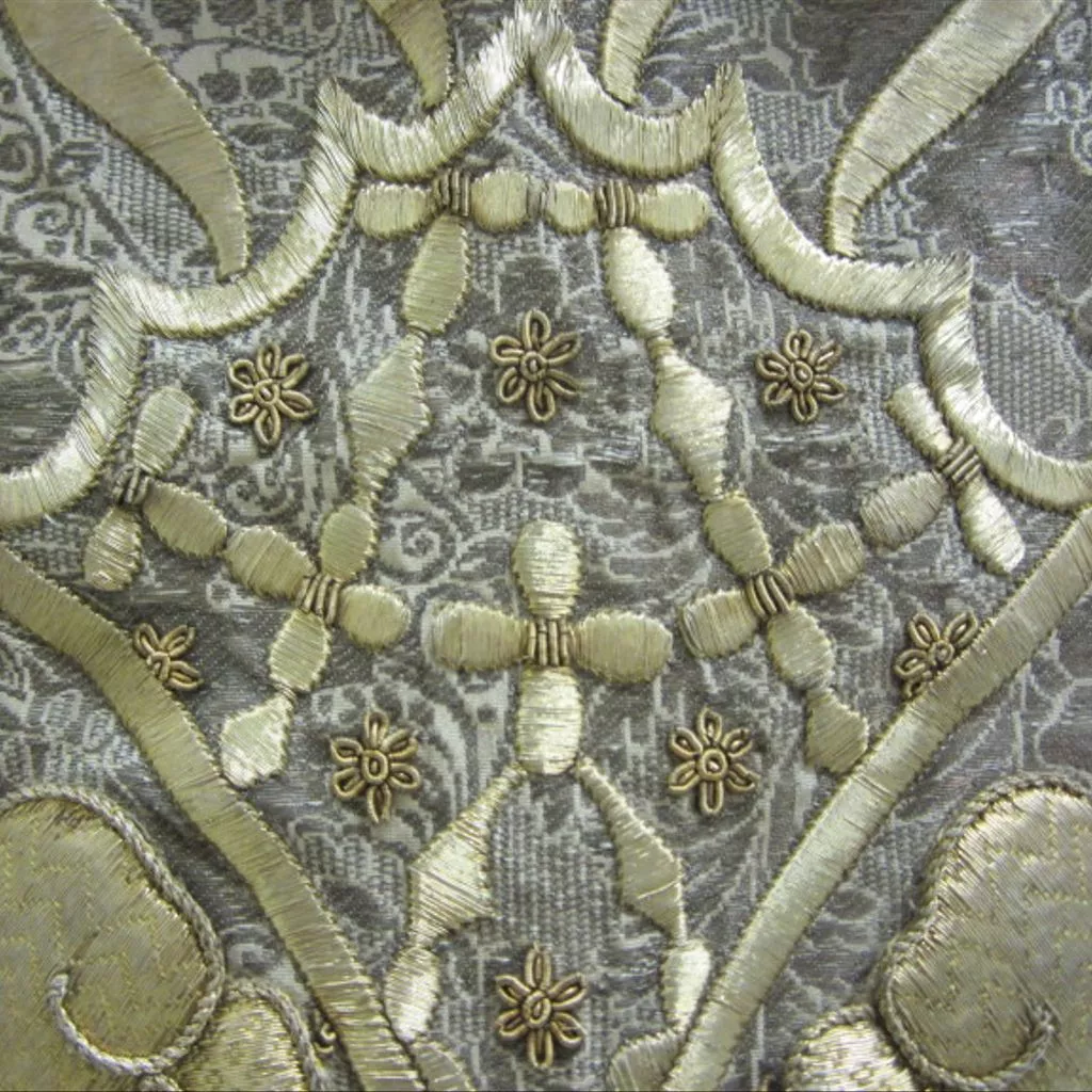 Silk velvet and brocaded silk, embroidered and trimmed with metal thread
