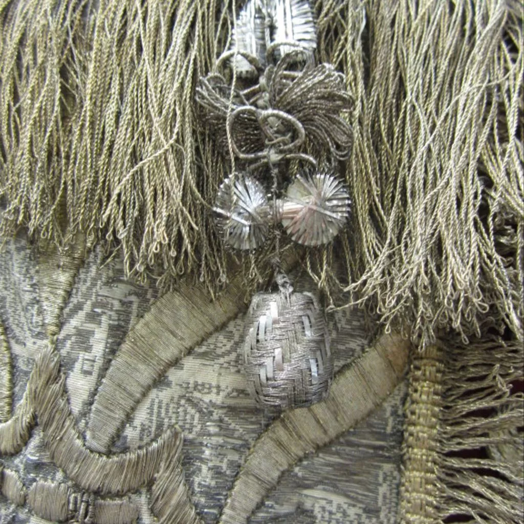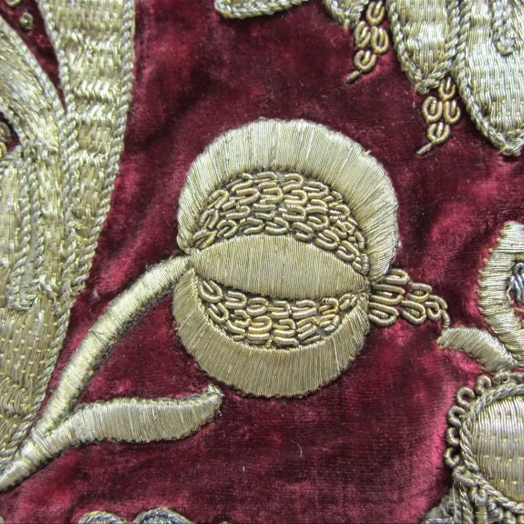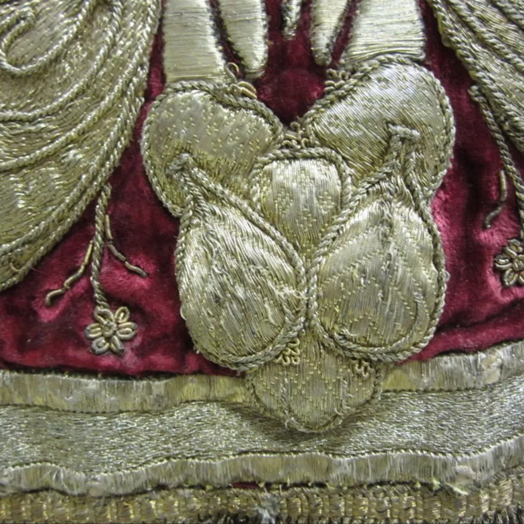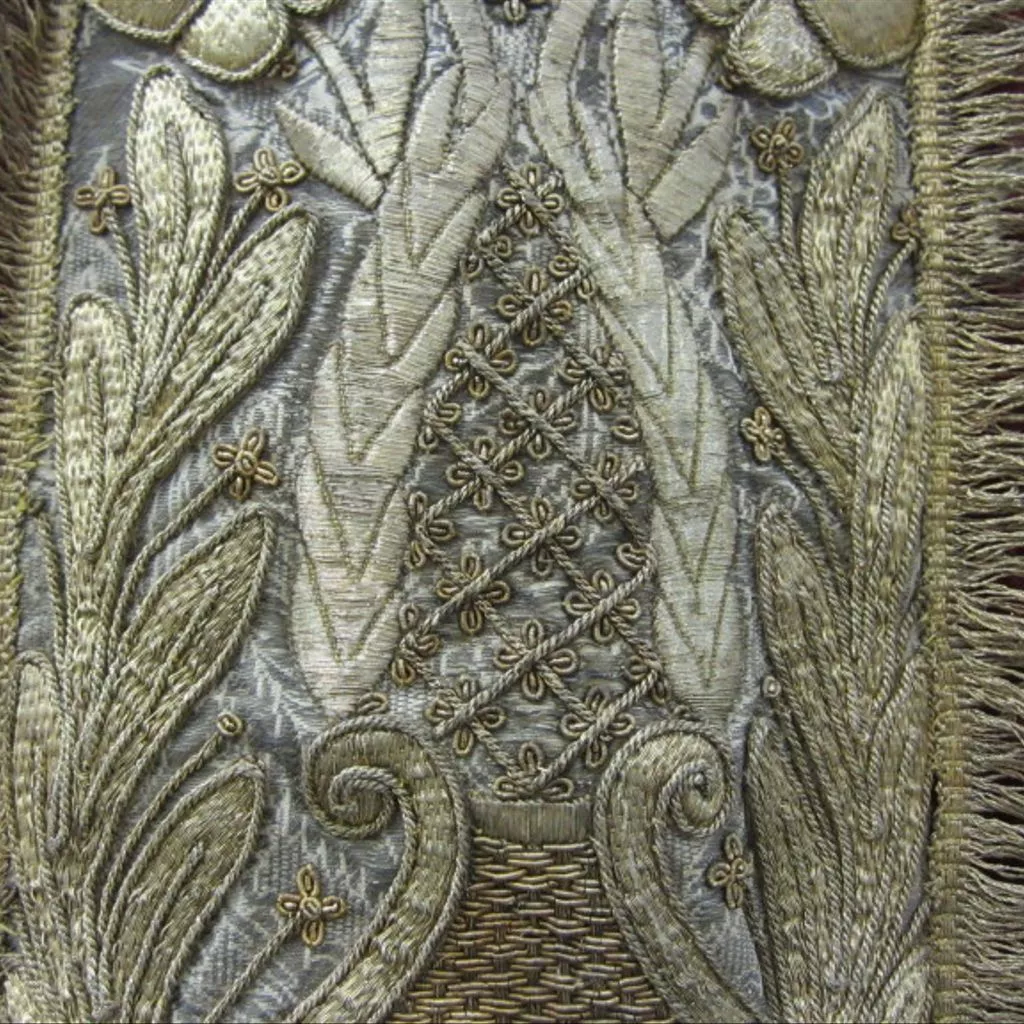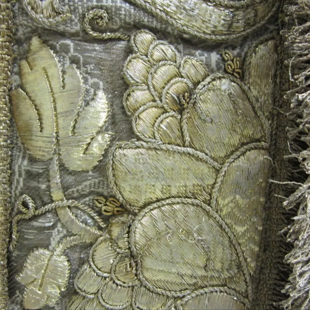 Silk velvet and brocaded silk, embroidered and trimmed with metal thread