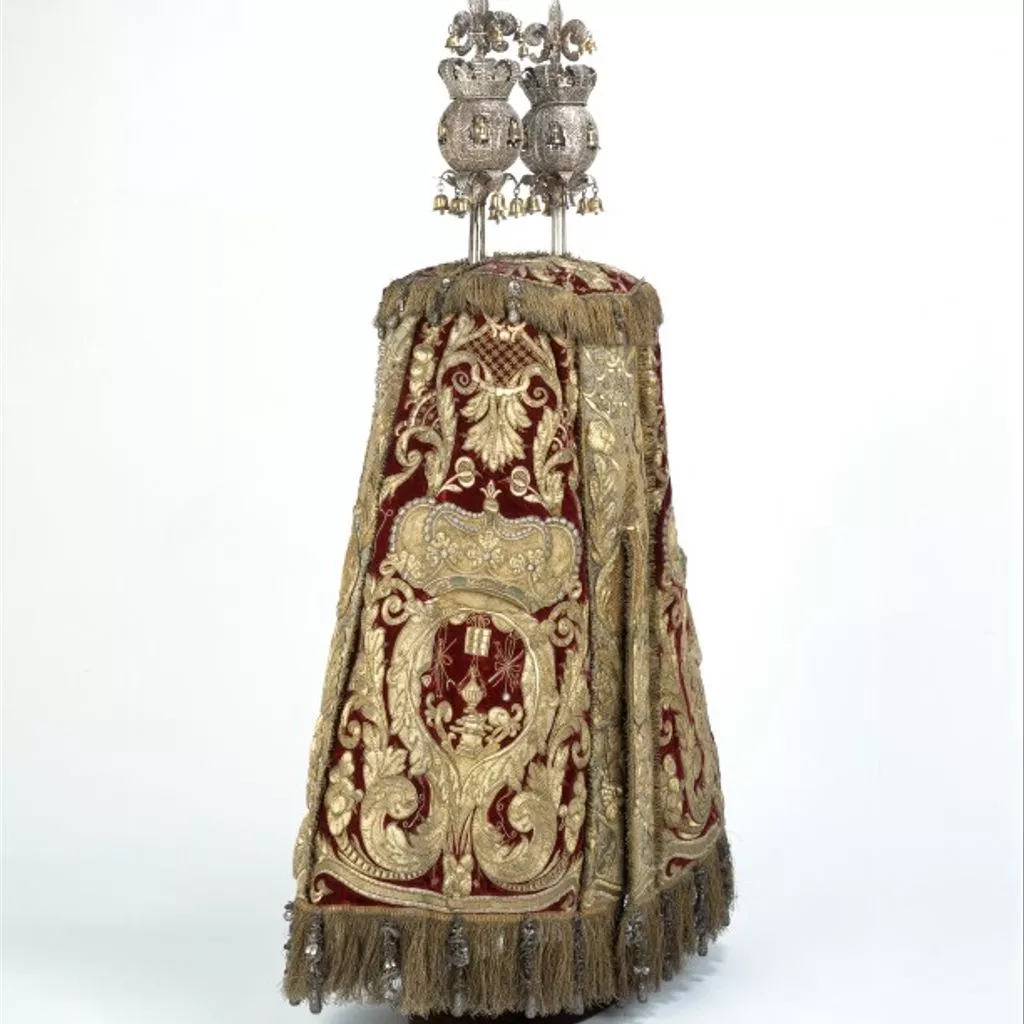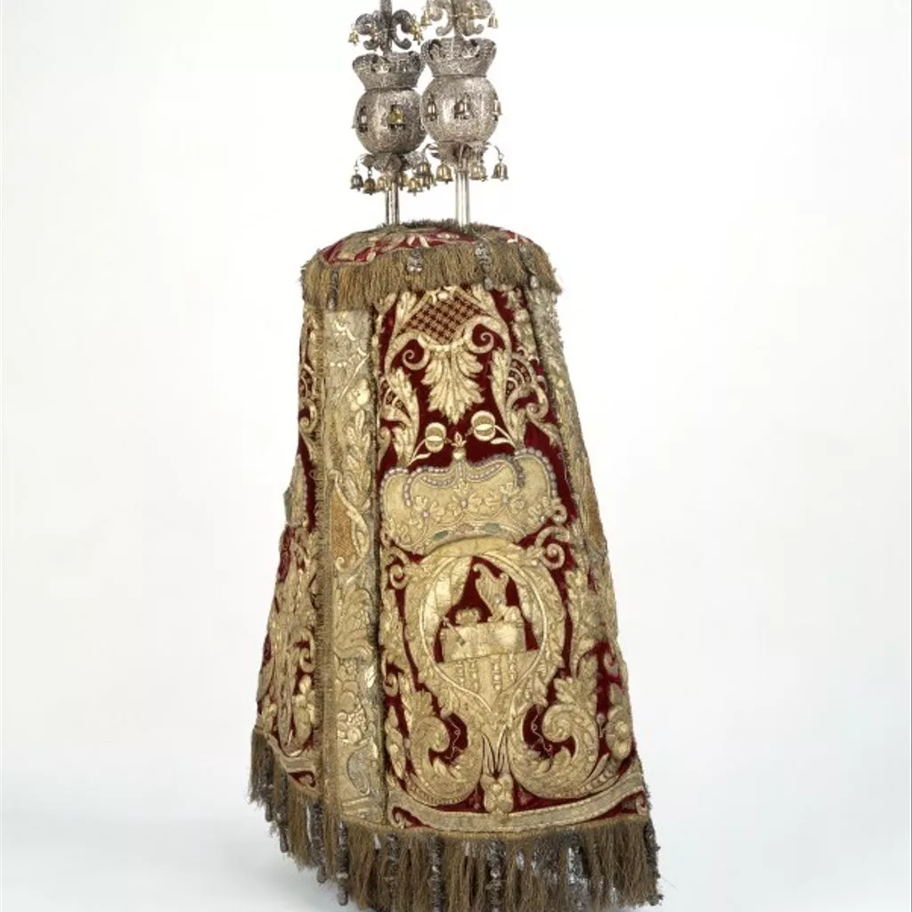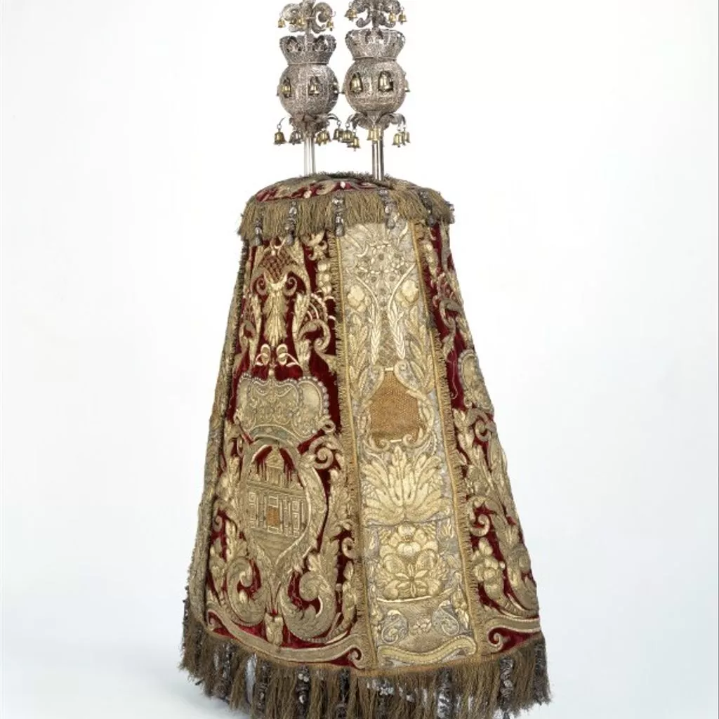 The mantle covers the Torah scroll, the most sacred object in the Jewish faith. It sits within the Holy Ark, which is the focal point of the synagogue. This mantle was probably made for the Portuguese synagogue in Amsterdam, then the largest in Europe. The Holy Ark can be seen in the central medallion, surmounted by the Crown of the Law.