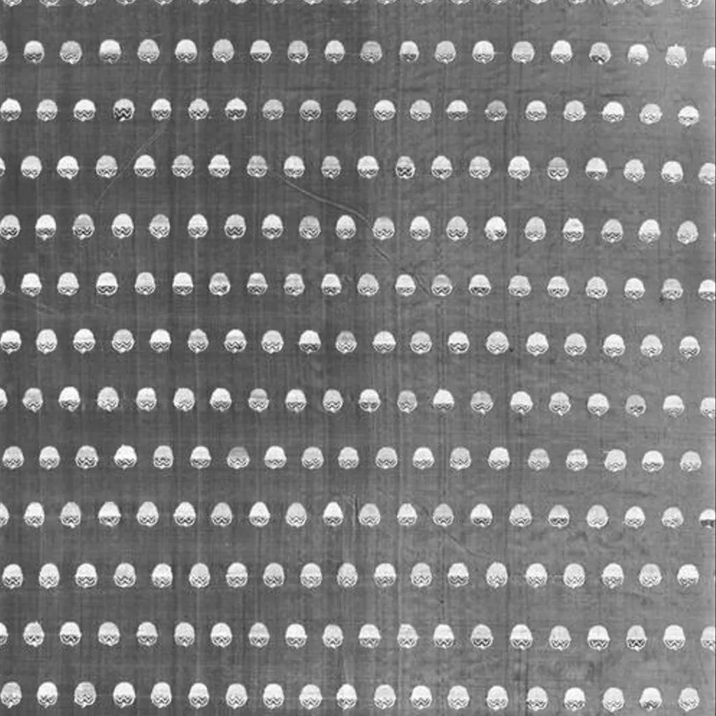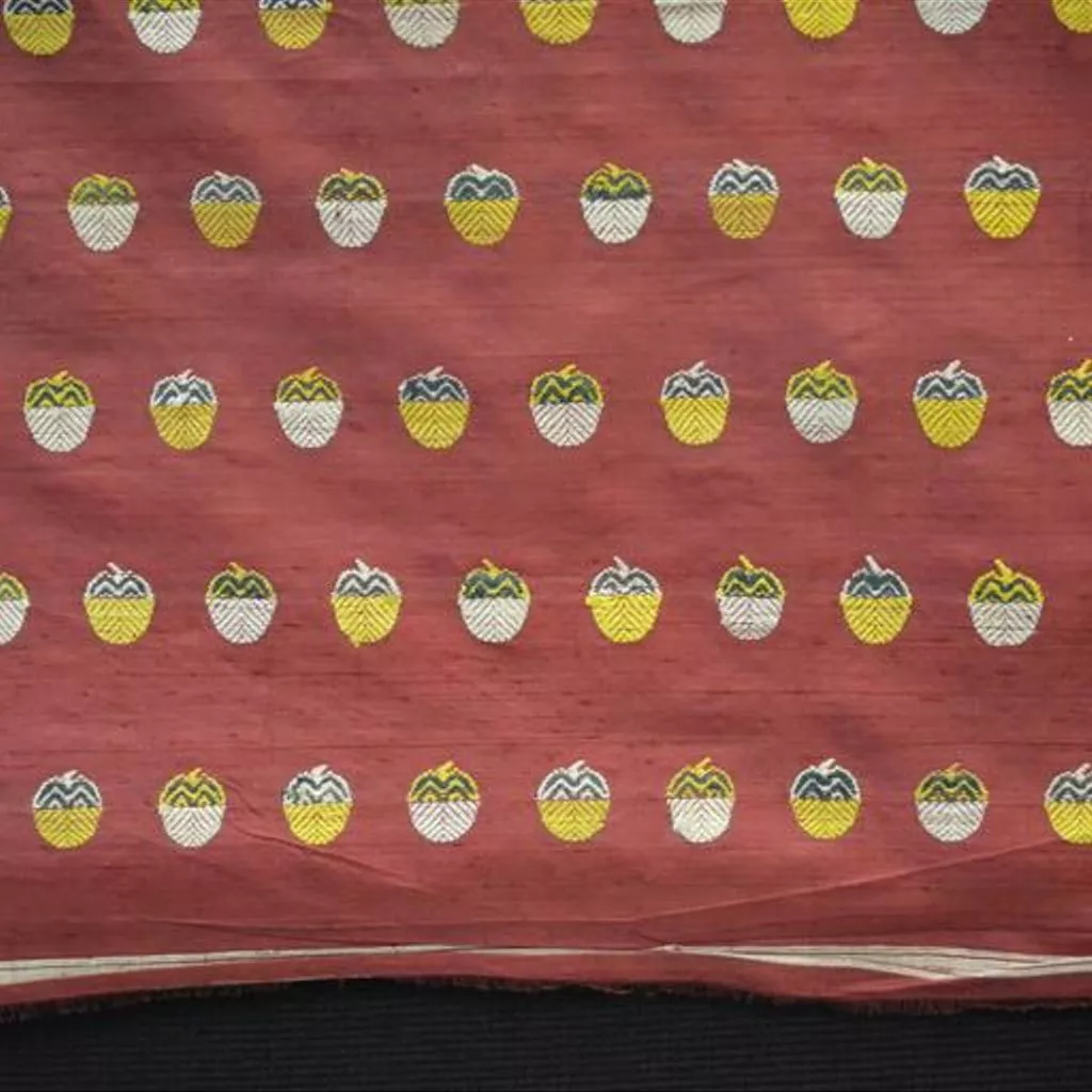 Intended for use as a garment, clothing. Textile, silk length, Murshidabad, Bengal, ca. 1855. Length of red silk with woven fruit motif in yellow, green and white silk. Pieces removed from one end.