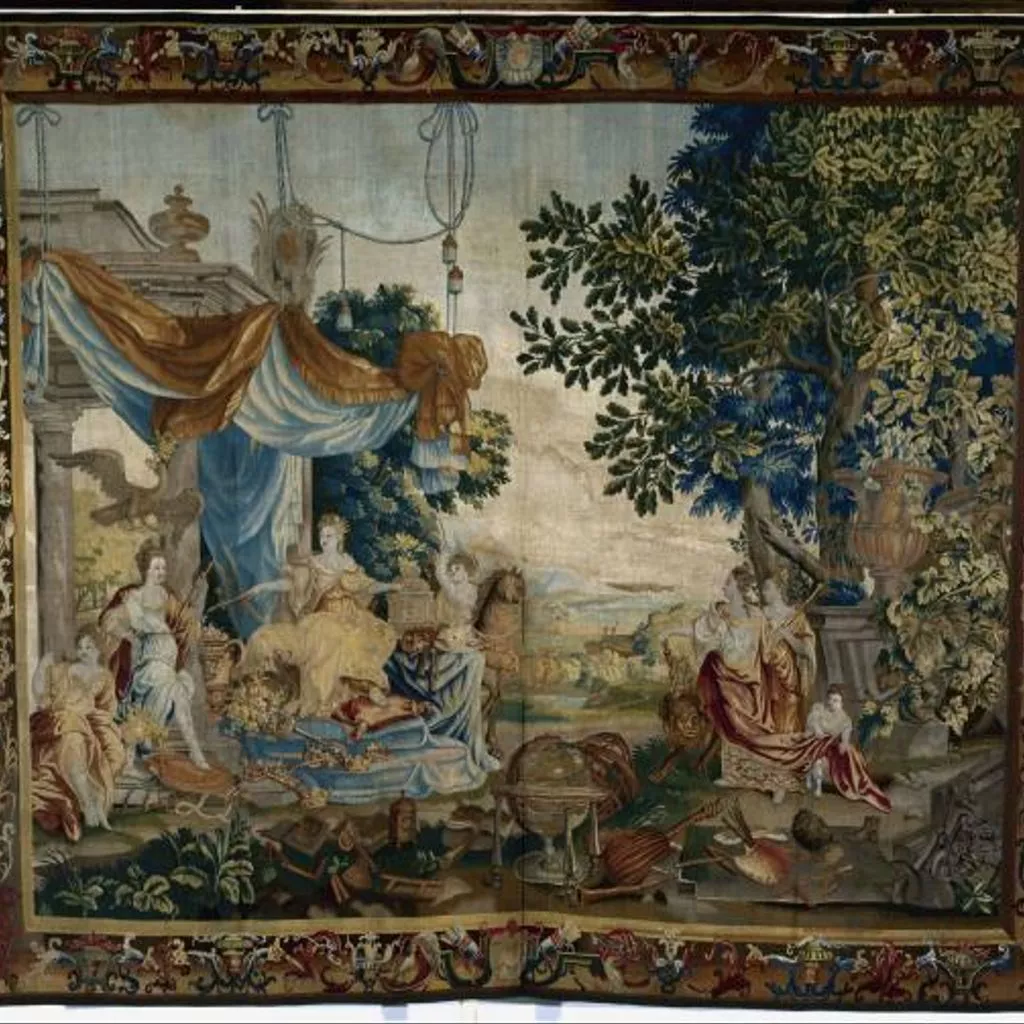 Un édicule à l'antique enveloppé de draperies sur la gauche, un vase sur socle devant un chêne sur la droite ; l'Europe trônant entre deux femmes à gauche - dont l'une survolée par un aigle tenant un rameau et foulant des armes et des couronnes - et un amour à cheval sur la droite ; deux femmes à droite de la composition dont l'une ayant à ses pieds un lion et un enfant tenant sa traîne ; toutes les femmes portent des sceptres ; au premier plan, attributs des sciences. Bordure : à rinceaux et palmettes enveloppant des balustres