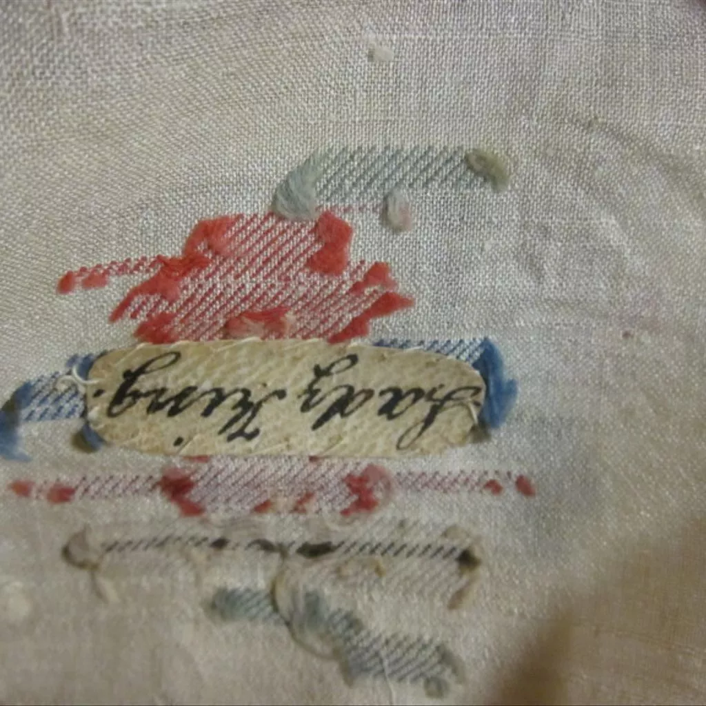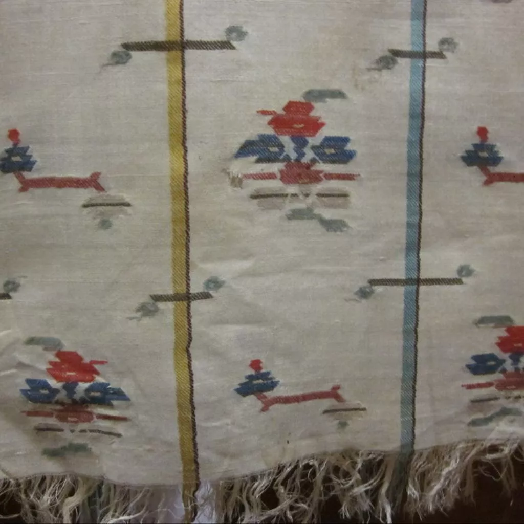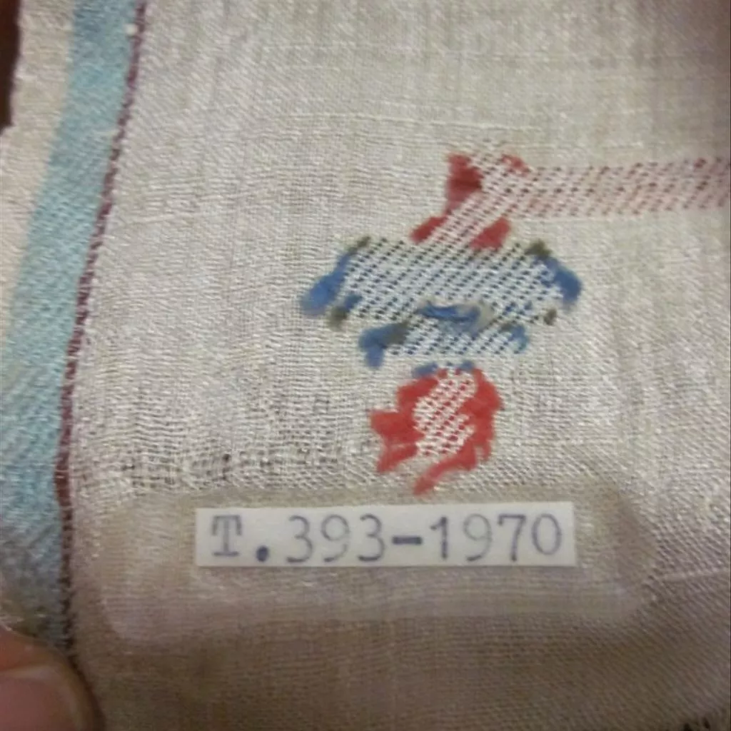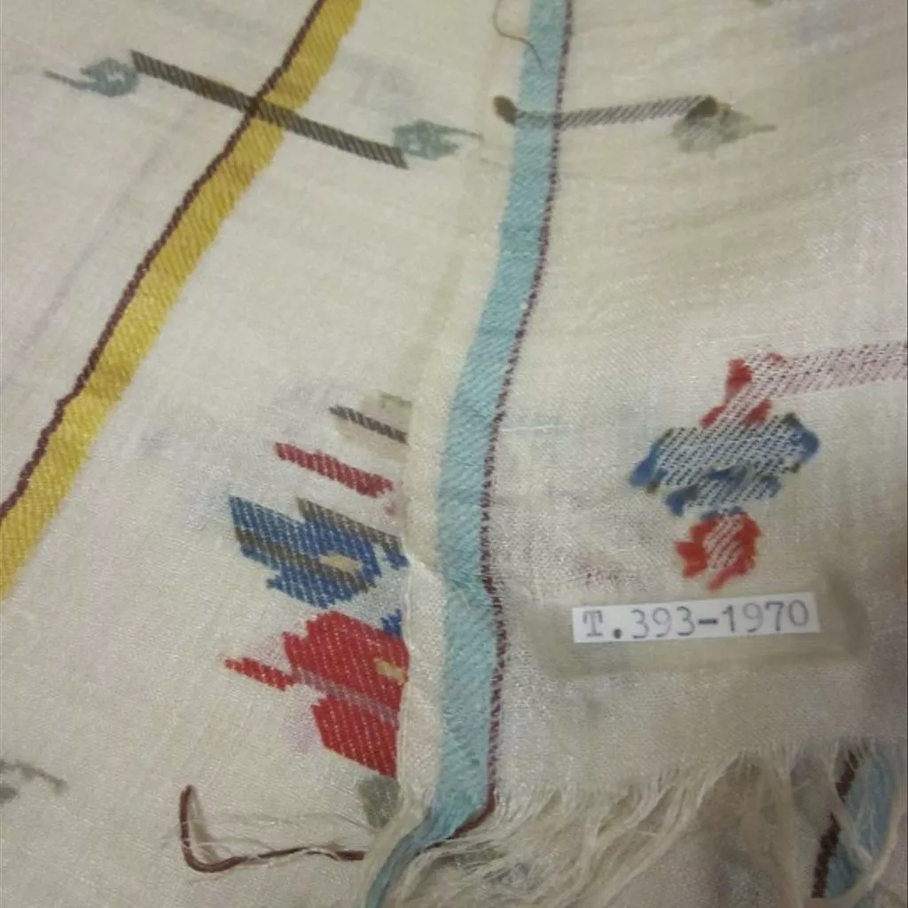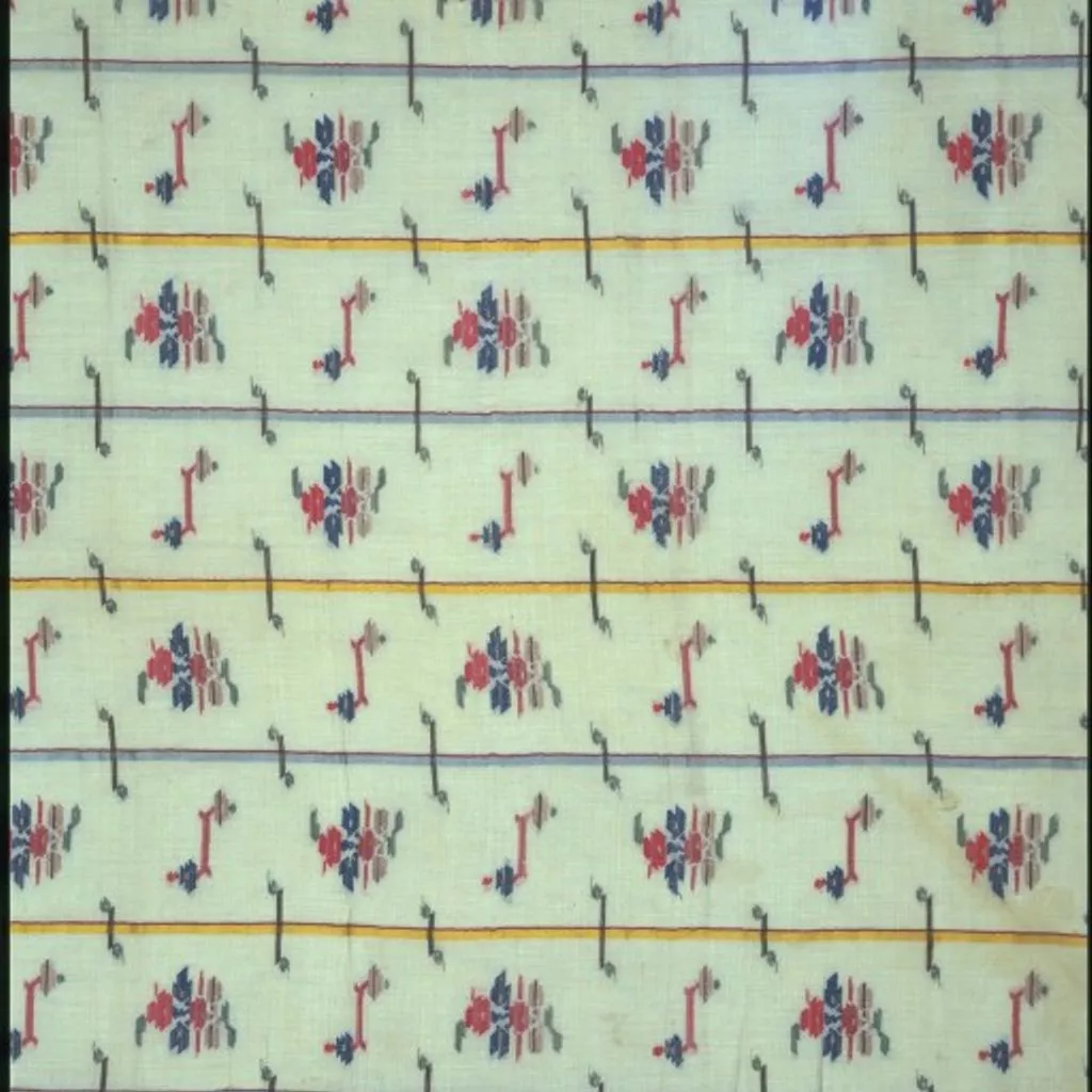 Shawl, possibly Paisley, ca. 1805-1815. Shawl with silk warp and woolen weft, brocaded in cotton with narrow light blue and yellow silk stripes, alternating at four inch intervals. The shawl has a white ground and the brocaded pattern of stylised sprigs in blue, red, deep pink, buff, celadon and olive green. These are repeated throughout the shawl. There is no separate pattern for the border. The ground is woven in tabby, the warp stripes are bound in 2\1 twill and the brocaded sprigs in 3\1 weft faced twill.