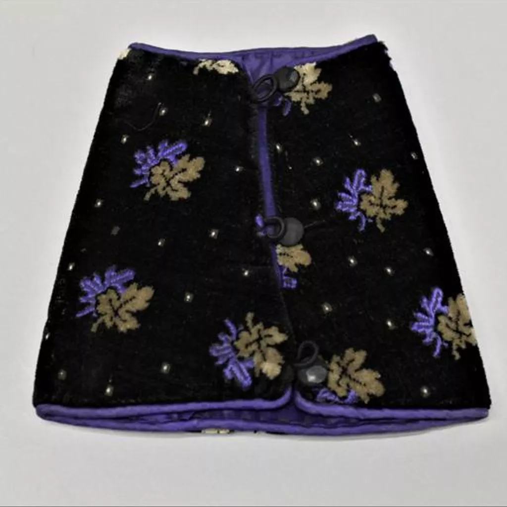 Black velvet cuff printed with purple and beige leaf sprig. Slightly padded, with a deep purple silk lining. Three black silk covered buttons and elastic loops. Printed velvet dress cuff lined with silk, Great Britain, ca. 1870