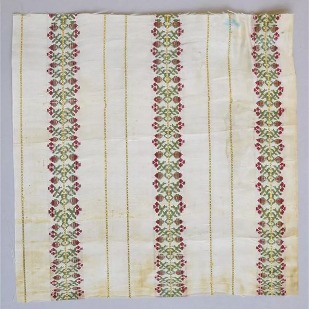 Dress fabric of woven silk, Turkey, ca. 1870. Dress fabric of white silk ground figured with two narrow vertical stripes in yellow and black silk. Between the stripes there are panels of red and green silk in geometric pattern, with a yellow and black stripe down the middle.