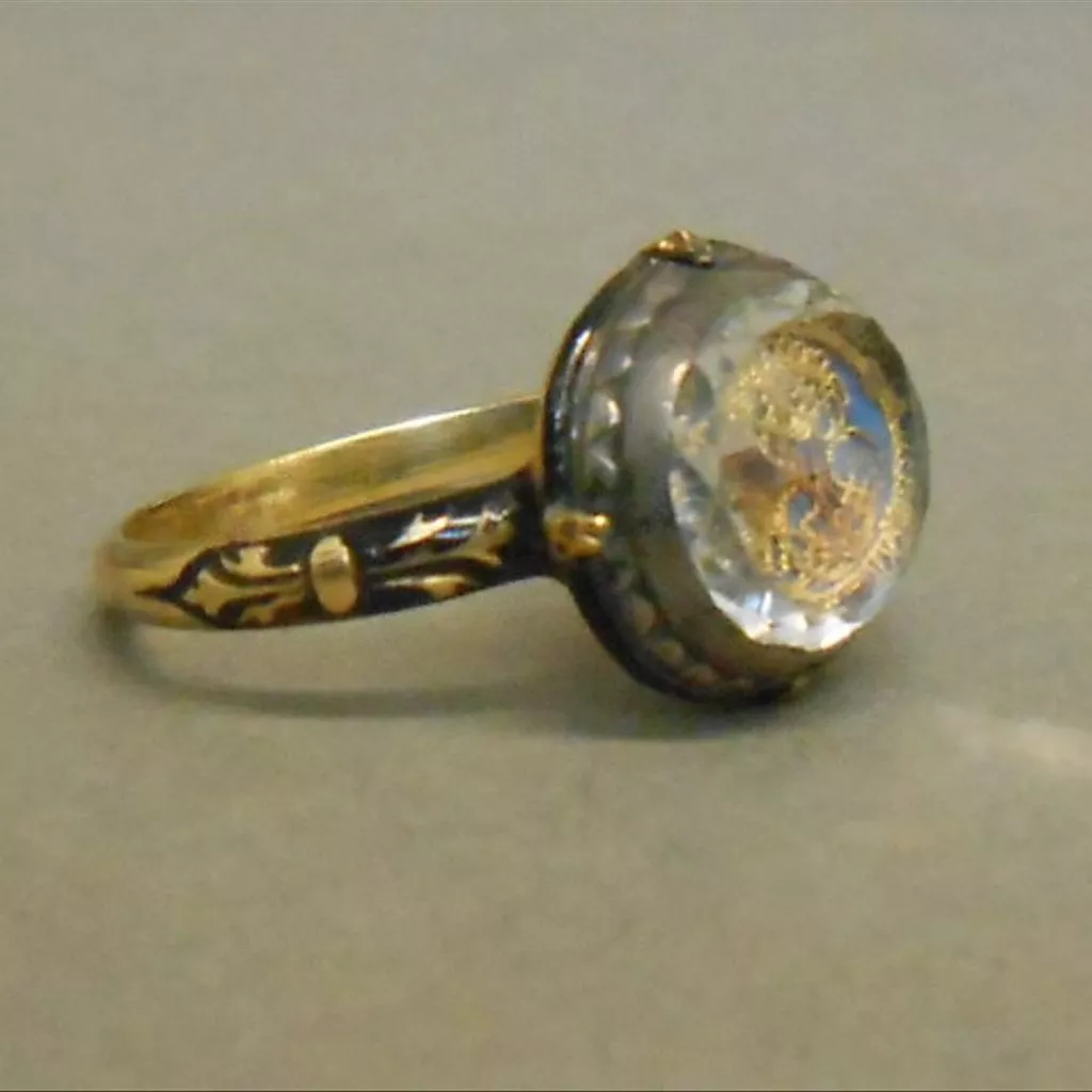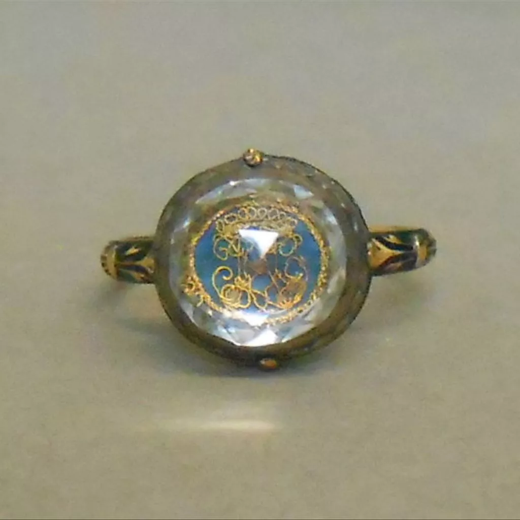 Enamelled gold mourning ring, the oval bezel set with a faceted crystal in a silver collet, enclosing a gold wire monogram on blue silk. Behind the initials IMS, with foliated shoulders, enamelled in black Enamelled gold mourning ring, the oval bezel set with a faceted crystal in a silver collet, enclosing a gold wire monogram on blue silk. Behind the initials IMS, with foliated shoulders, enamelled in black, England, early 18th century
