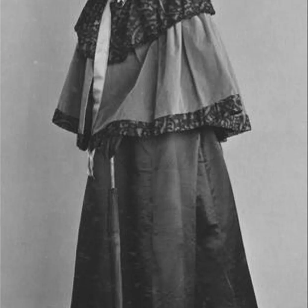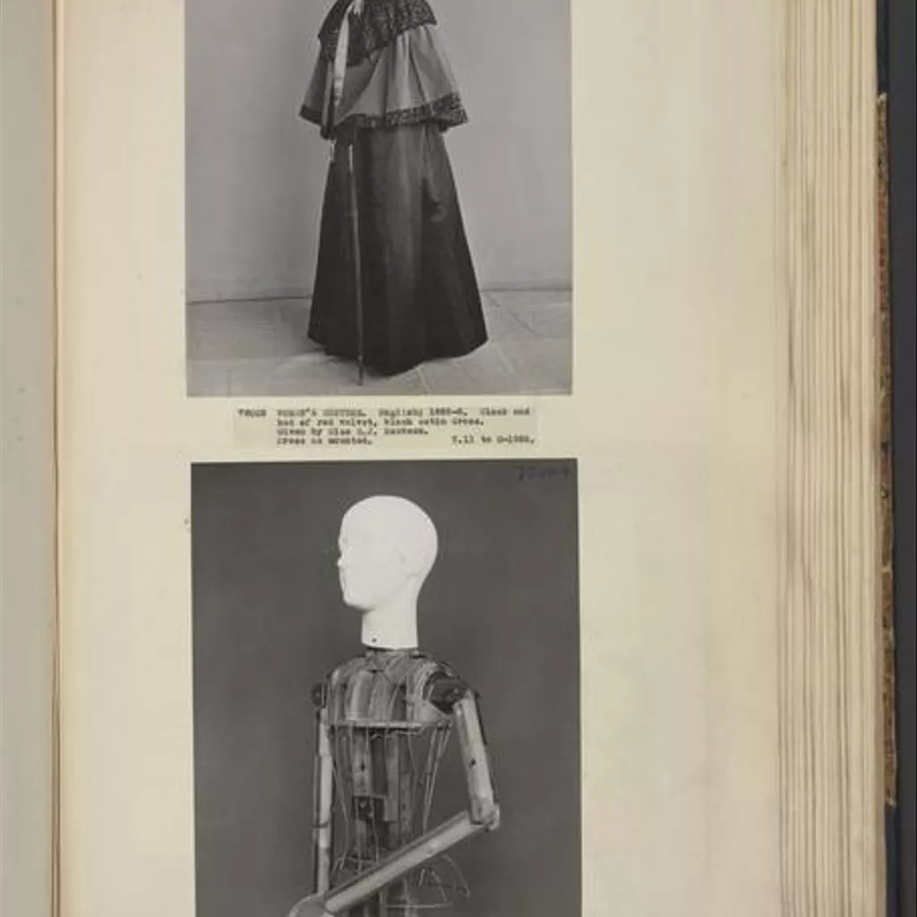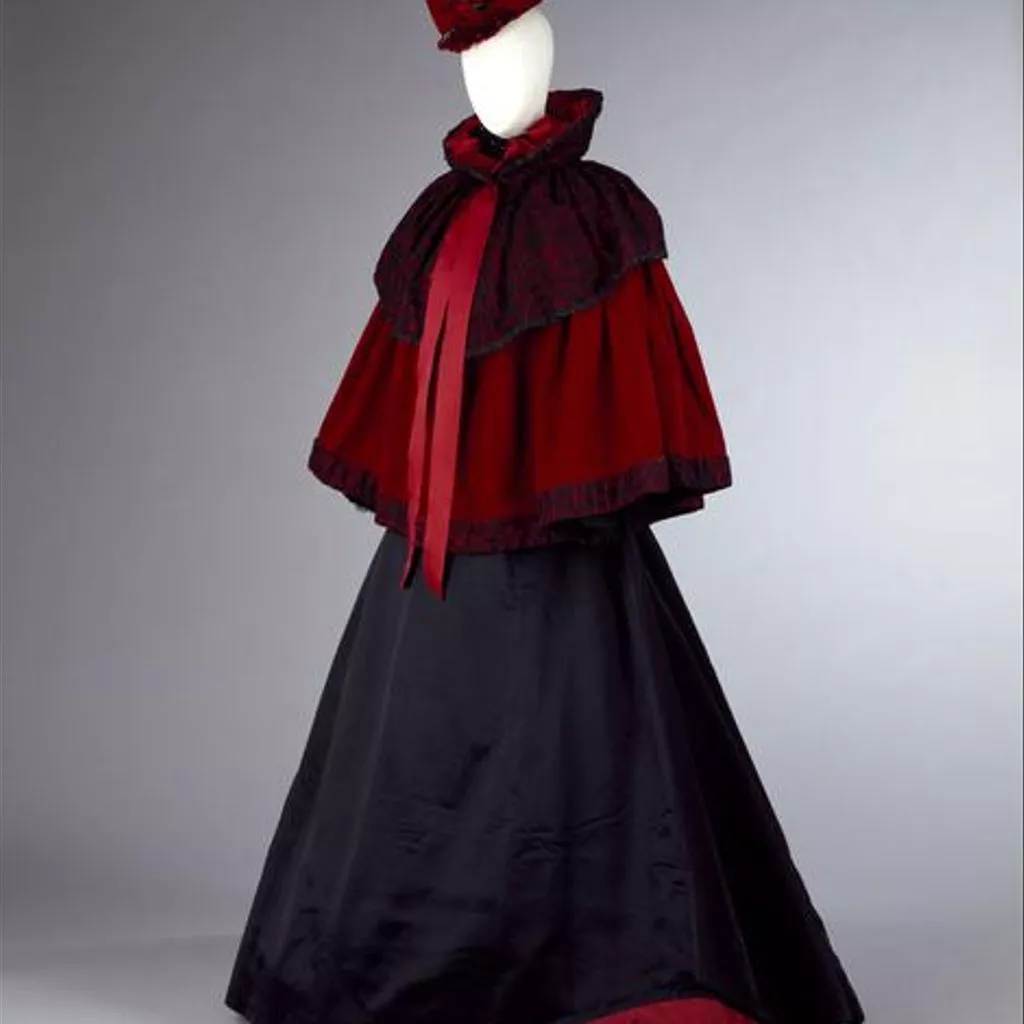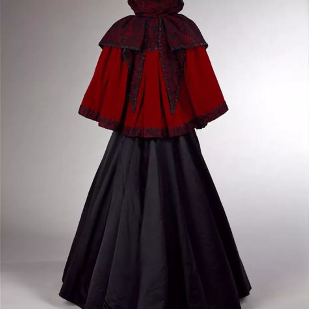 satin, 1896c, English; Black, chiffon and sequin trim satin, 1896c, English; Black, red lining Day dress. Black silk satin trimmed with chiffon and sequins. The skirt lined with crimson silk taffeta.